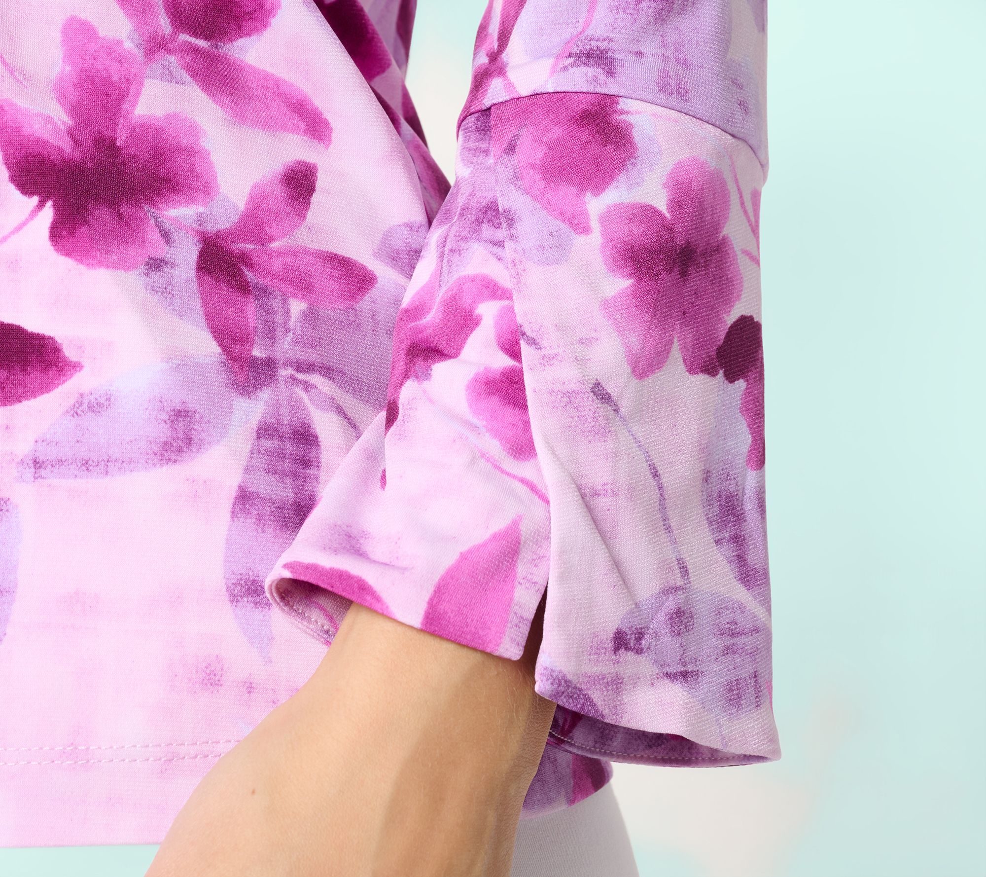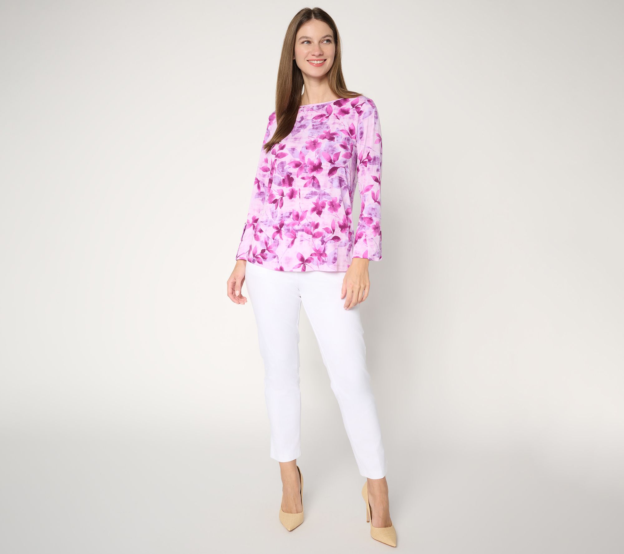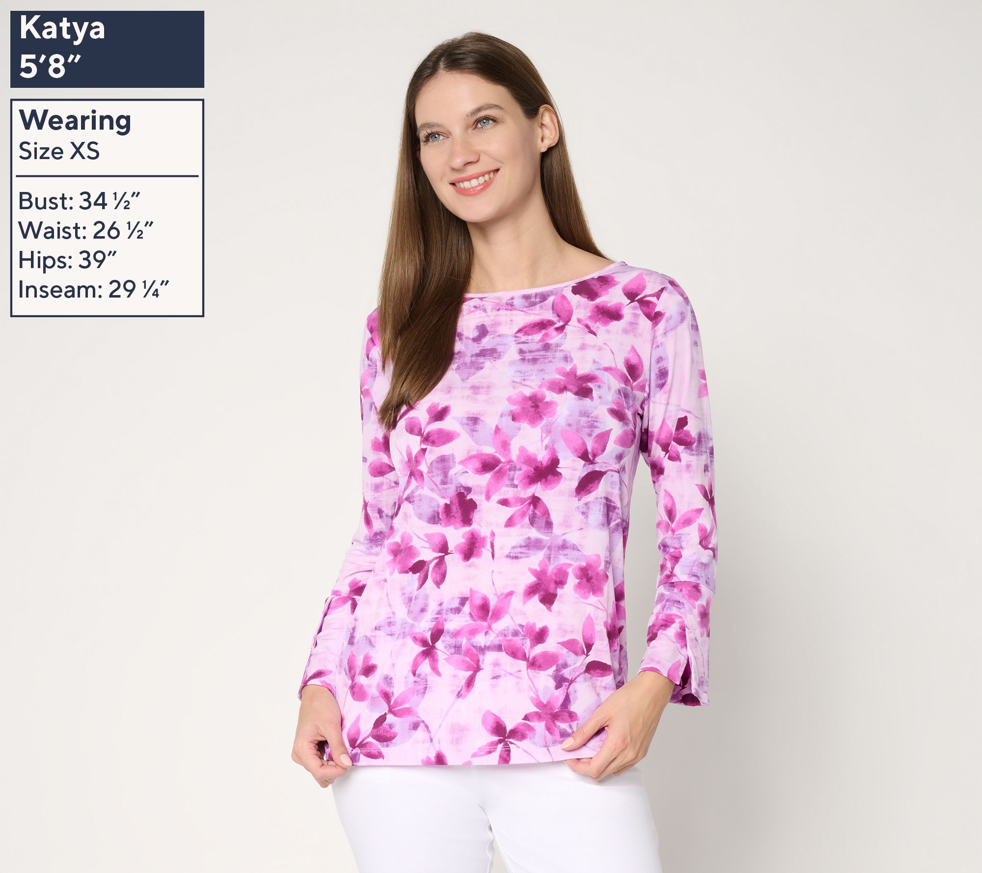 An artful print creates standout style on this Liquid Knit® top, ready to take you from work commutes to coffee catch-ups to afternoon plans in comfort. The bateau neckline and 3/4-length bell sleeves with chic cuff details flatter the silhouette, while easy pull-on styling means effortless pairing with jeans or tailored pants. From Susan Graver.