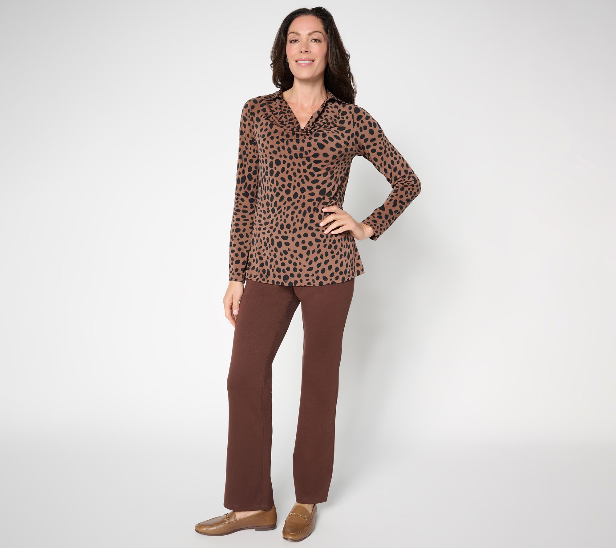 A collared cowl neck... how cute! Surrender to standout style with this boldly printed Liquid Knit® top that stylishly takes you from desk to dinner. The draped cowl neck has a small hidden weight underneath, so it always sits in the right position to impress. (So clever!) From Susan Graver.