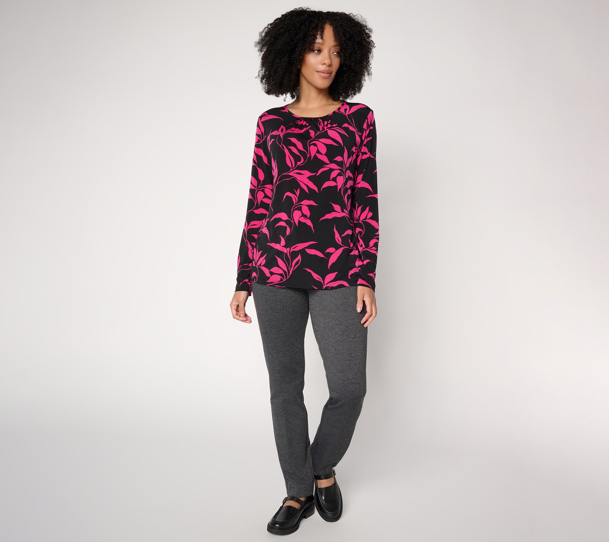 A splashy print on fluid Liquid Knit® makes this crewneck top a standout for brunch meetups or evening strolls alike. The long sleeves provide extra coverage, while shirring at the neckline adds a softly feminine detail to your everyday ensemble. Pair it with trousers or denim for effortless style in any setting. From Susan Graver.
