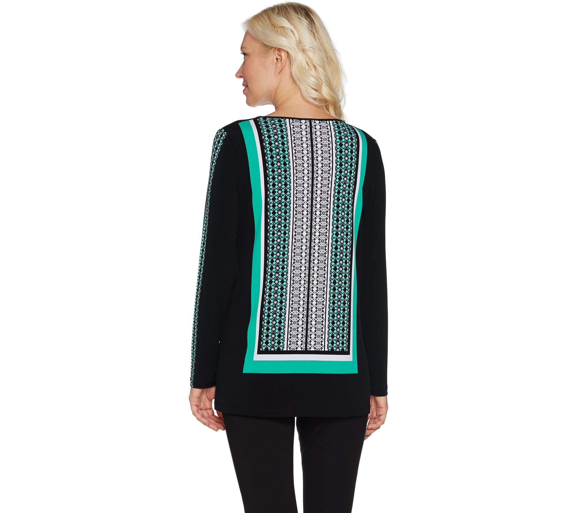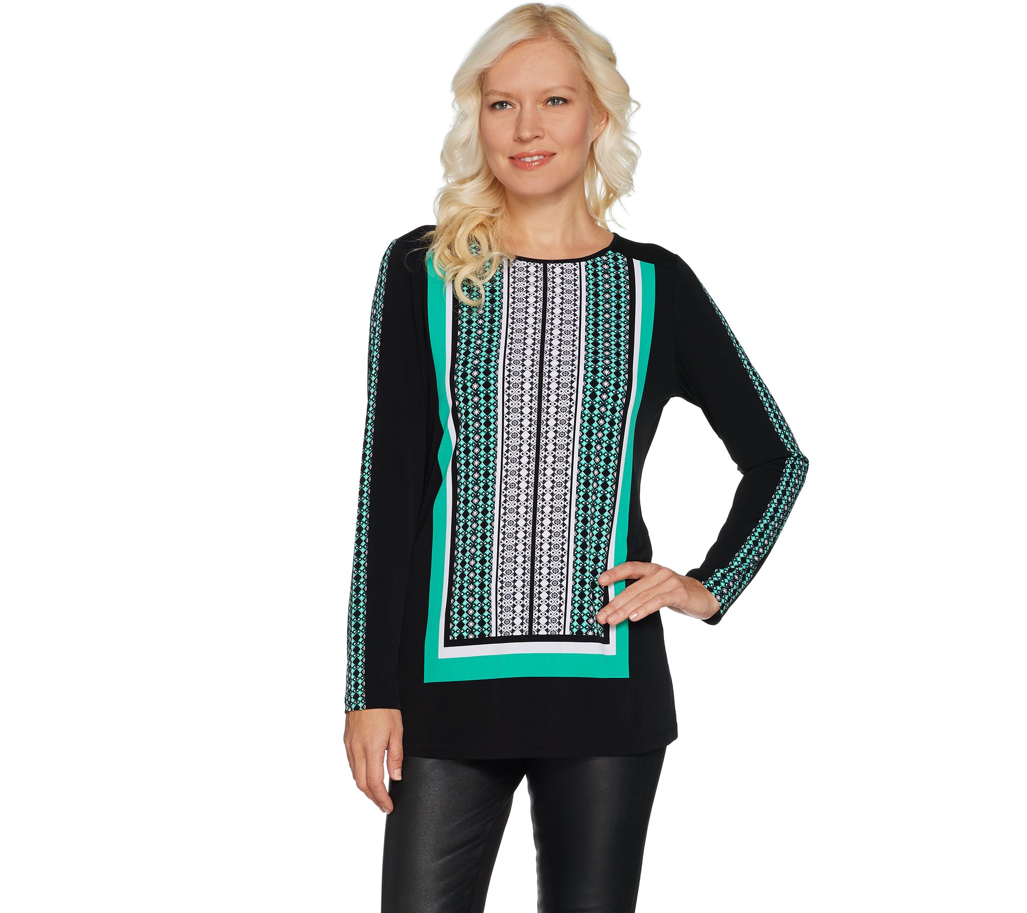 This Susan Graver long sleeve tunic has printed designs in all the right places. Liquid Knit fabric ensures it feels as good as it looks. From Susan Graver.