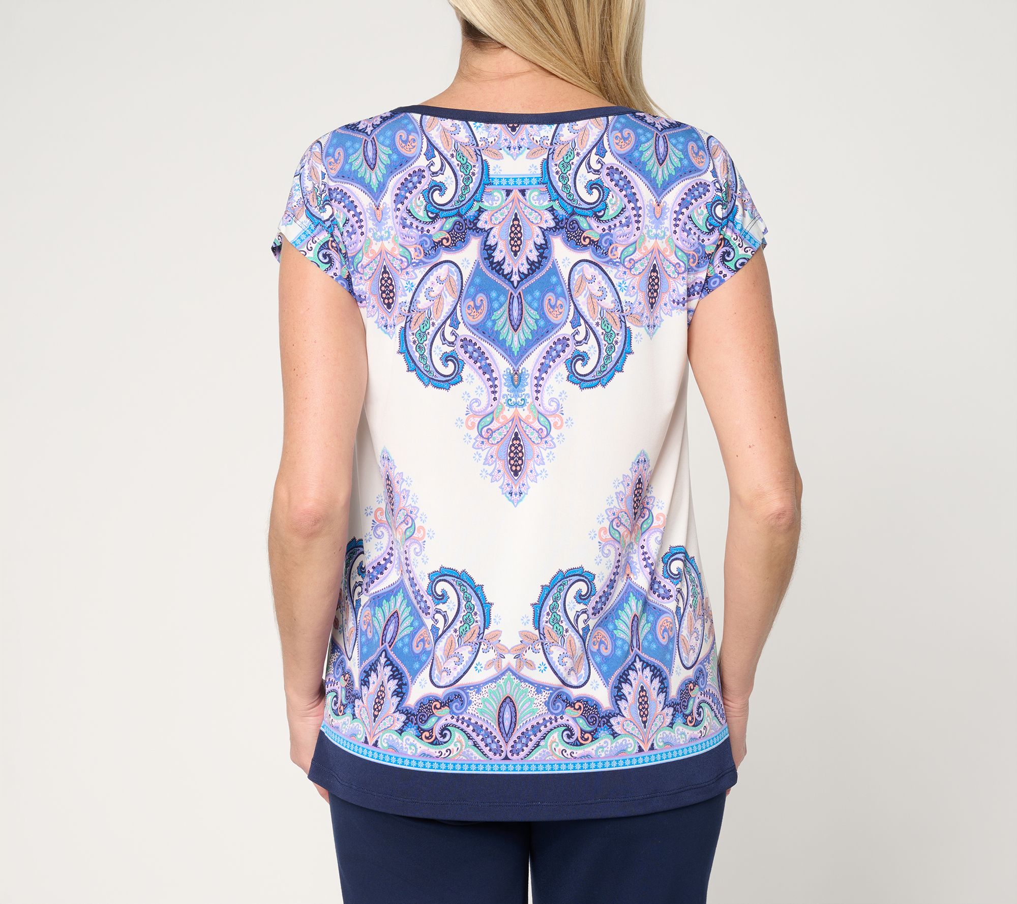 Spend afternoons browsing boutiques or meeting friends in this lively printed Liquid Knit® top. Its scoop neckline and extended sleeves feel easy yet polished, while the border print placement brightens up everything from jeans to capris. From Susan Graver.