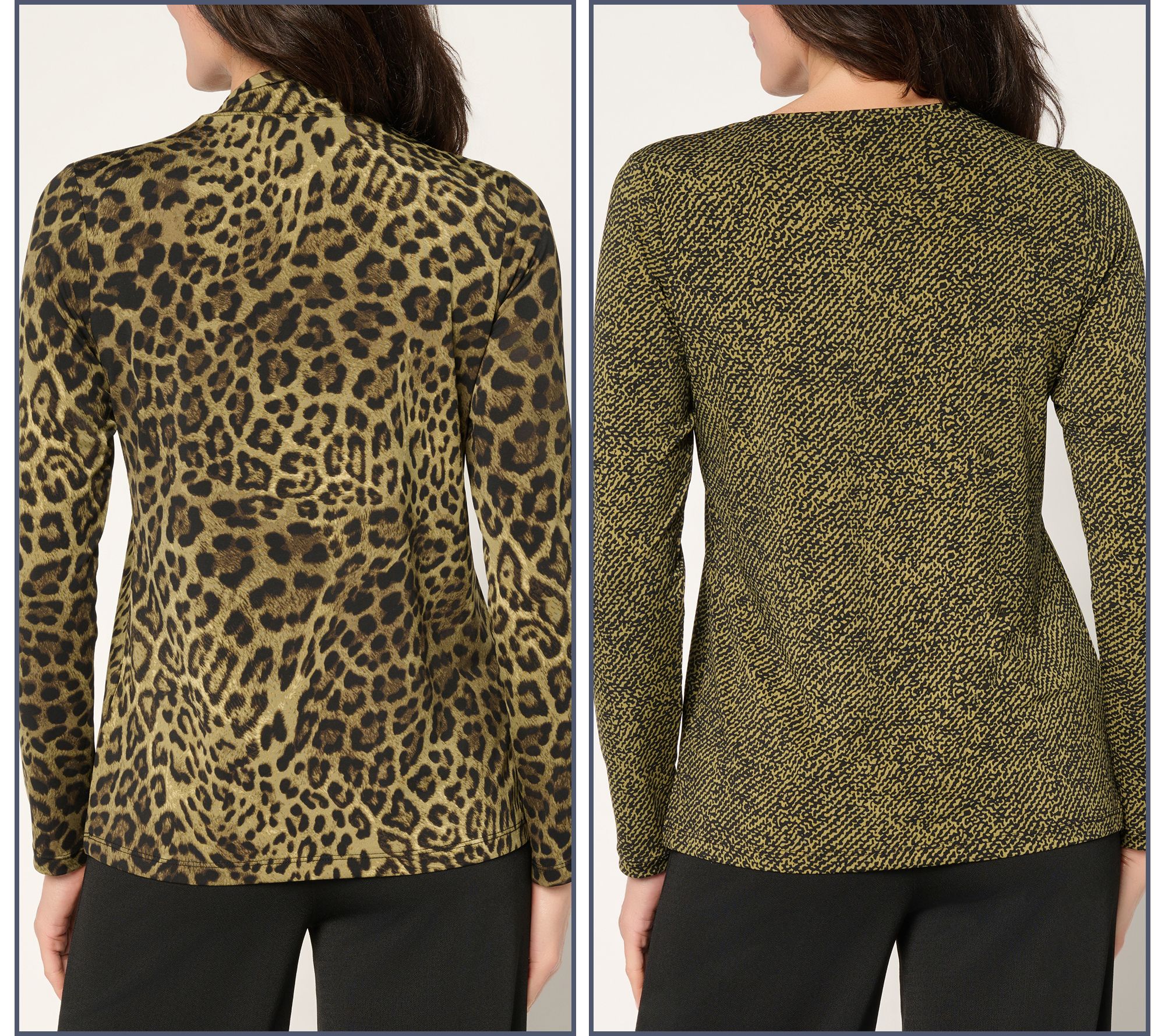 Building your fall/winter capsule collection? Be sure to include this set of two printed tops from Susan Graver. Crafted in luscious, drapey Liquid Knit®, they'll double your OOTD options with a scoop neck and a mock neck style, perfect for layering under cardis, blazers, or simply styling all on their own. From Susan Graver.
