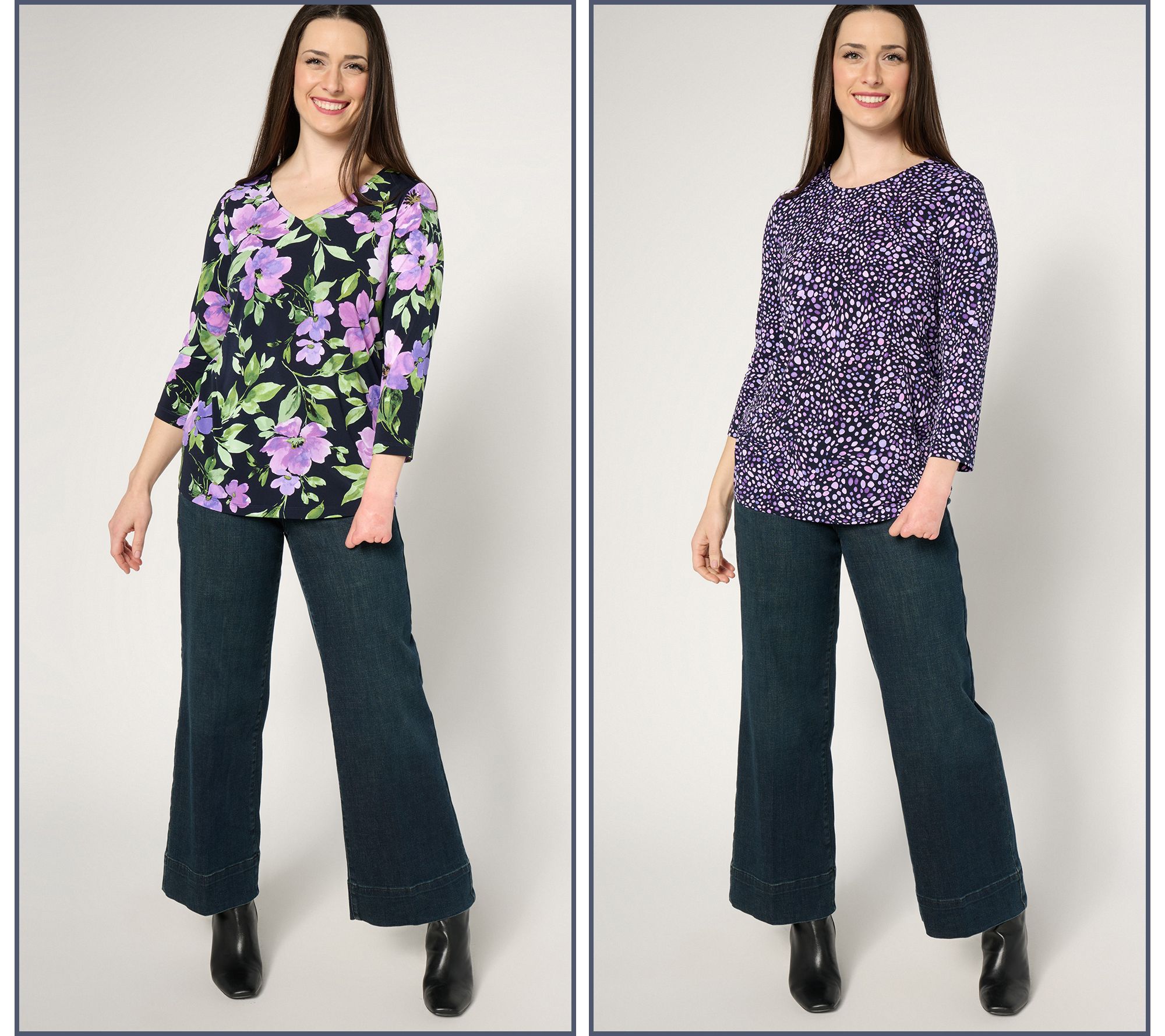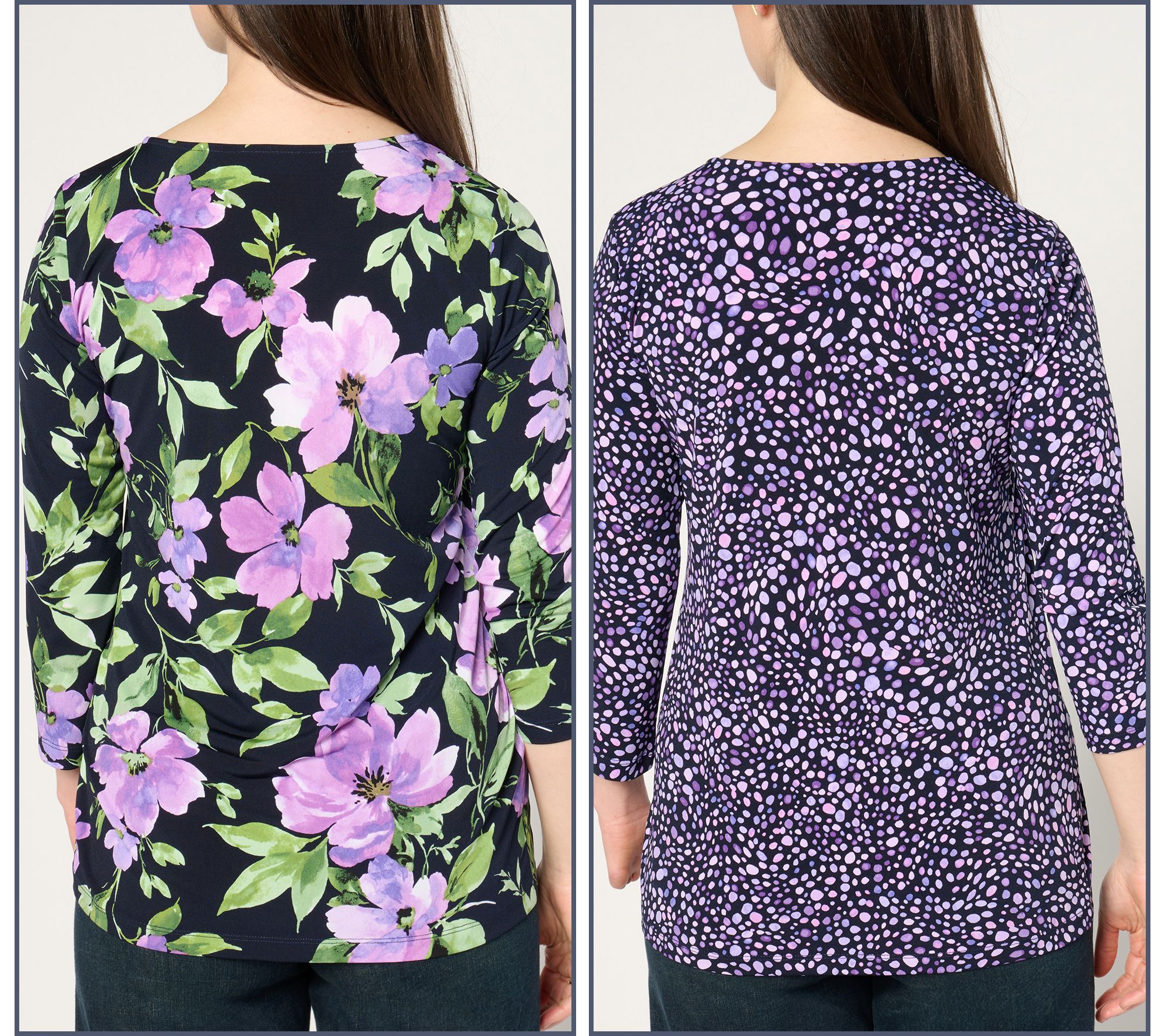 Take two! A set of easy-wear/easy-care tops in always-flattering Liquid Knit® are even better in spring-forward prints. From Susan Graver.