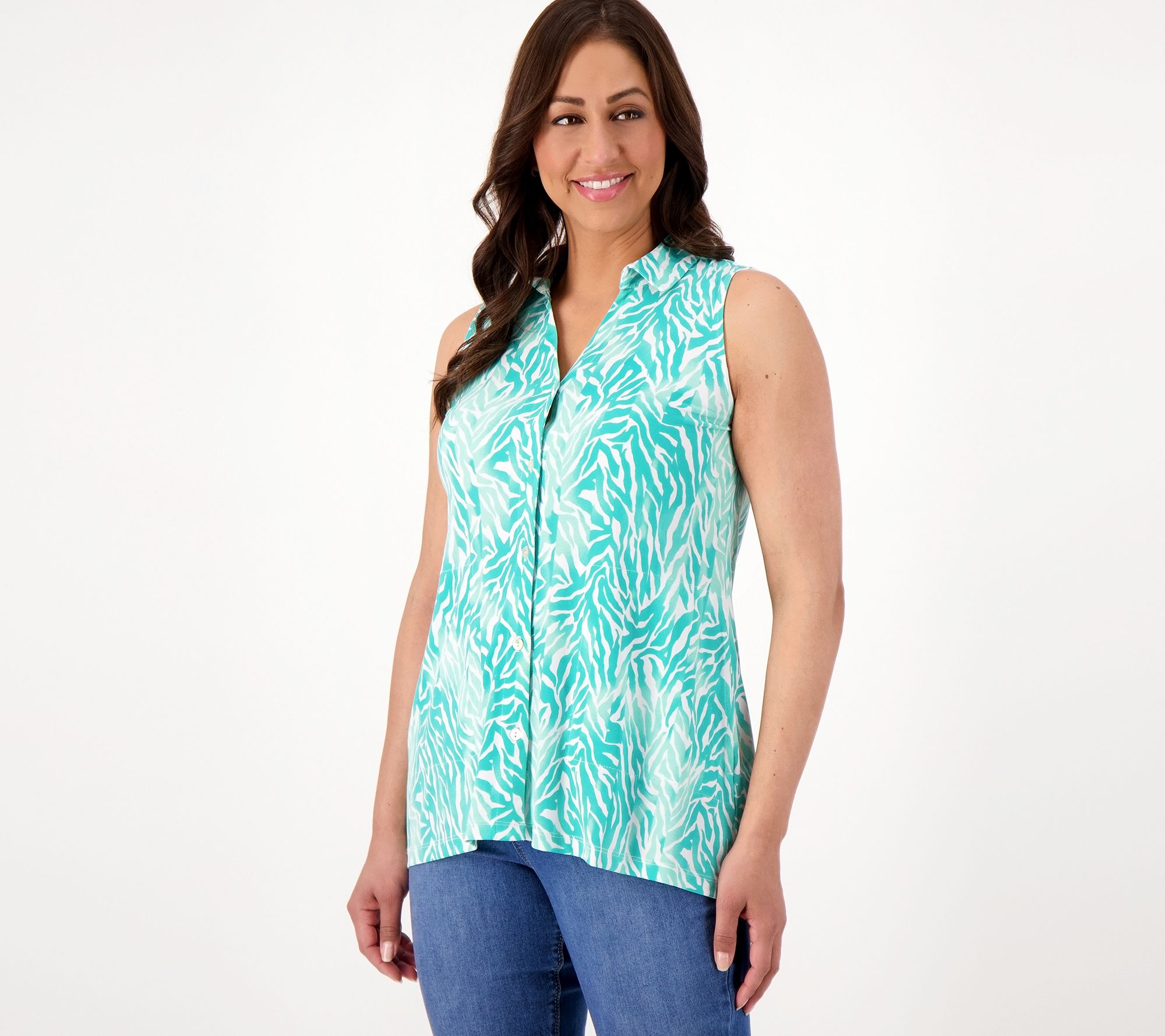 Susan Graver Printed Liquid Knit Sleeveless Button-Front Petite Tunic
