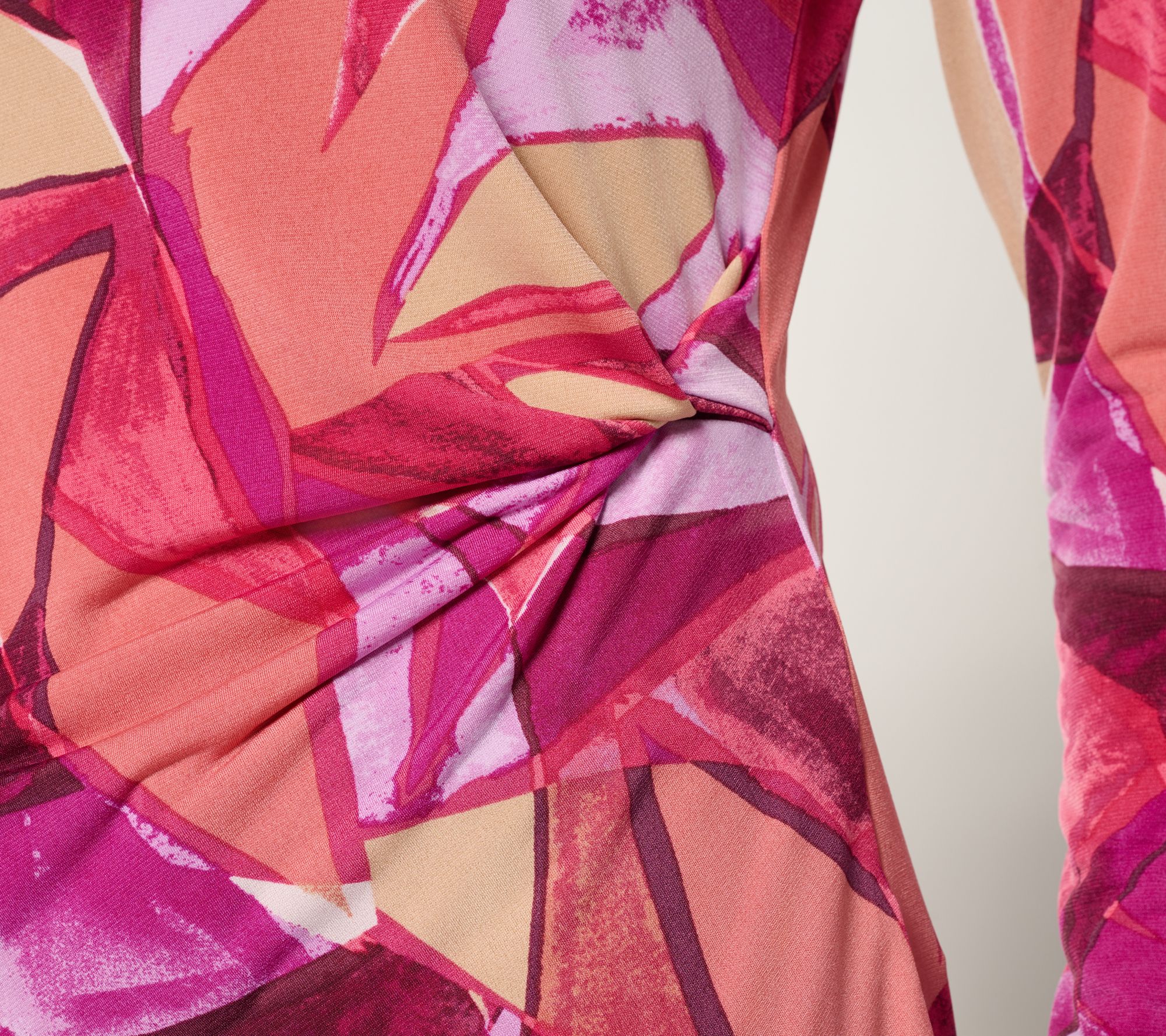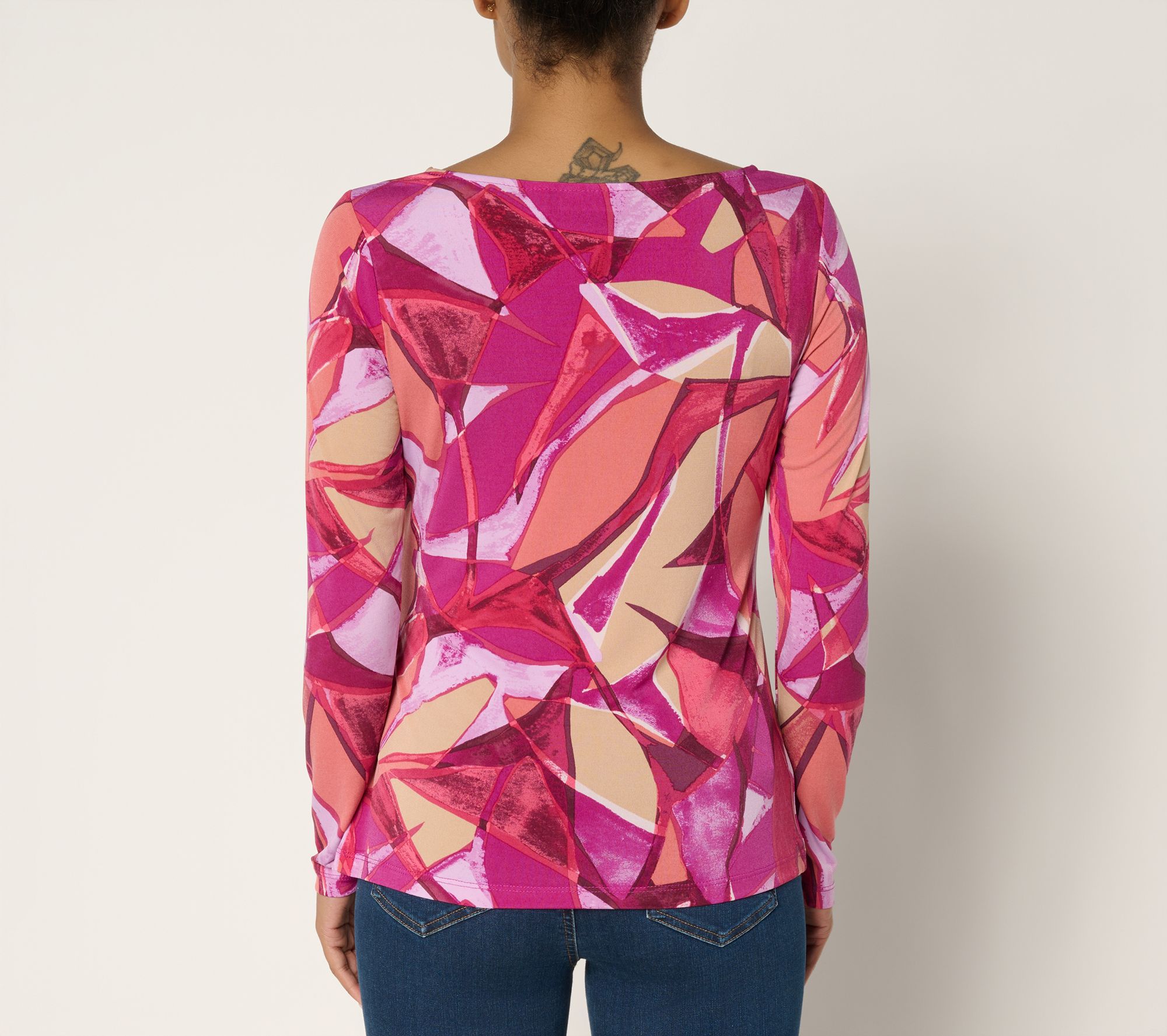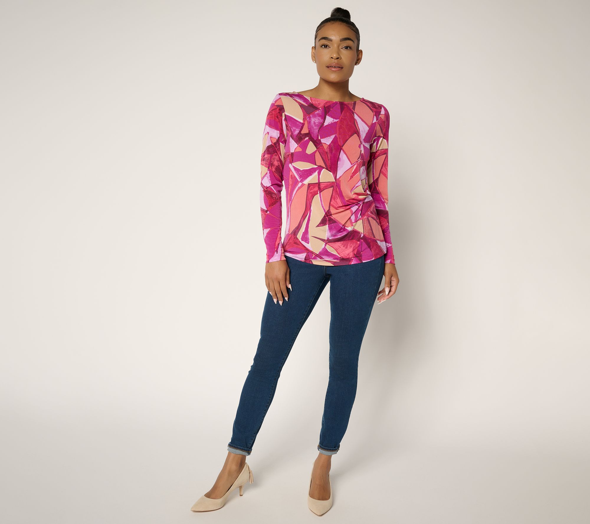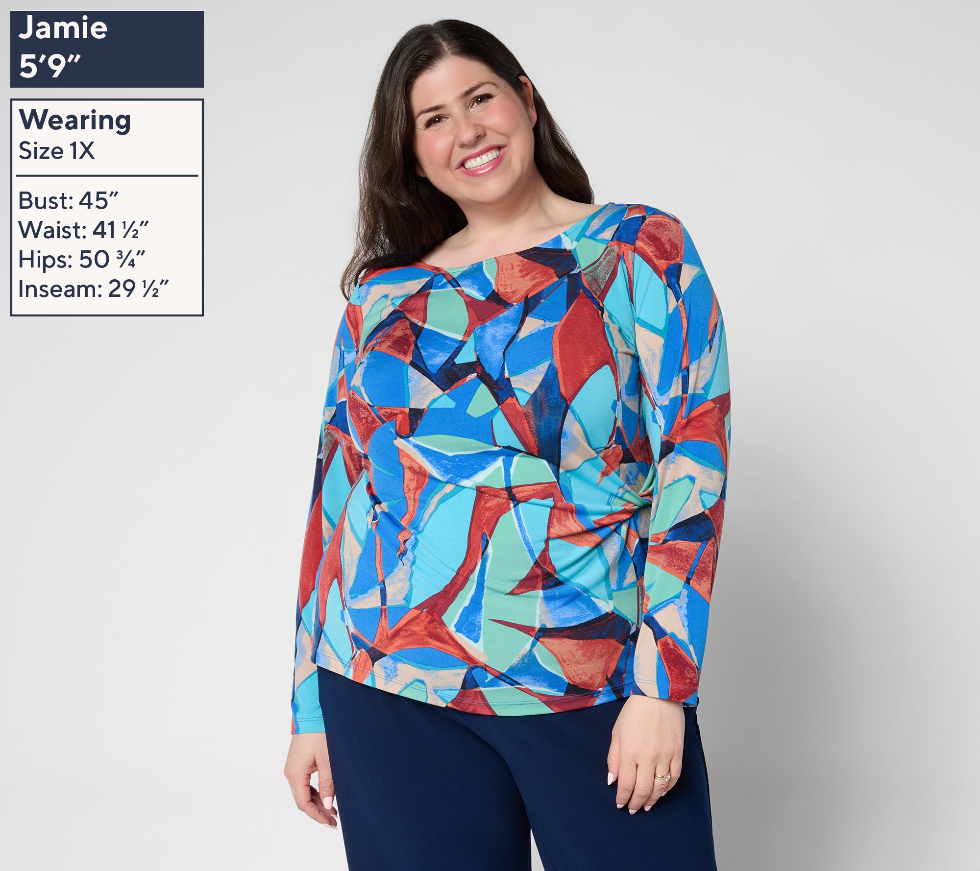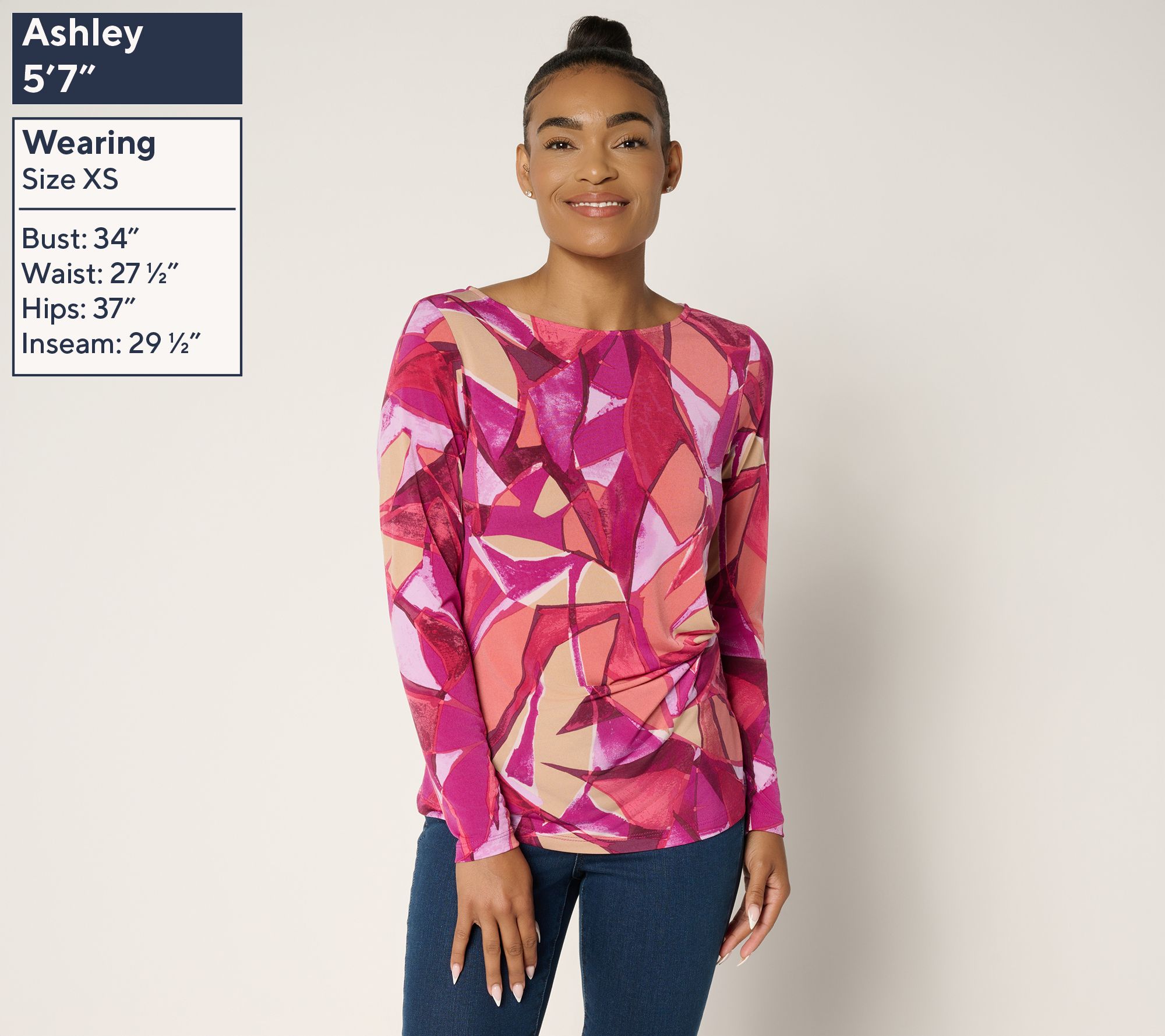 Effortless style arrives with this long-sleeve Liquid Knit® top, highlighted by a modern twist detail on the side. With its bateau neckline and fitted silhouette, it's easy to pair and wear for any occasion, from coffee runs to dinner dates. A playful print and easy pullover design make it a year-round closet favorite. From Susan Graver.
