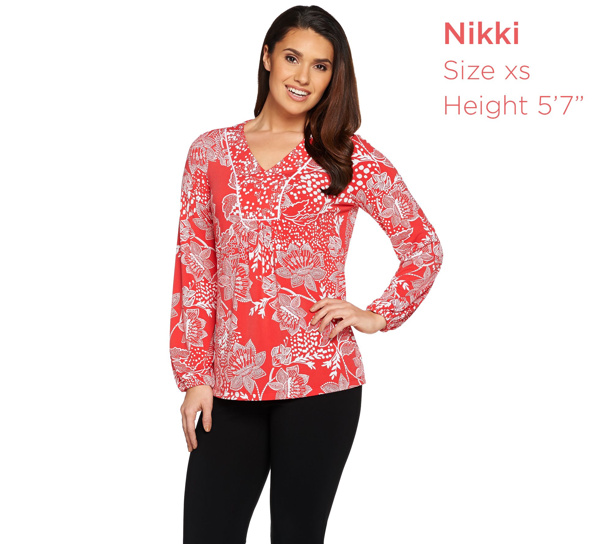 • Features: allover print, V-neckline, long sleeves, straight bottom hemline