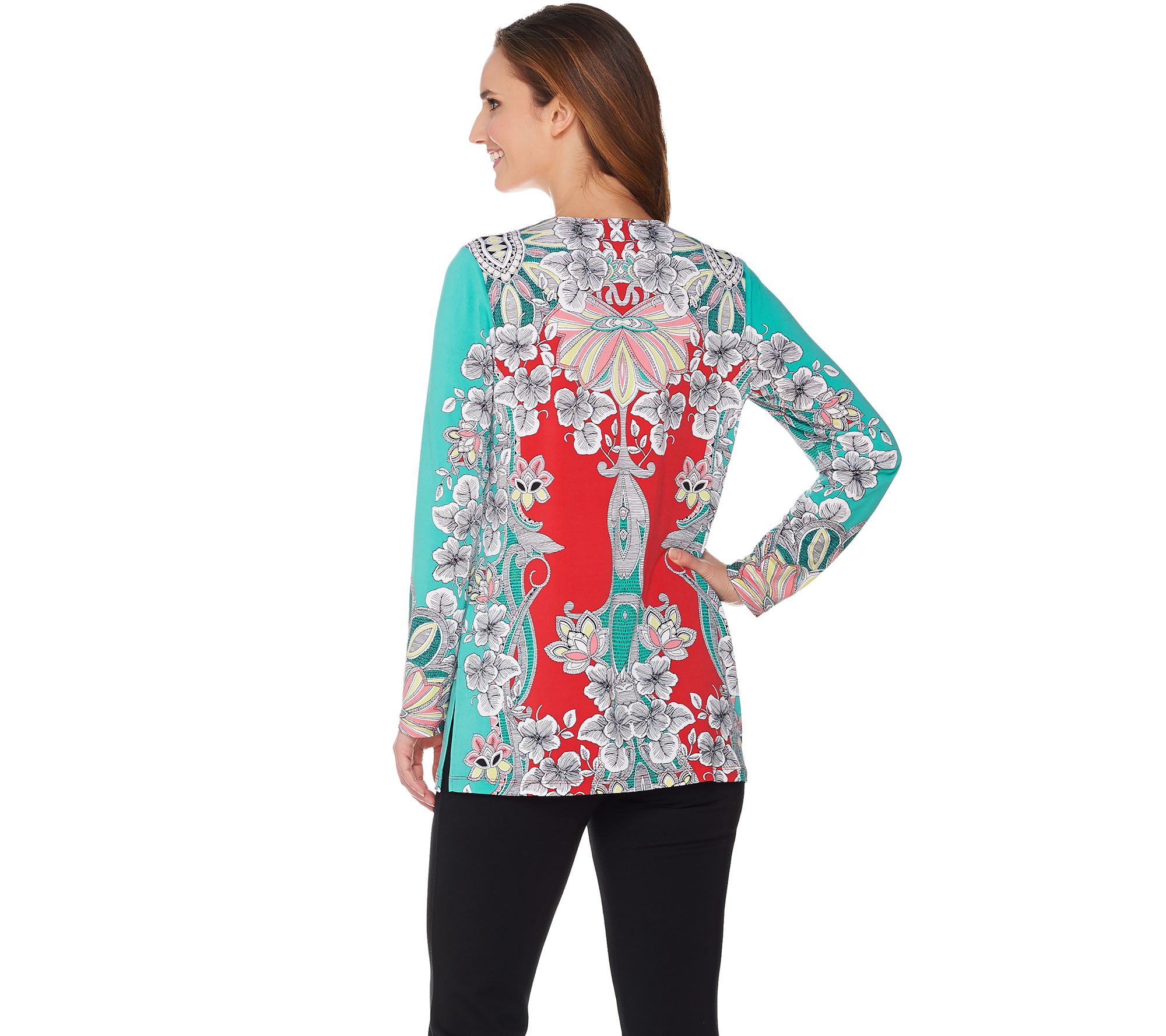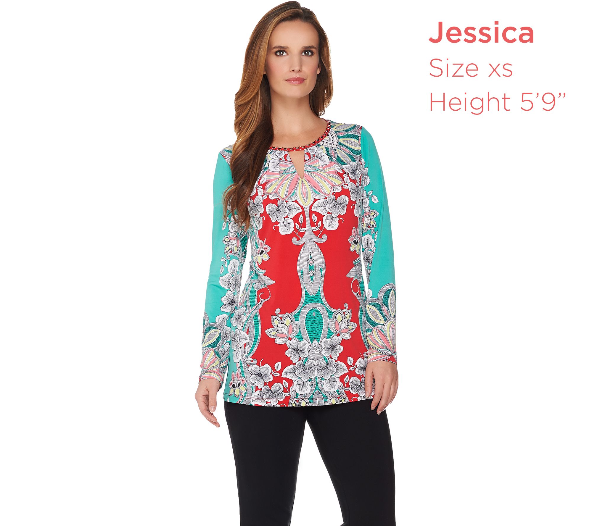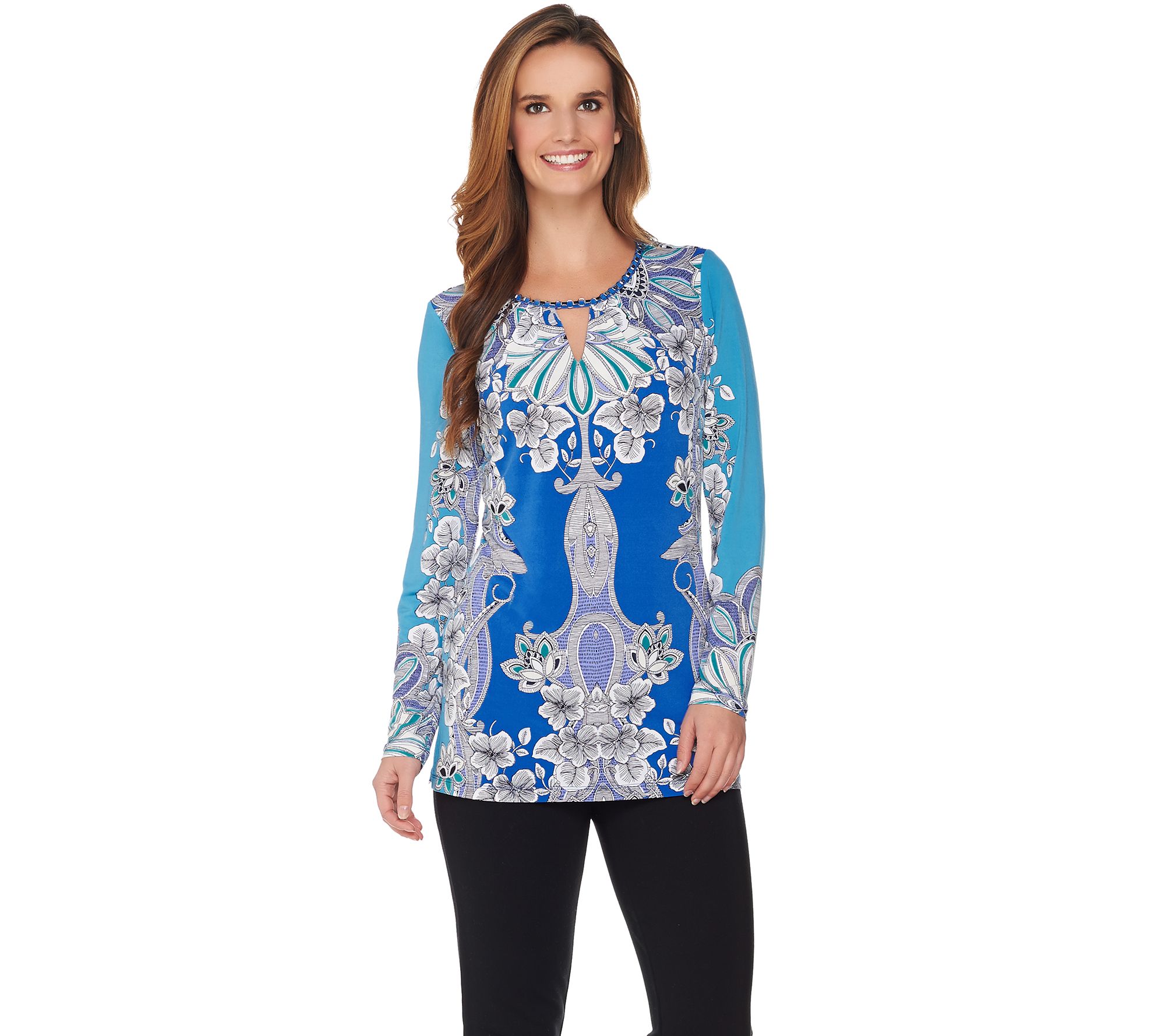 Love this top for its striking placement print and jewelry-like neckline, but turn to it month after month for its year-round Liquid Knit comfort and wearability. From Susan Graver.