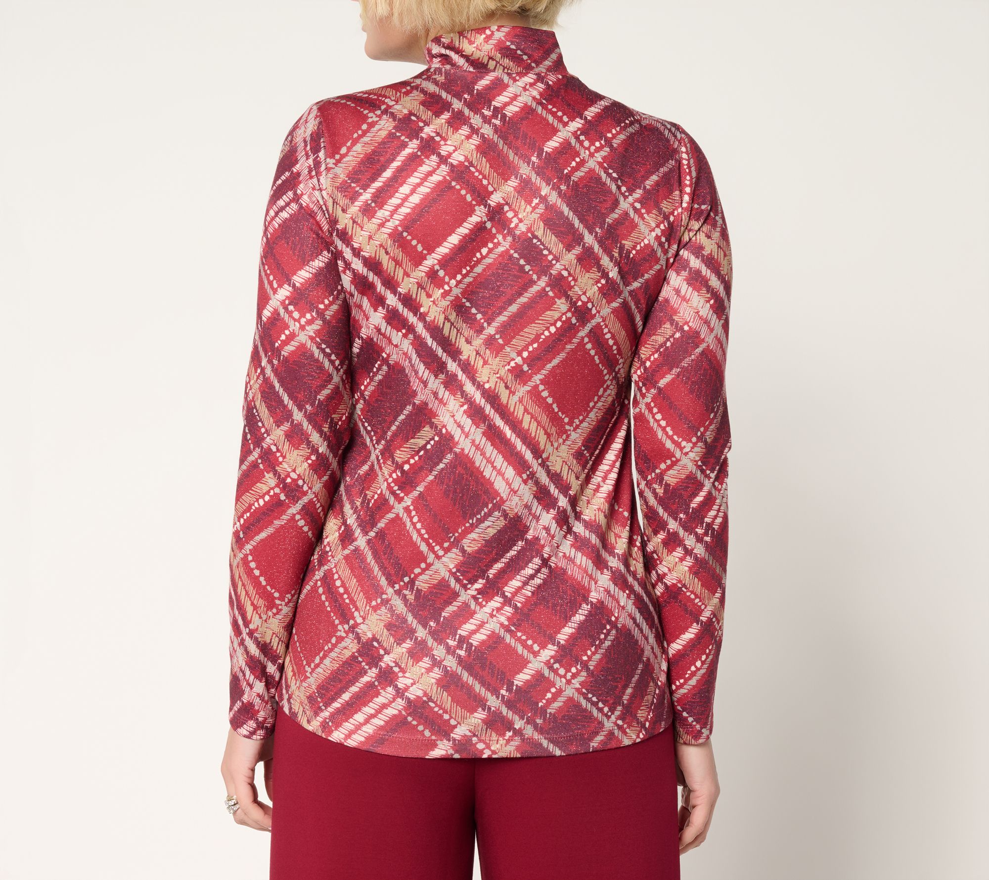 Plaid tidings! Sparkle all season long in this metallic-knit mockneck top. From Susan Graver.