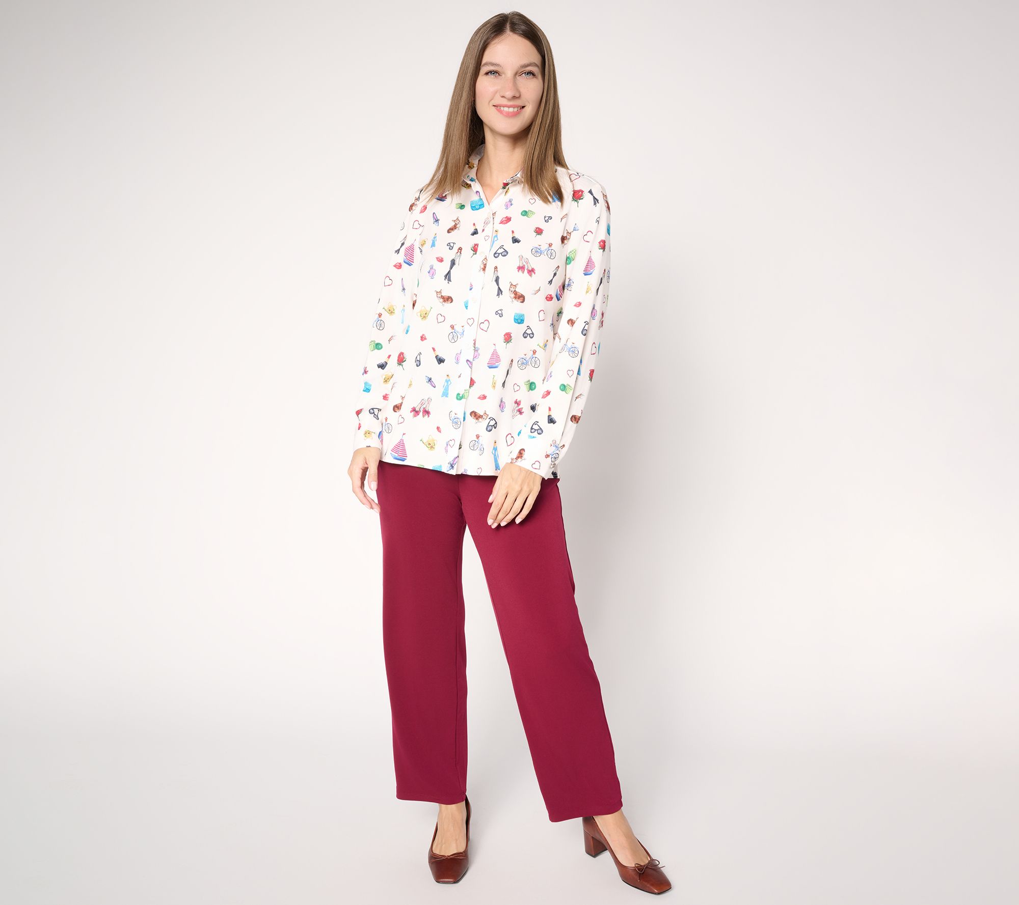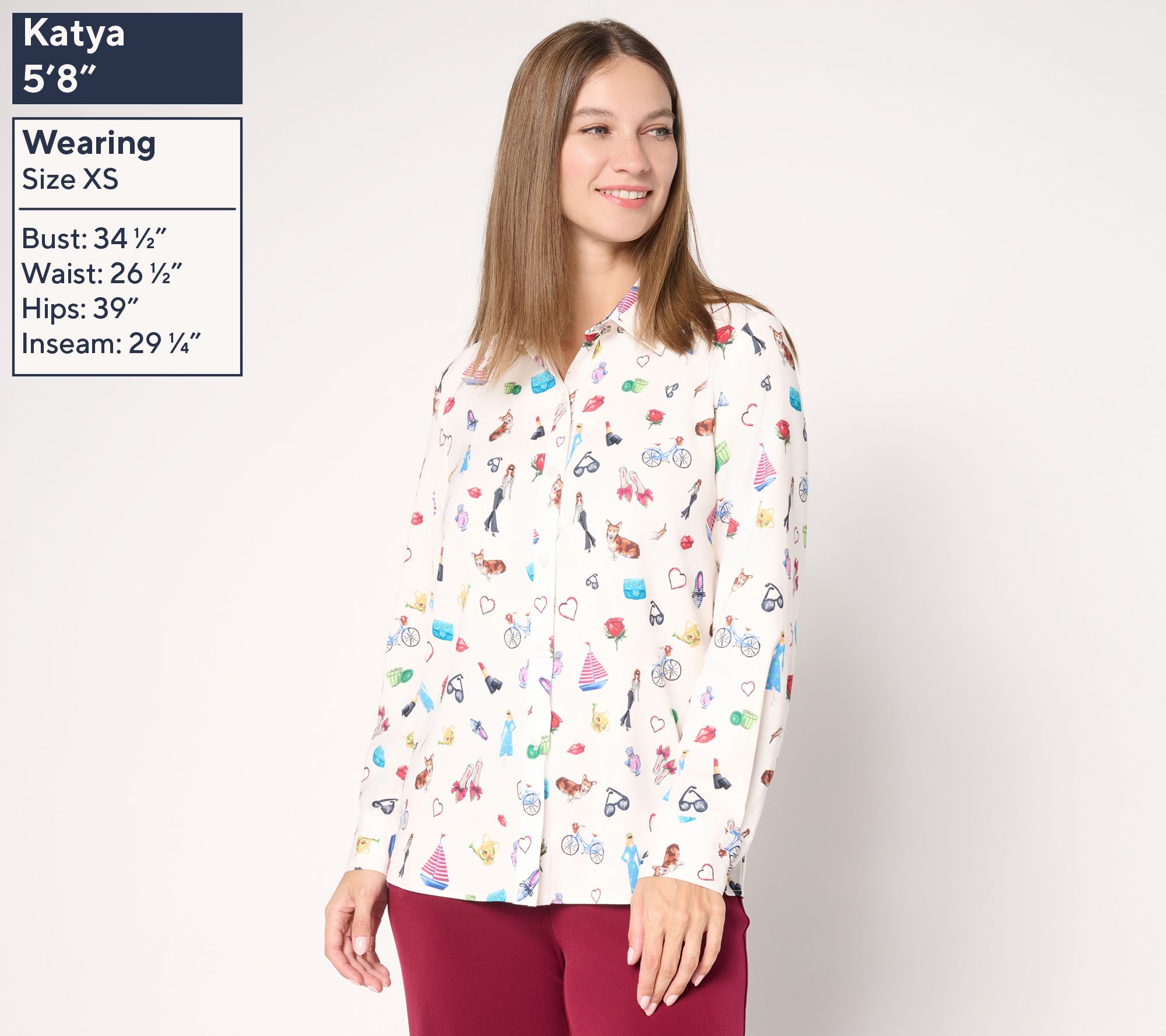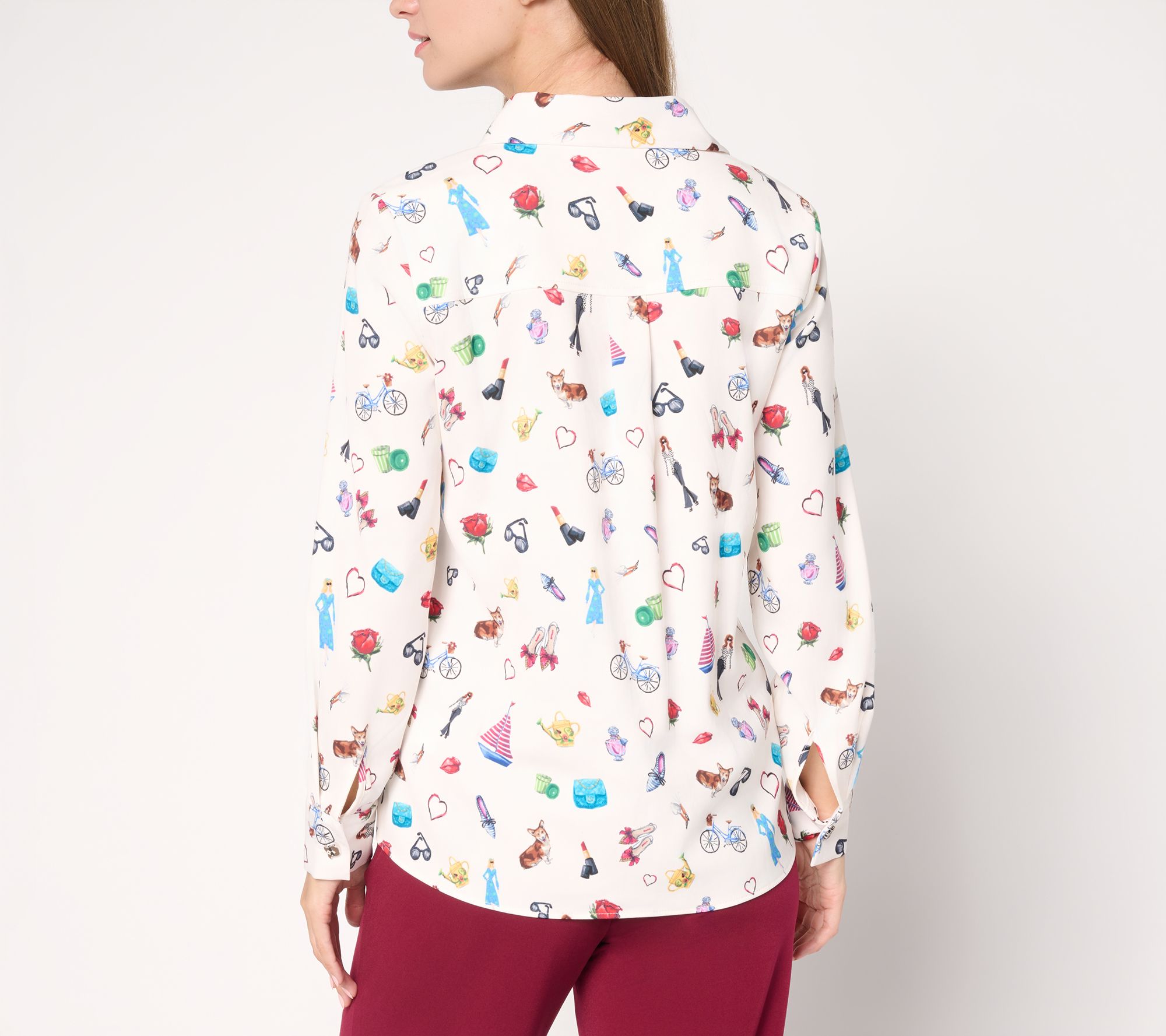 • Features: printed design, long sleeves, button-front closure, button cuffs, novelty buttons, straight bottom hem
