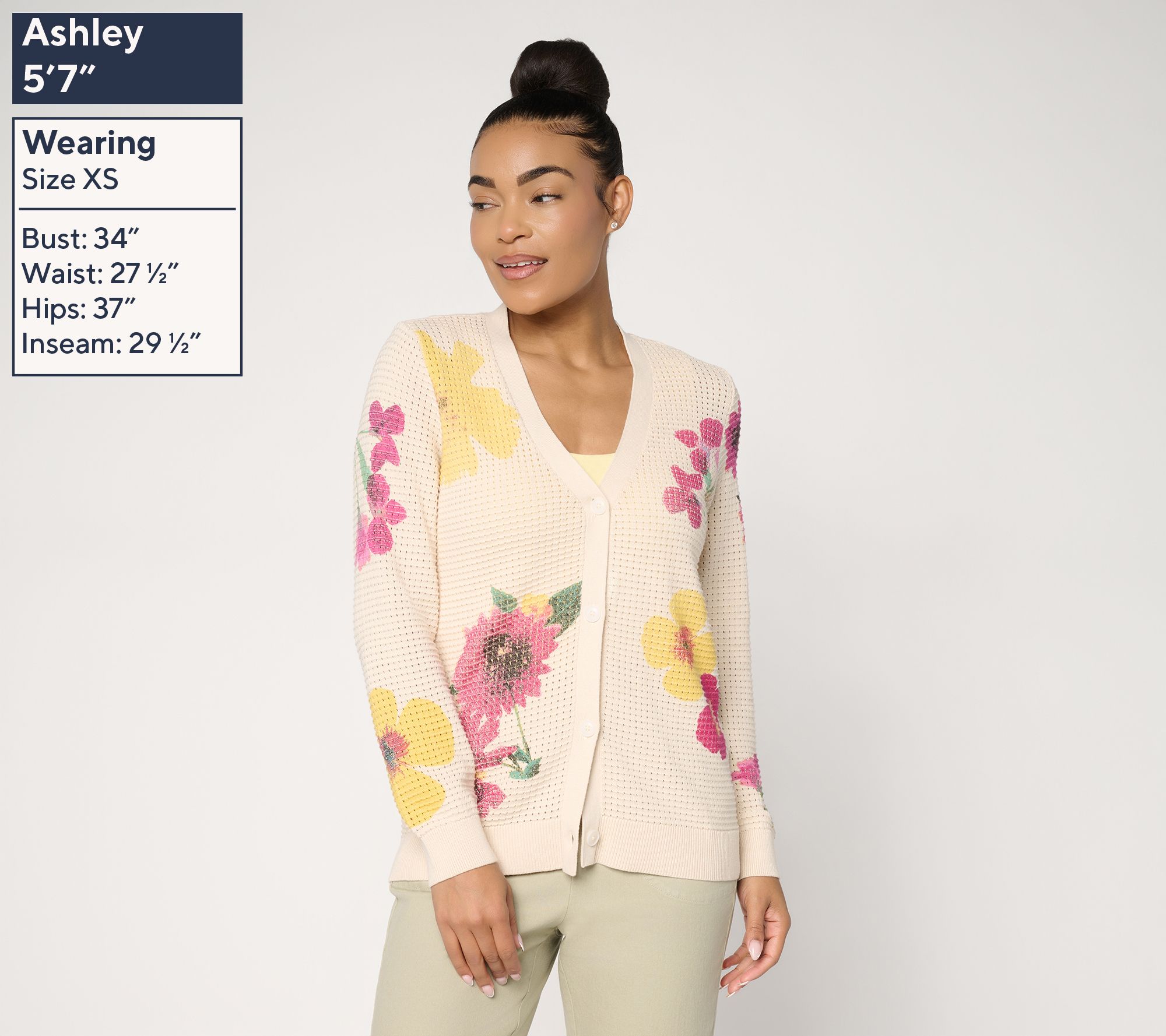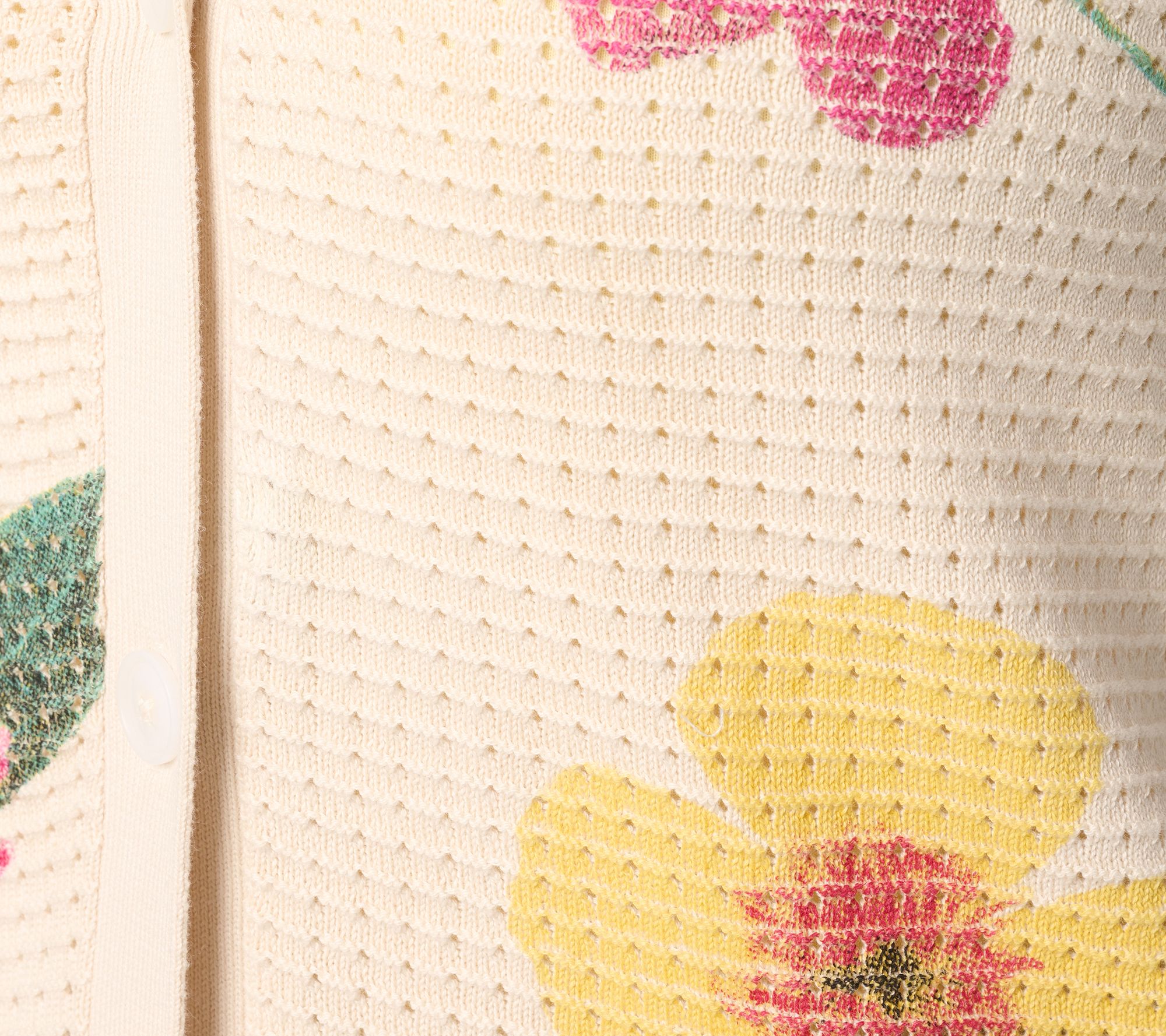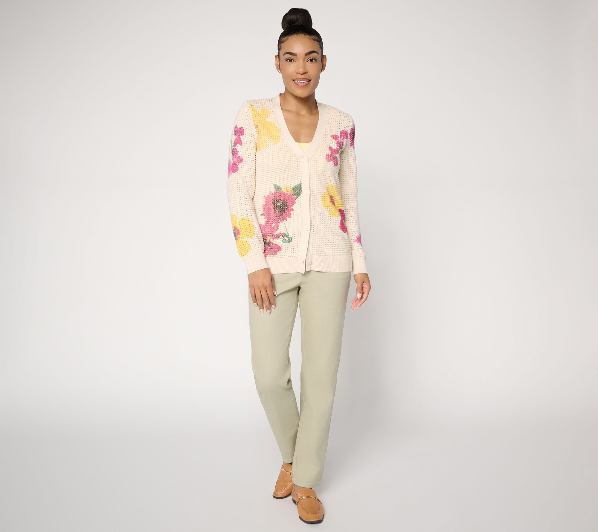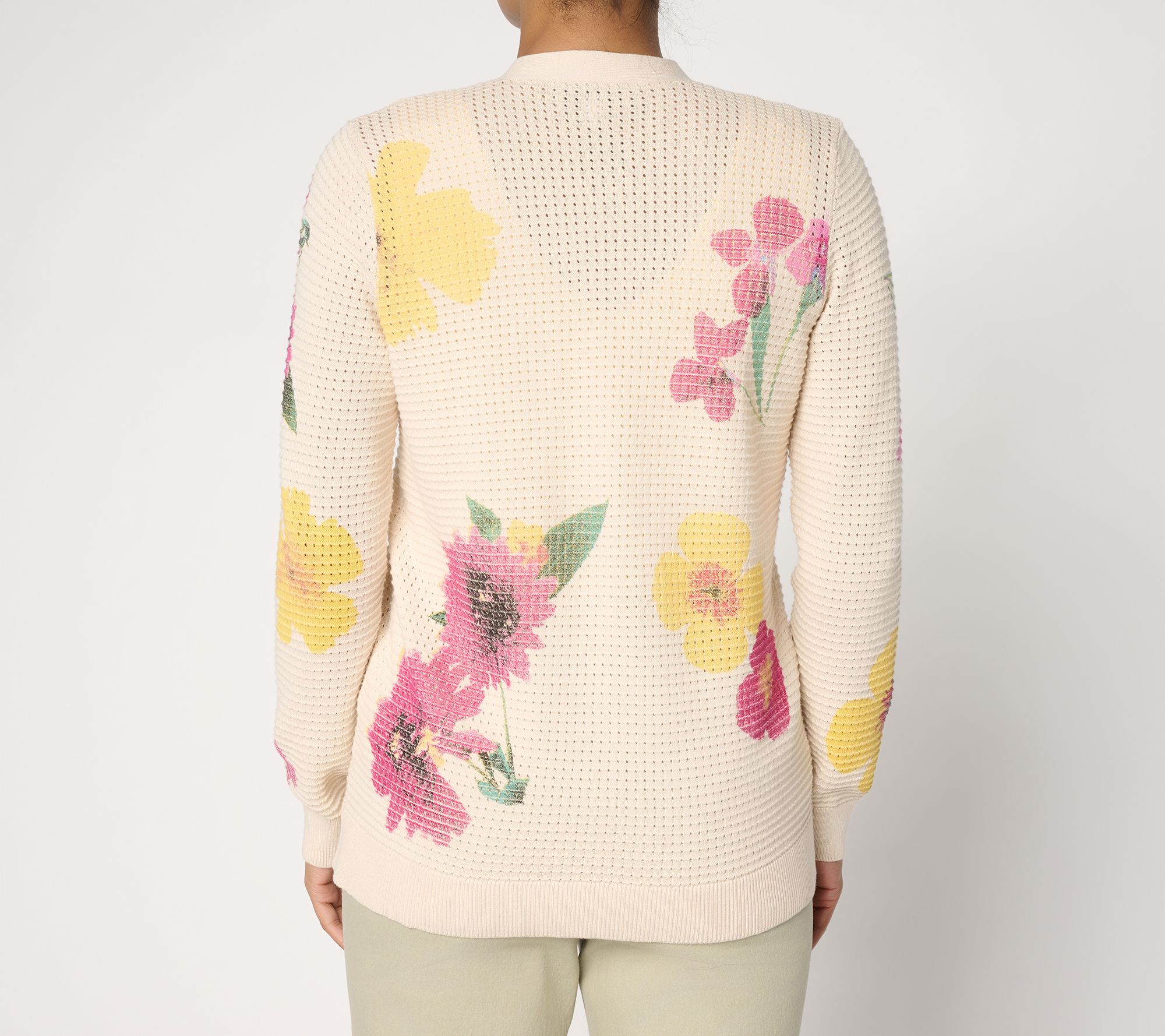 Brighten up your day with this wildflower-print sweater cardigan, designed to easily layer over both work attire and casual looks. The button-front closure and classic Y-neckline create polished structure, while long sleeves with ribbed cuffs offer cozy coverage for breezy mornings or cool evenings. From Susan Graver.
