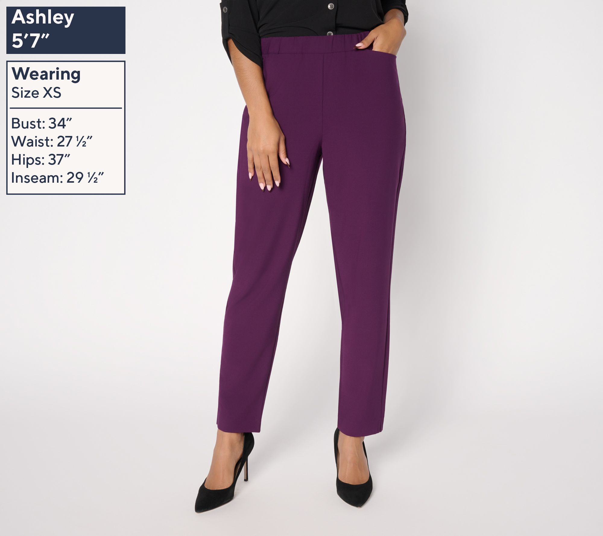 Features: pull-on style, ankle length, front cat-eye pockets, side vents at leg openings