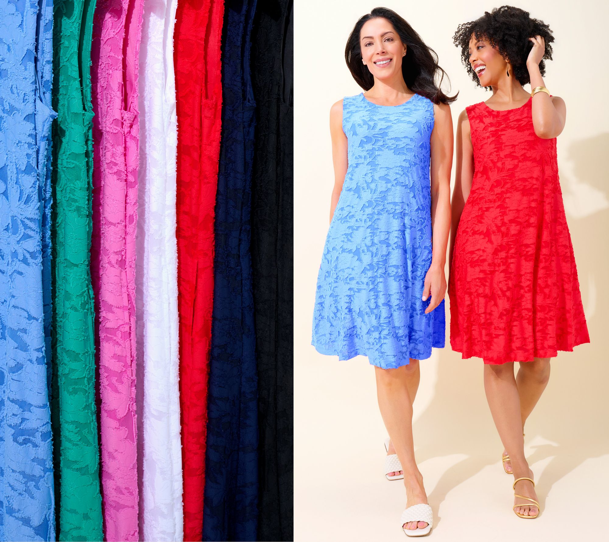 Take a seat at the graduation, mix and mingle at the bridal shower, or bust a dance move at the birthday dinner -- the richly textured yet lightweight fabric never restricts movement and drapes beautifully (and it's fully lined). The universally flattering A-line silhouette skims the body without clinging and flows away from the waist and hips, so you won't have to bother with special shapewear. And the sleeveless style is wide enough at the shoulder for bra coverage (bingo) but also layers like a dream with a denim jacket. Dress it up with heels and jewelry. Dress it down with sneakers or sandals. Either way, you're beautifully dressed (with so little effort). From Susan Graver.