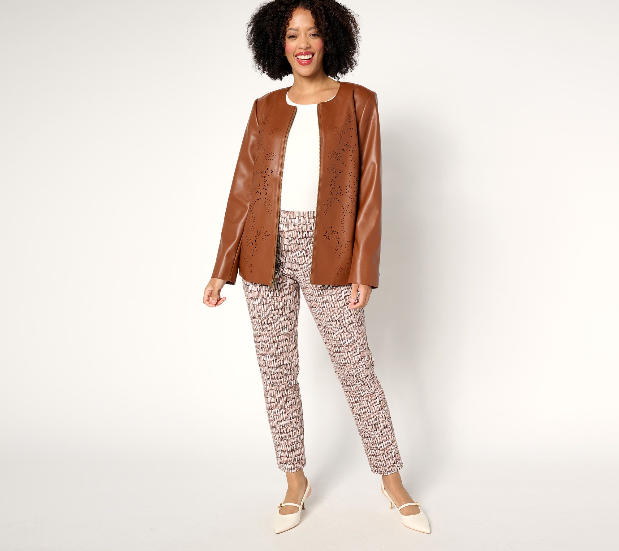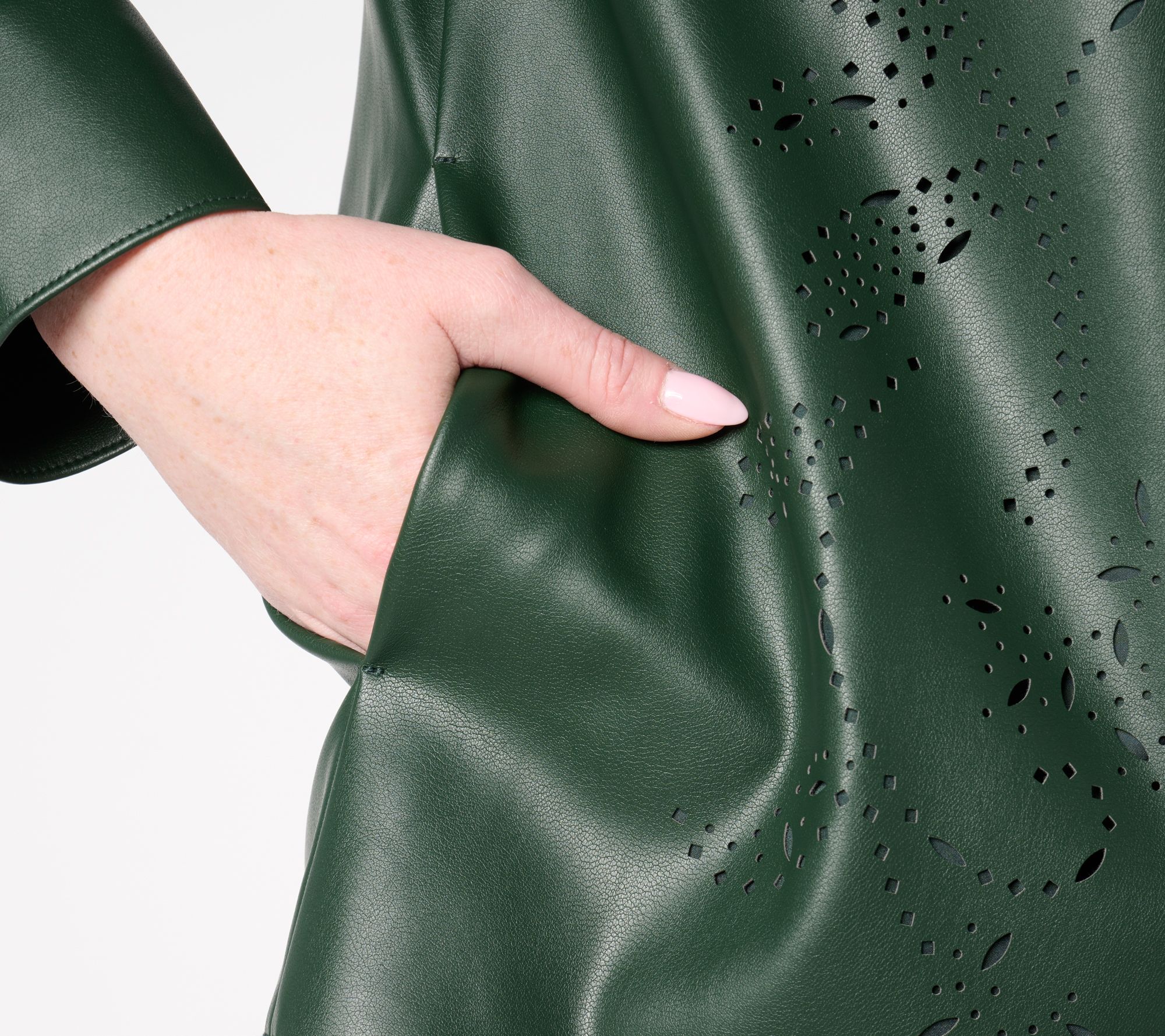 Joy is in the jacket! Pick up this sophisticated layer as a self-gift for the most stylish time of the year or as a modern classic that will always rise to the occasion. Slip it on to attend your bestie's milestone birthday, meet with a new client, or gather the girls for a chic weekend getaway. Sumptuously soft faux leather (a Susan Graver specialty), exquisite tailoring, and intricate laser-cut vinework show everyone that you're as polished and pulled-together as ever.