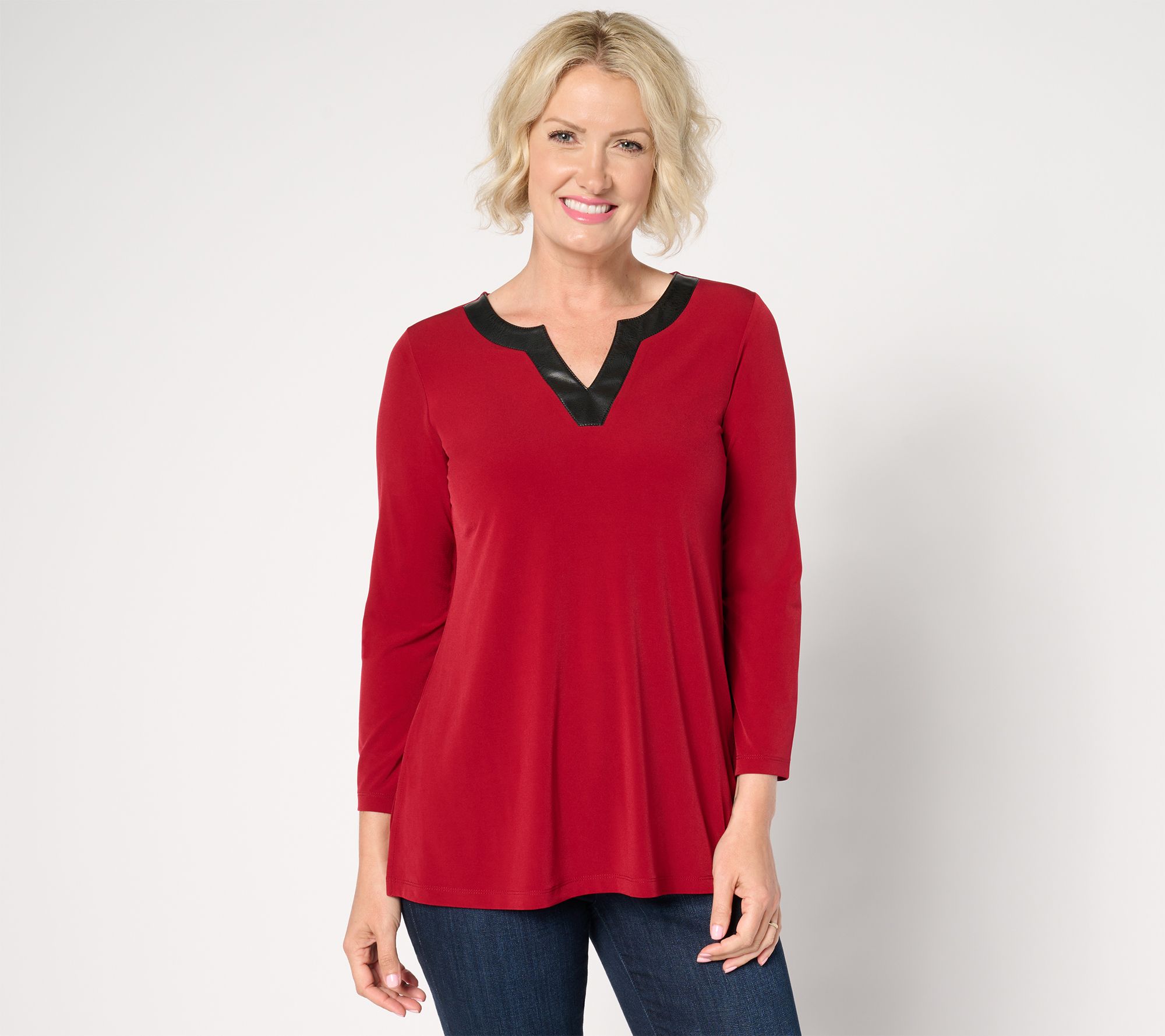 When it comes to this A-line tunic, it's all in the details. The faux leather trim around the neckline adds a luxe touch that makes this style undeniable chic. From Susan Graver.