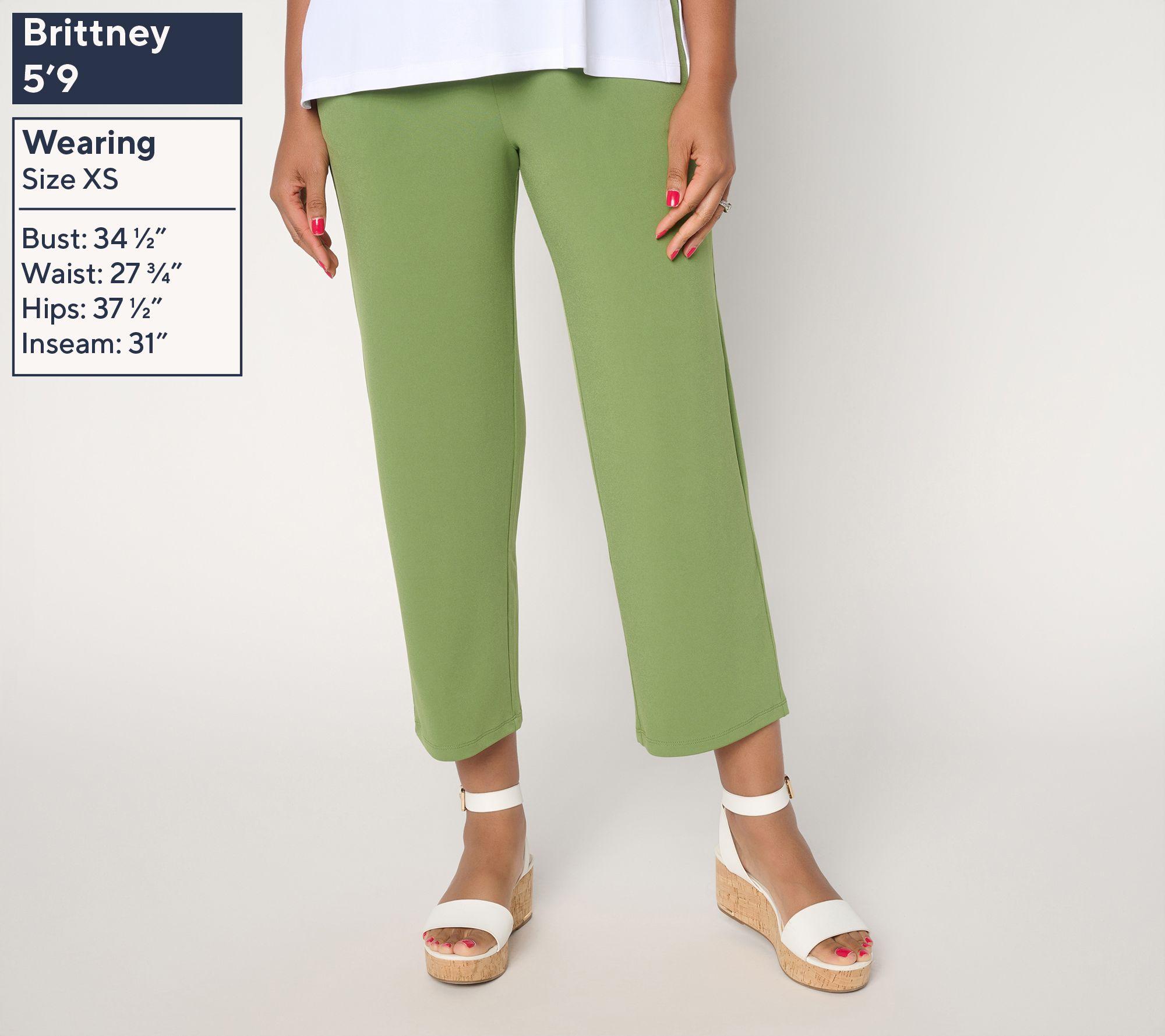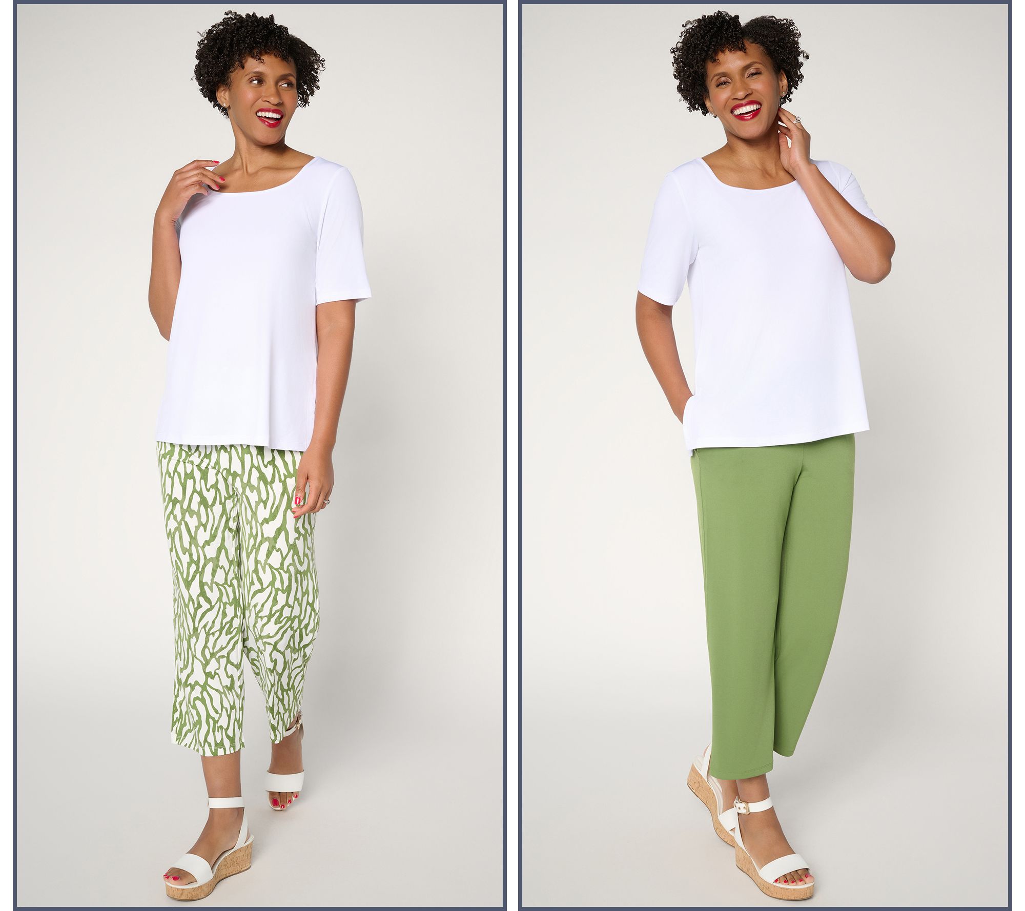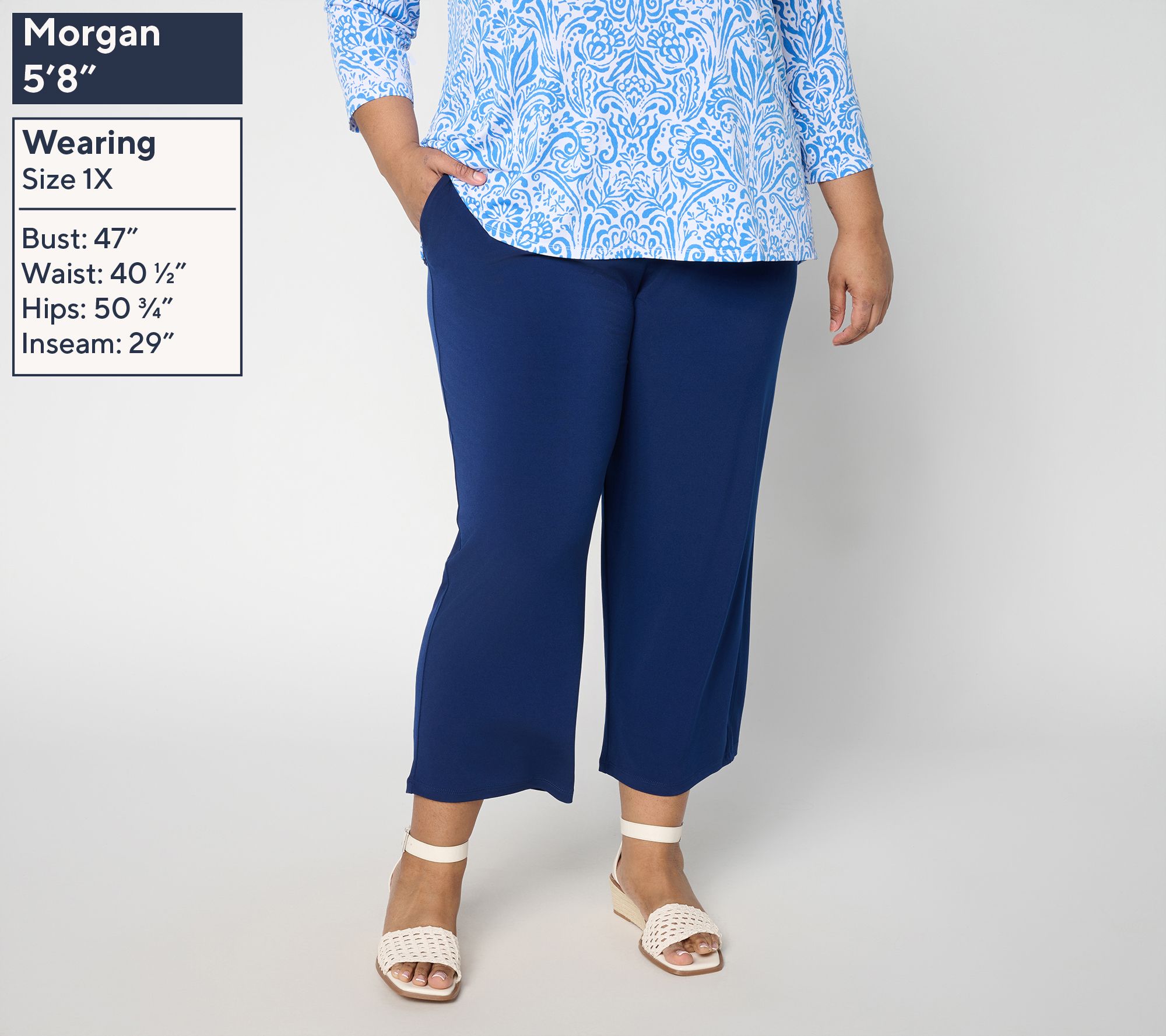 Ready for sunrise strolls, afternoon catch-ups, or weekend getaways? Thanks to Susan Graver, these crop pants bring comfort and style along for every plan. Featuring one print and one solid pair, these Liquid Knit® crops are lightweight, silky, and easy to slip on. Side pockets let you stash your must-haves for wherever the day takes you. (Bonus: They stash in your carry-on like a dream.) From Susan Graver.