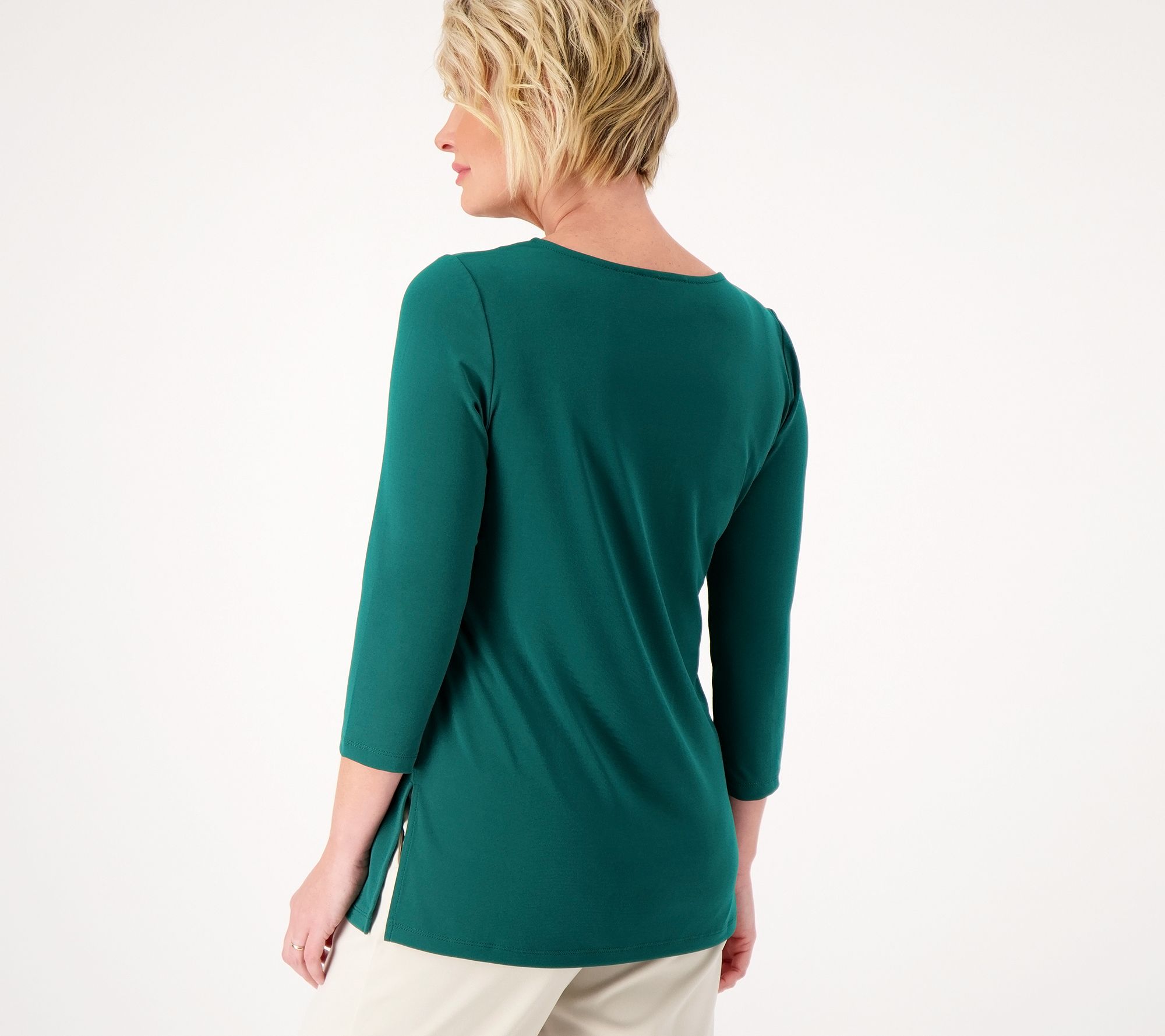 This super-soft tunic boasts all-season approved 3/4-length sleeves and a unique cutout neckline with a tab and button detail. From Susan Graver.