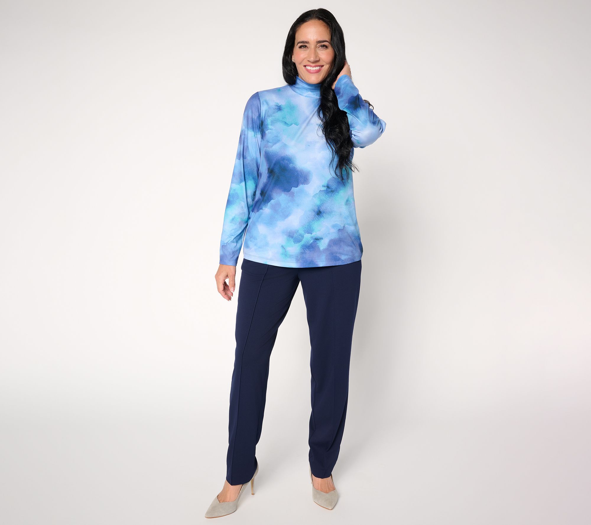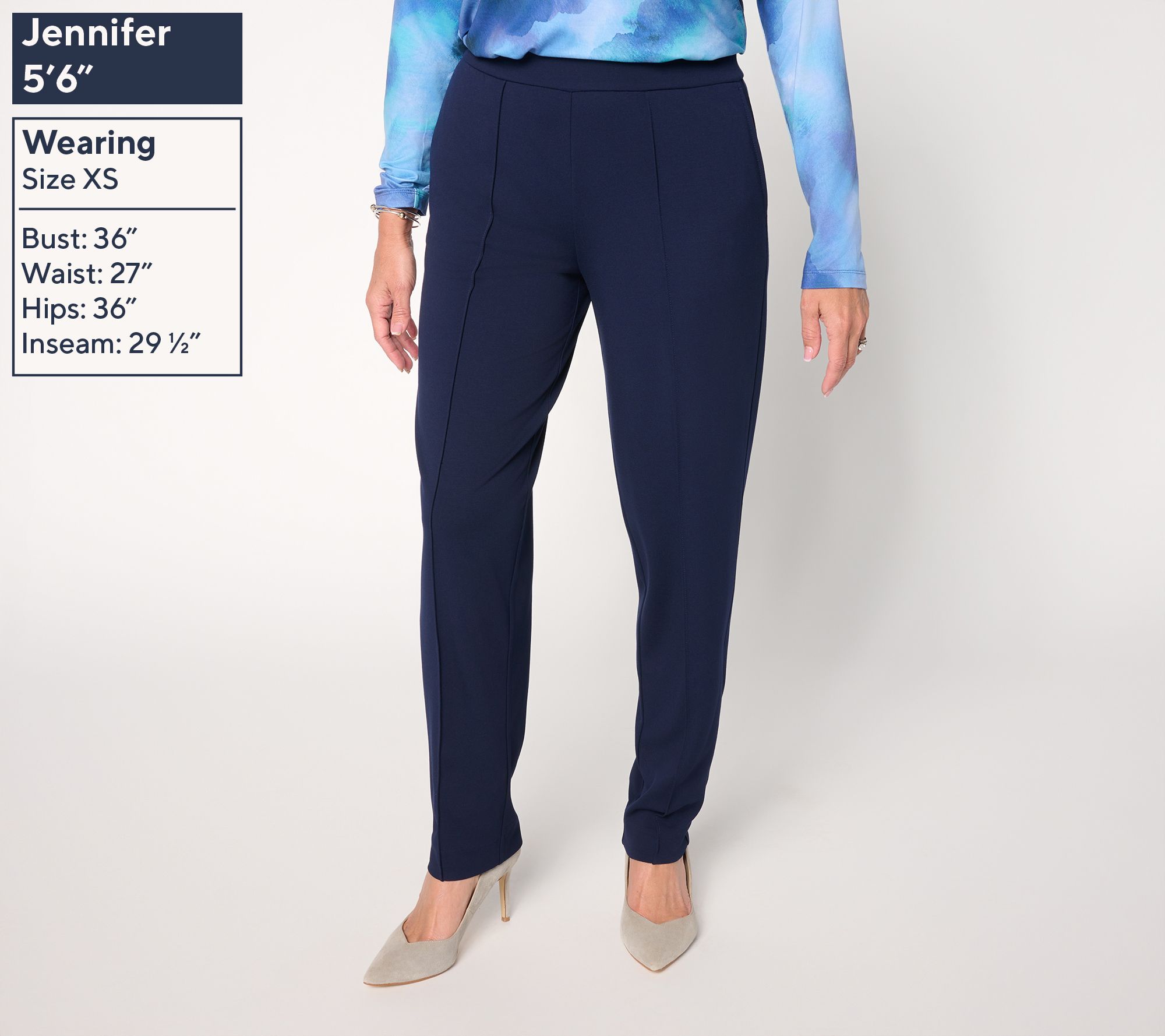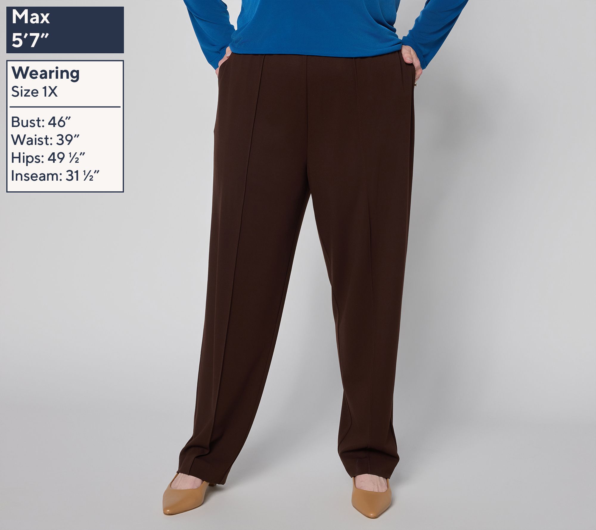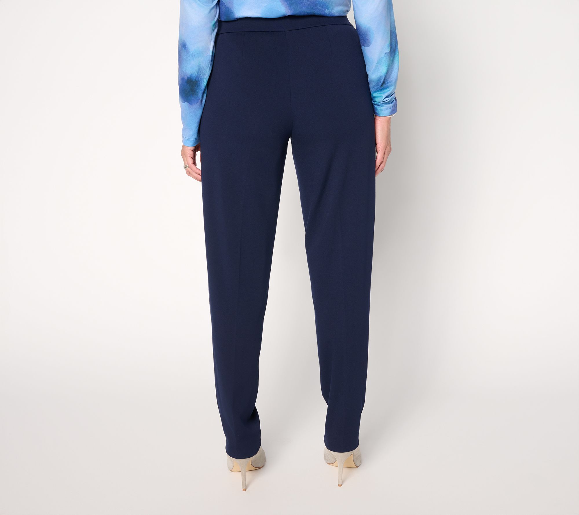 Effortlessly glide from business casual meetings to relaxed afternoons in these Liquid Knit® Ponte pants, designed with a fluid finish and handy slash front pockets. The straight-leg silhouette and pintuck creases deliver a polished touch, making pairing with blouses or sweaters a breeze. From Susan Graver.
