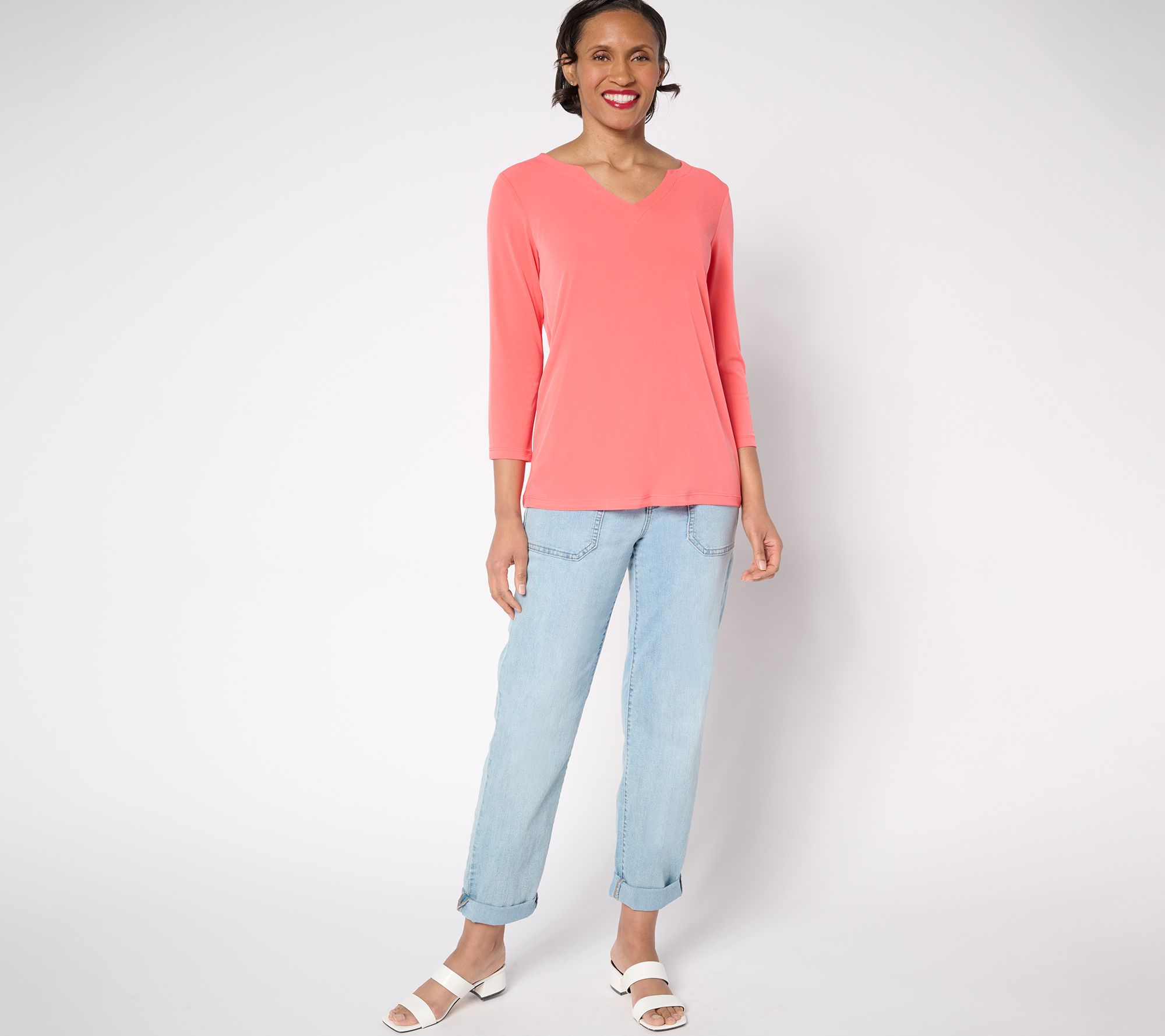 It's not just an essential -- it's a modern essential from Susan Graver. This wardrobe-builder sets the tone for your personal style, going well beyond basic. Featuring a flattering split V-shaped neckline (that frames the face so beautifully!) and crafted in smooth and graceful Liquid Knit®, your new go-to is updated and ready for anything the day may bring. From Susan Graver.