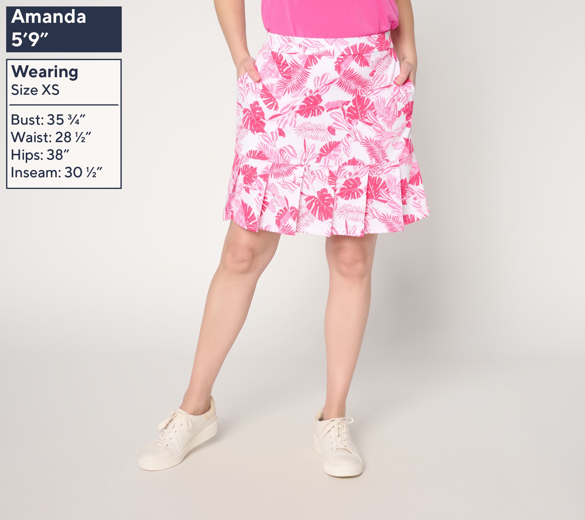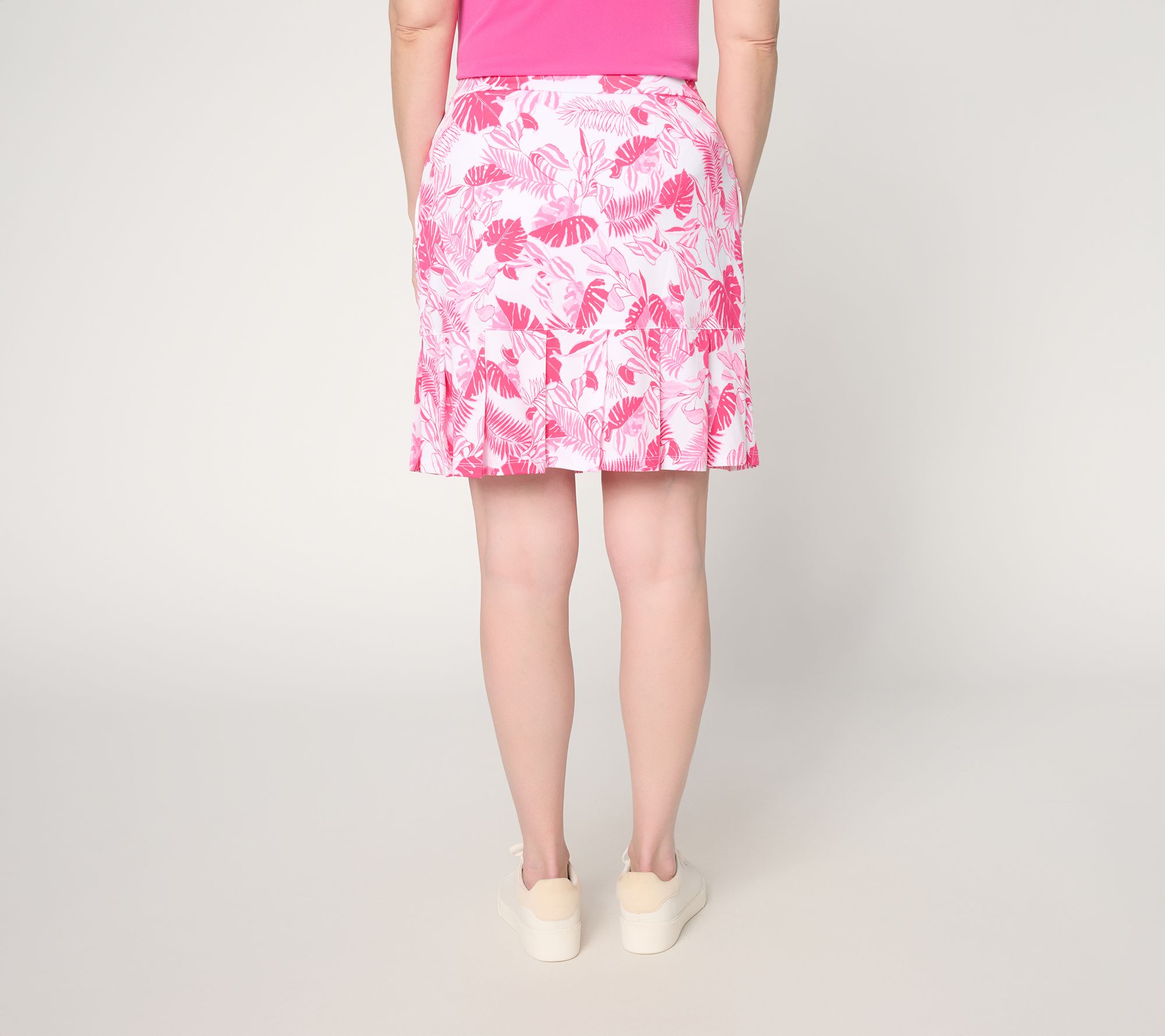 Features: allover print, pull-on skort with pleated hem, attached shorts, zip pockets