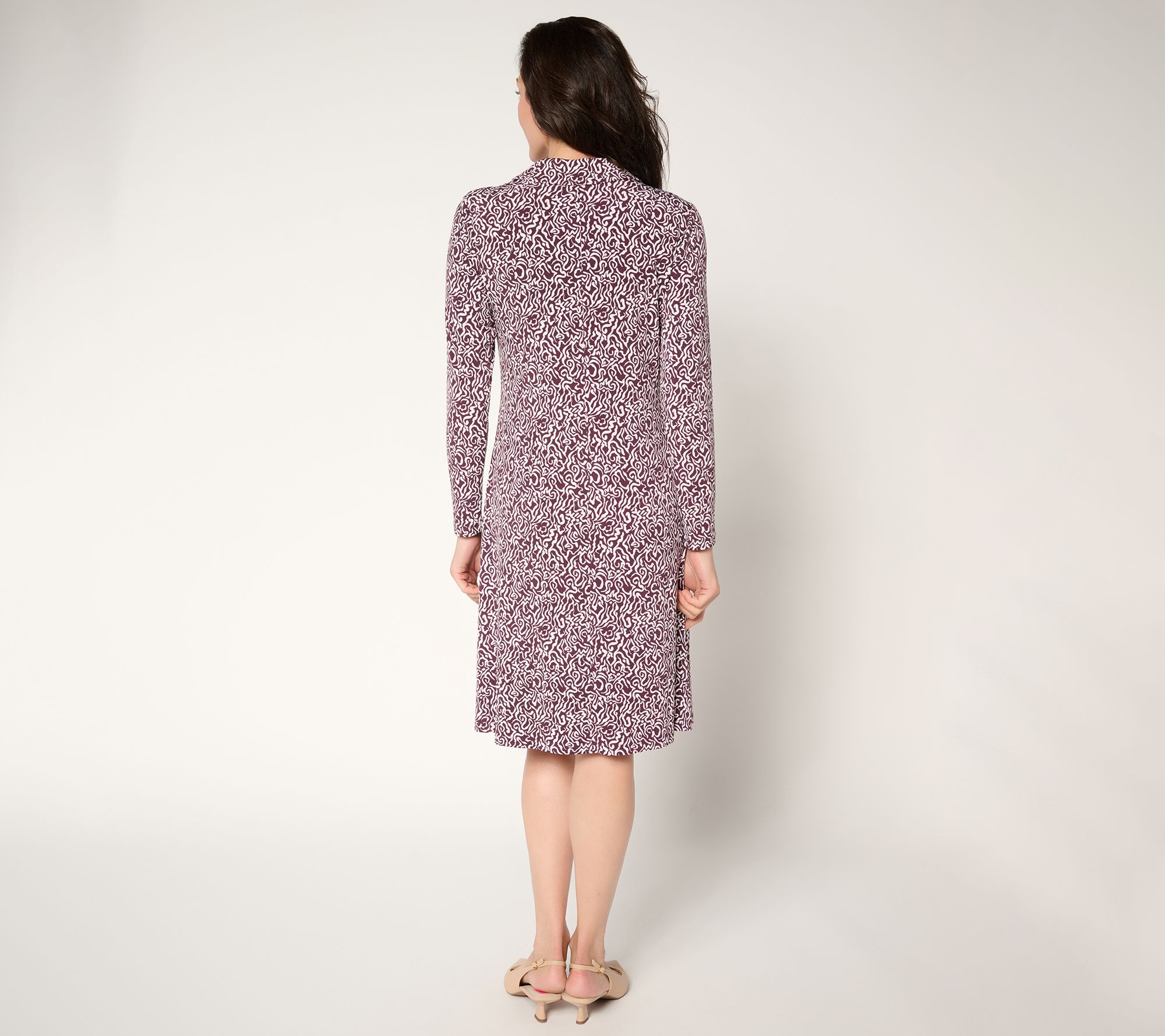 Special days call for a standout look, and this printed midi dress sweeps you from daytime events to evening gatherings with ease. The soft, stretchy knit and A-line shape flatter while the split neckline and long sleeves deliver a tailored touch. Style it with heels or flats for a versatile outfit that moves effortlessly from one occasion to the next. From Susan Graver.