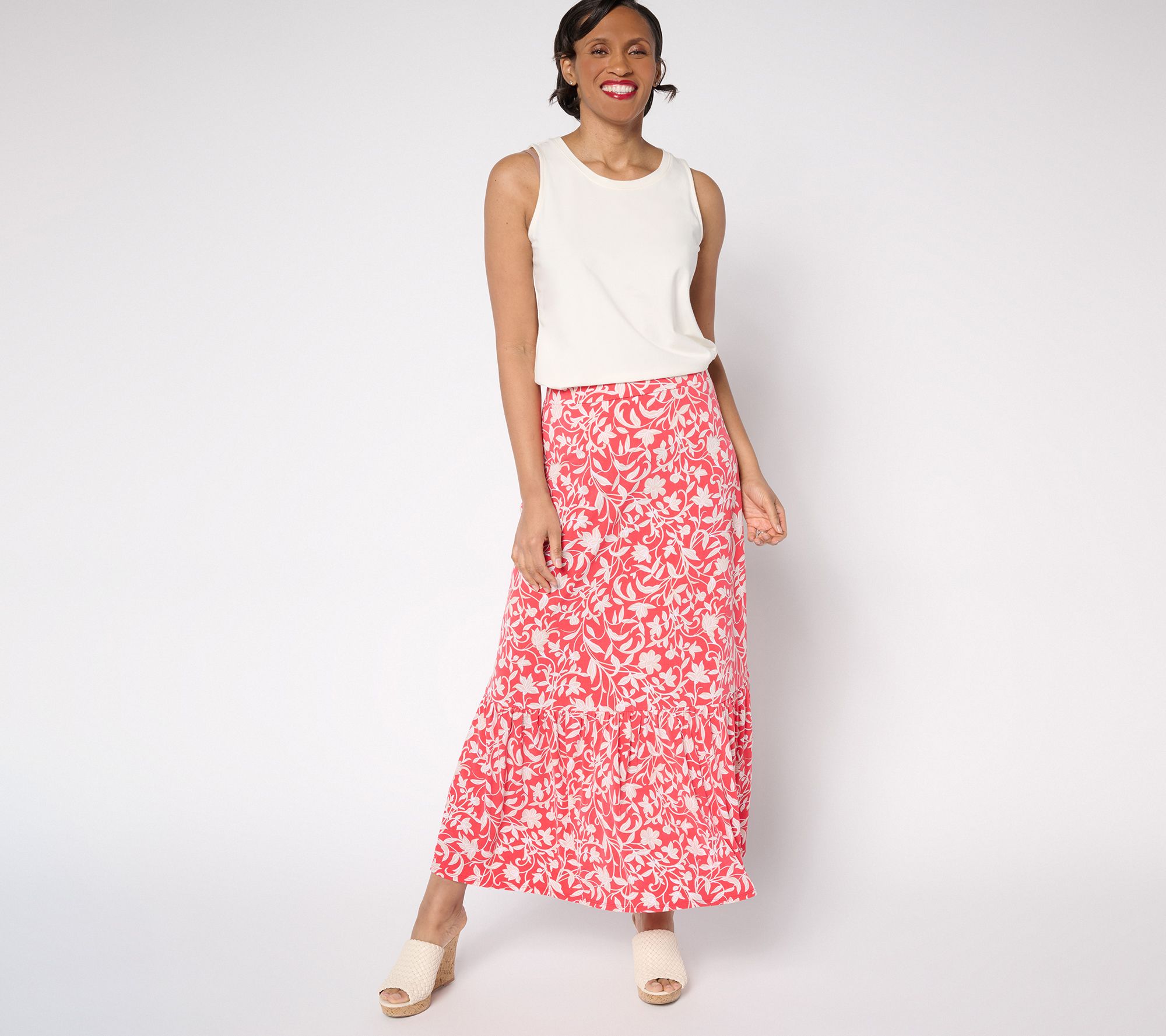 What makes this tiered maxi skirt obsession-worthy -- the fresh floral print? The drapey and delicious Liquid Knit? The urge to wear it on repeat? Yes, yes, and Yes! Get it now, and love it forever. From Susan Graver.
