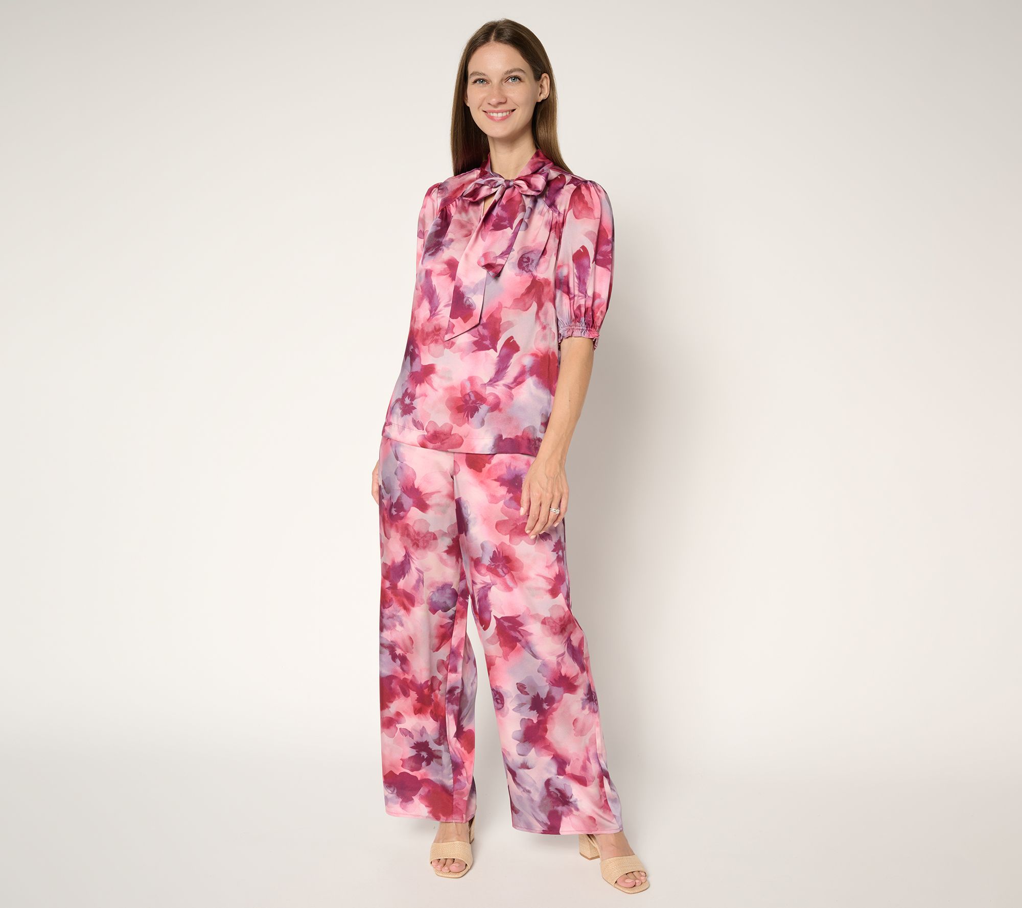 Brighten up office days or weekend outings with these playful satin twill pants. The eye-catching print and relaxed wide-leg cut deliver standout style that easily transitions from casual gatherings to celebratory dinners. Easy pull-on styling, a comfortable elastic waistband, and practical front slash pockets make them a wardrobe favorite. From Susan Graver.