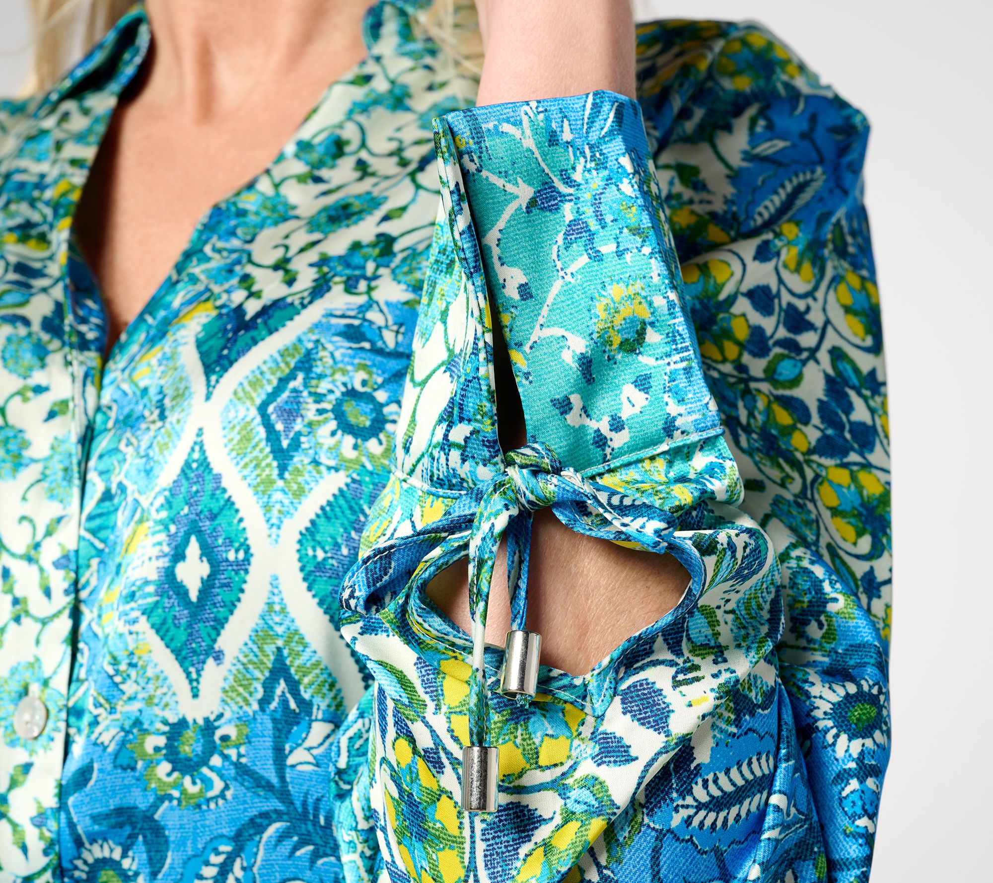 This printed stretch charmeuse shirt stands out with a Y-neckline (perfect for showing off a favorite necklace) and ties on the sleeve cuffs. From Susan Graver.