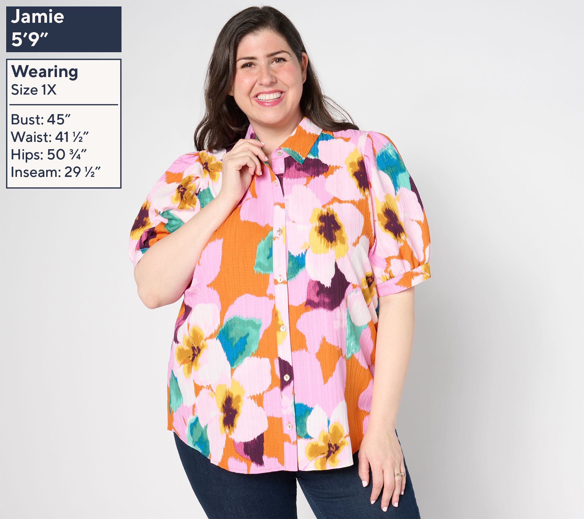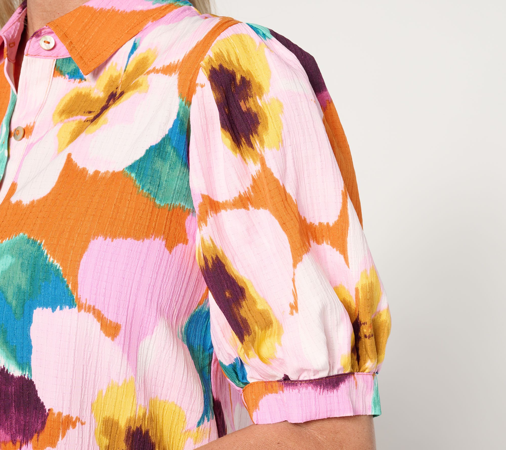 A little bit polished, a little bit relaxed, this woven button-front tunic combines pleated pouf sleeves and a showy print to create a memorable look. From Susan Graver.