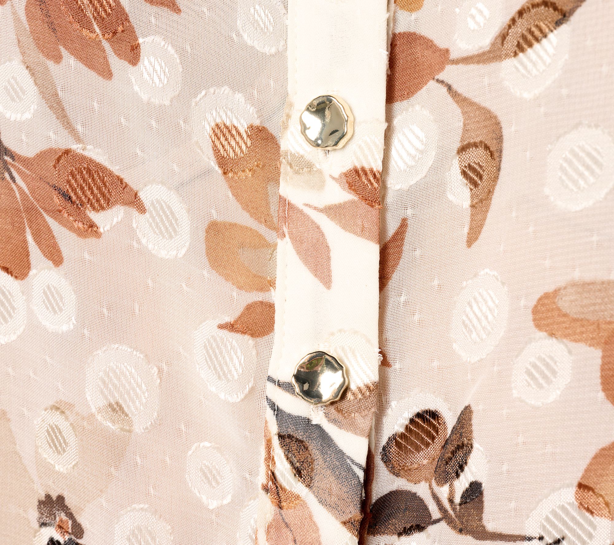 • Features: clip dot design, collar and collar stand, Y-neck along with button center-front placket, set-in long sleeves with shirring and sleeve caps and elastic sleeve opening, shirttail hem with side slits