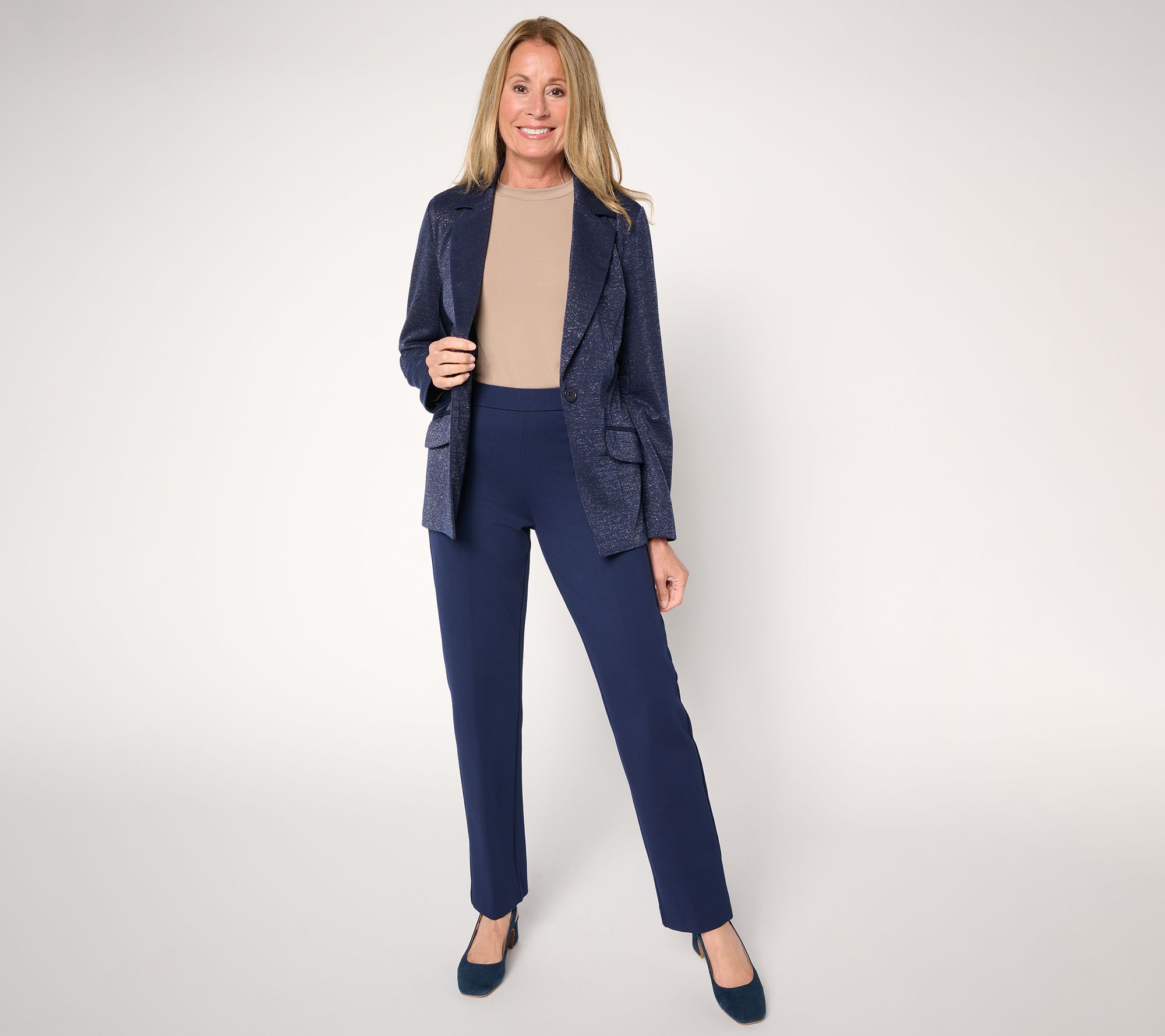 A little bit softer now. In this knit blazer with a soft metallic finish, find a festive fashion moment that's undeniably sophisticated and more subdued than dramatic disco ball styles. Sport it with everything from jeans and sneakers to your prettiest frock and party shoes, and watch its versatility extend well beyond the NYE countdown. Think spring weddings, birthday celebrations, and evenings at the theater. From Susan Graver.