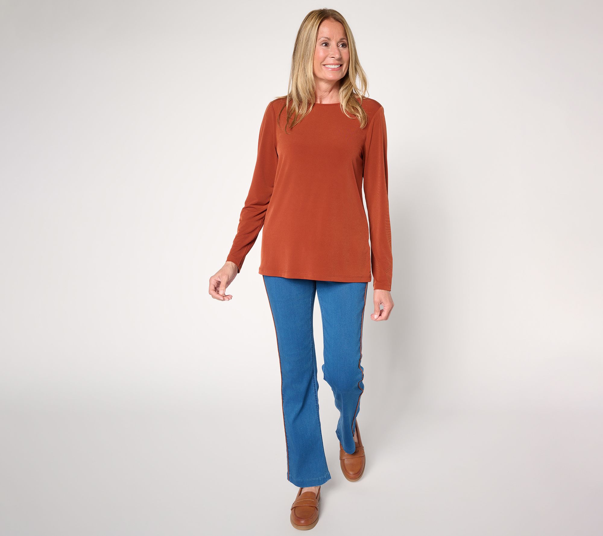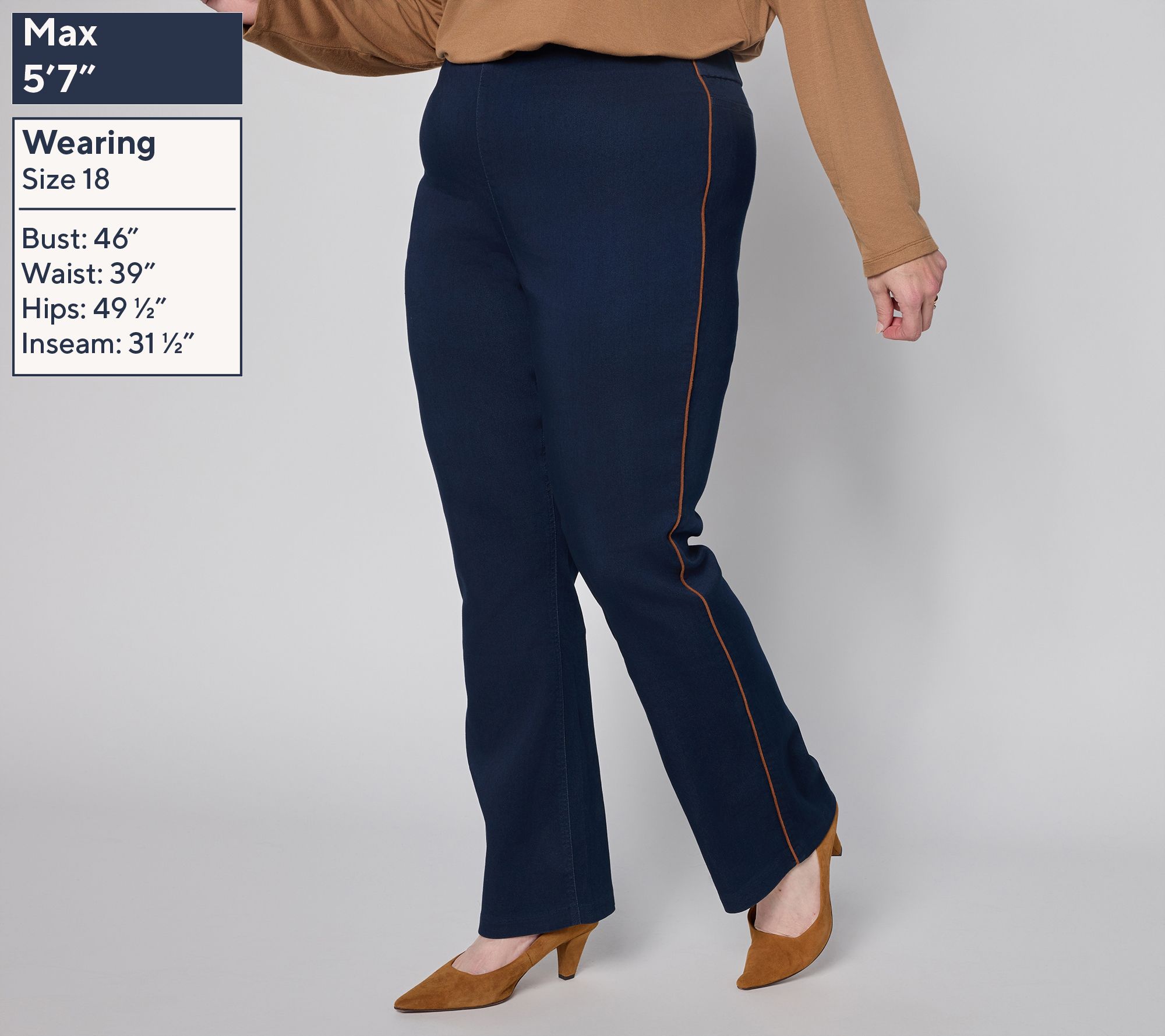 Craving a fresh take on denim? Slip into these soft stretch jeans for a stylish spin on weekend plans or casual Fridays at work. The faux suede piping adds a luxe touch, while the Hollywood waistband delivers lasting all-day comfort. Now you've got good reason to pick up those textured loafers or Western-inspired ankle boots you've been eyeing. From Susan Graver.