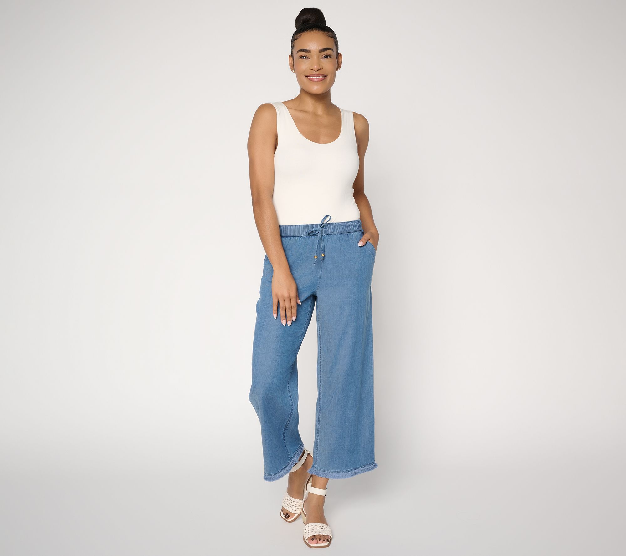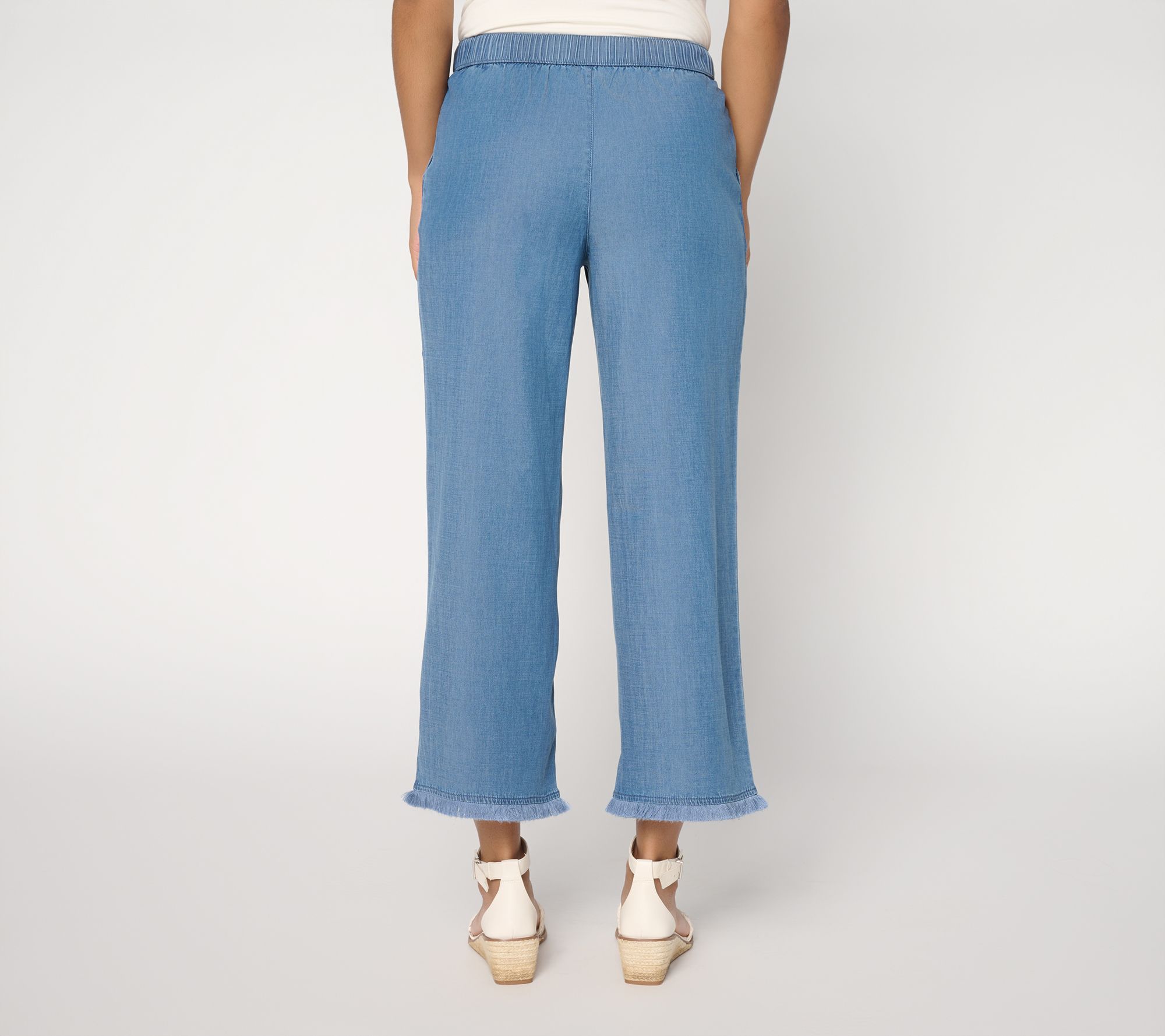 Here comes the... chambray! Slip into easy flair with these stretch chambray pants when heading to a seaside lunch or a weekend market stroll. A gently relaxed shape, fringe along the cropped hem, and drawcord waistband blend comfort and playful details, while slash front pockets offer on-the-go versatility. From Susan Graver.
