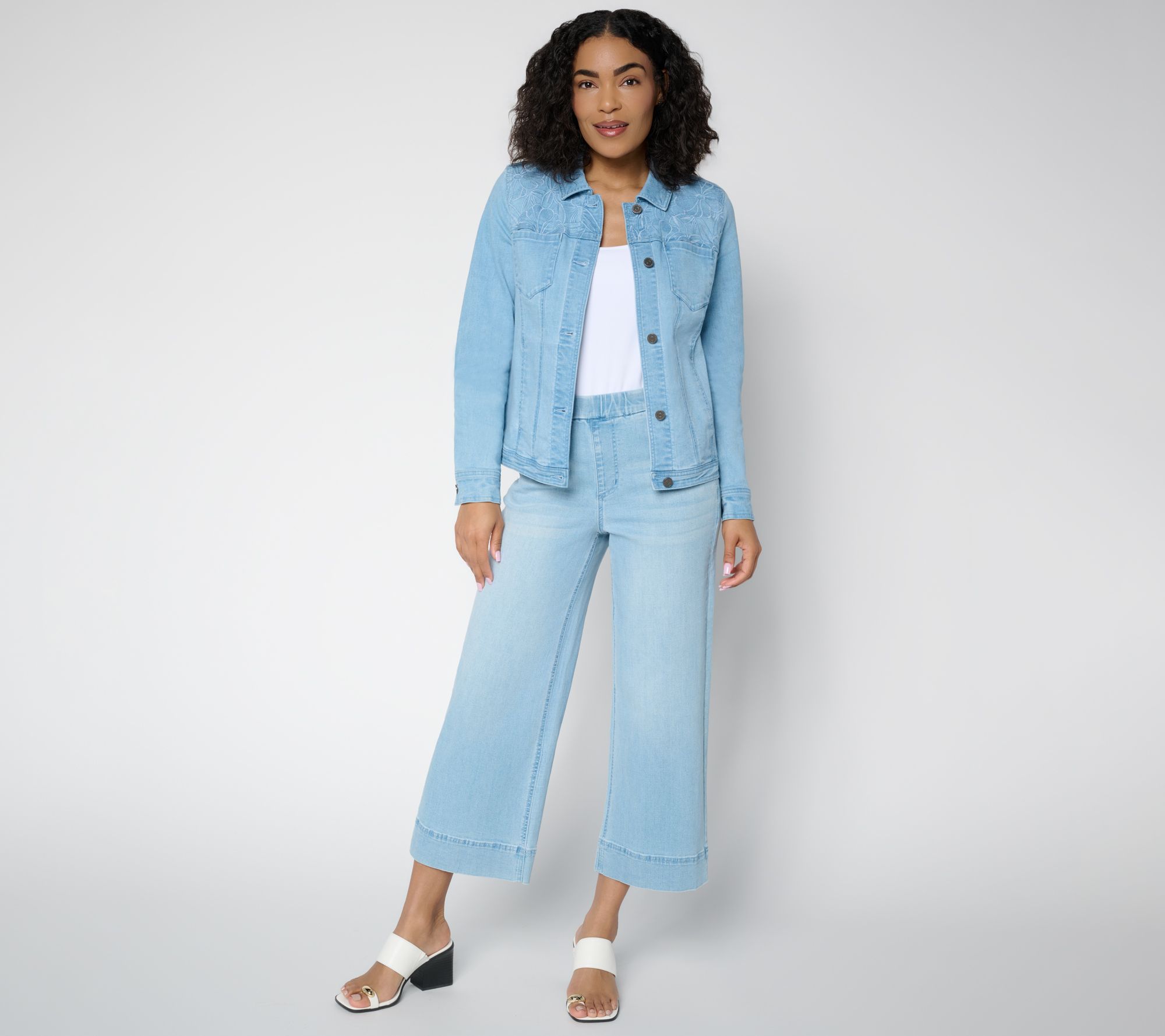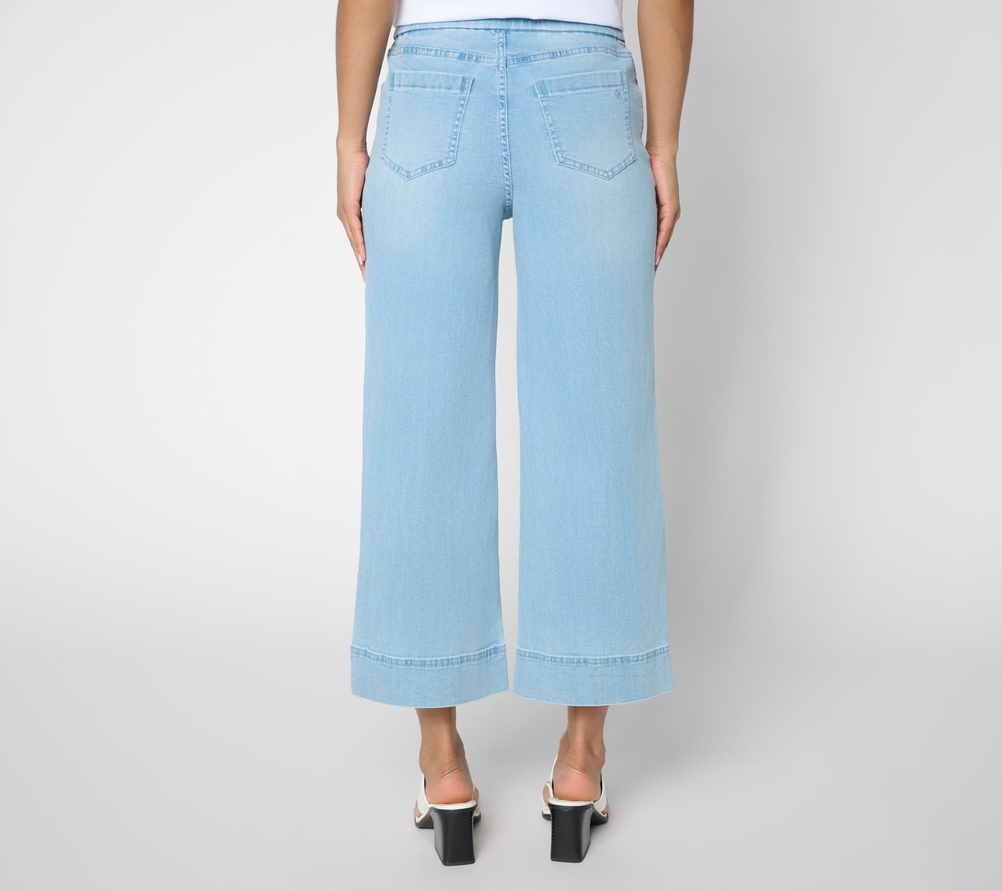And stretch! Whether you're dressing for the office or catching up with friends, these wide-leg cropped pants in Susan Graver's smooth, flexible stretch denim bring a modern twist to your usual lineup. The contoured pull-on waistband keeps things comfortable, while functional pockets and a faux fly add polished utility to the look. From Susan Graver.