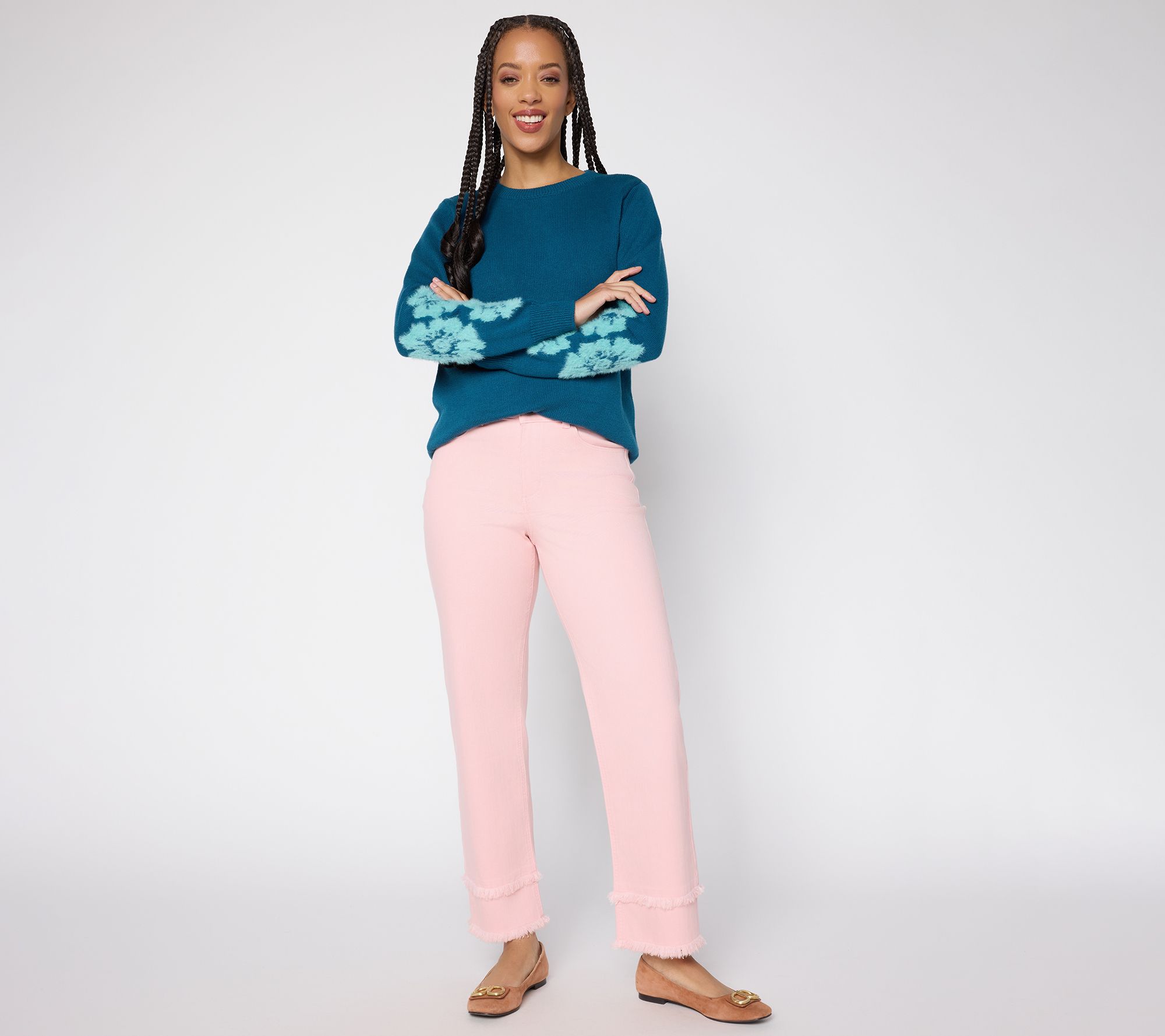 Found: jeans with a more playful POV -- that still feel sophisticated. Pick this fringed-hem ankle-length pair when you a little something extra that goes the distance for a lunch date, client meeting, or (oh!) weekend winery tour. From Susan Graver.