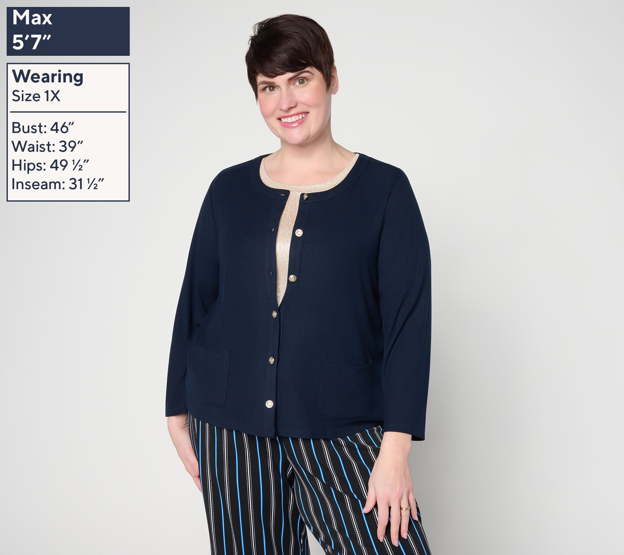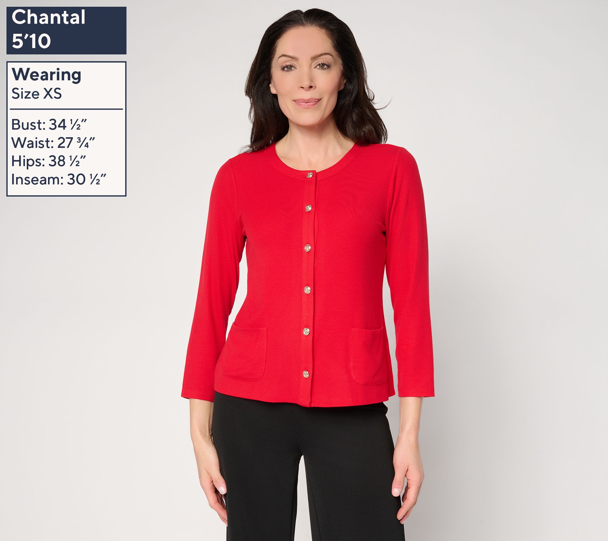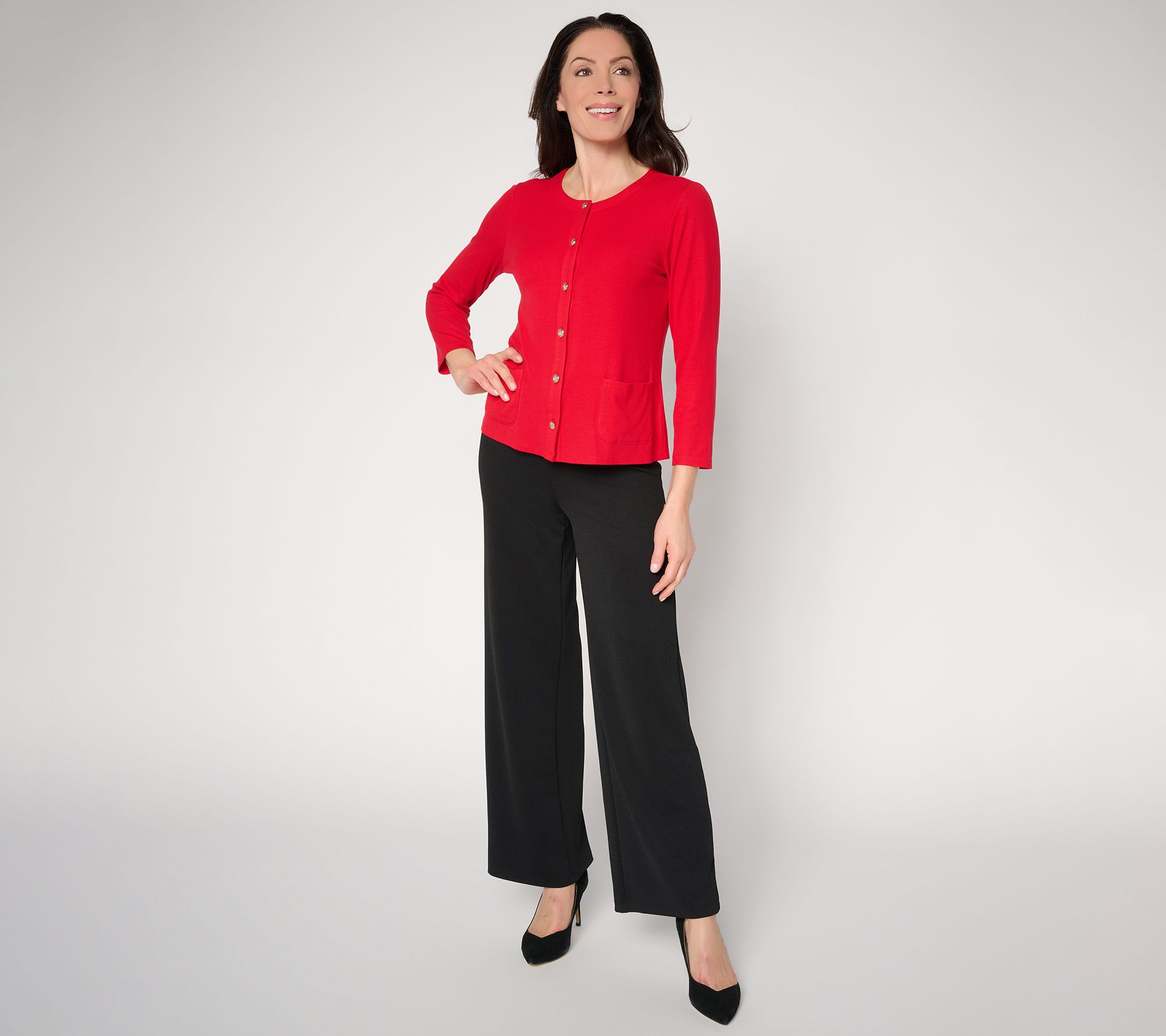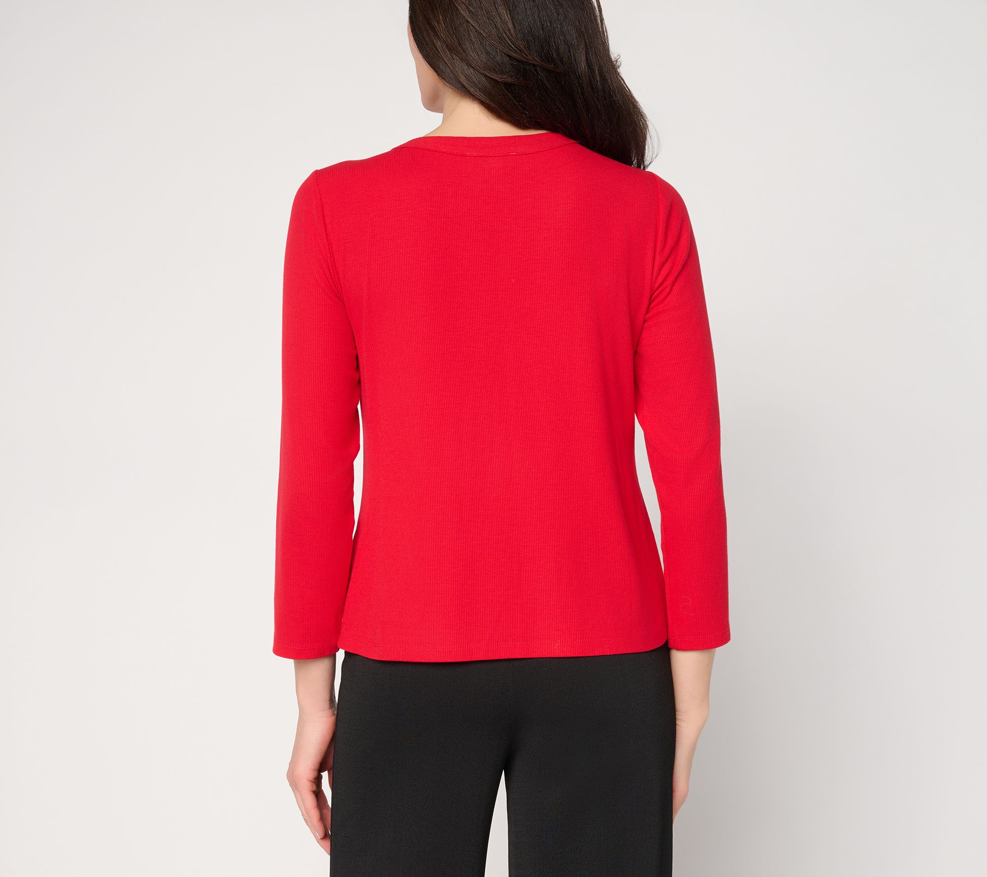 A lightweight layer for quick errands or air-conditioned in-office days, this rib knit cardigan offers a ribbed texture along with a touch of elegance with its novelty button-front detail. The 3/4-length sleeves and easy silhouette make it simple to slip on over a favorite top, whether you're on the clock or enjoying an off-duty day. From Susan Graver.