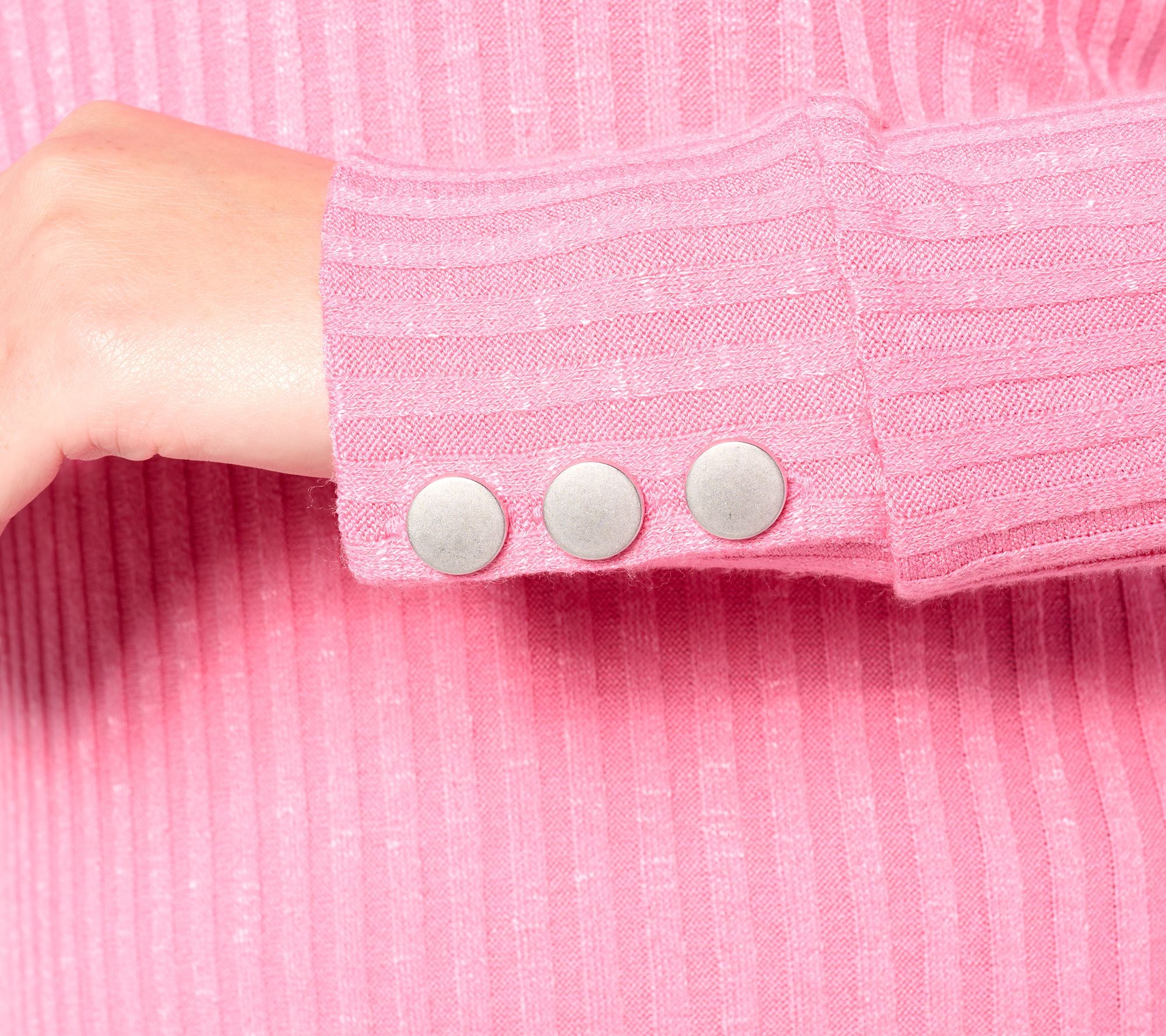 • Features: mock neck, long sleeves, button detail at sleeve cuffs, straight hem, side slits