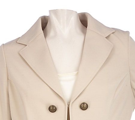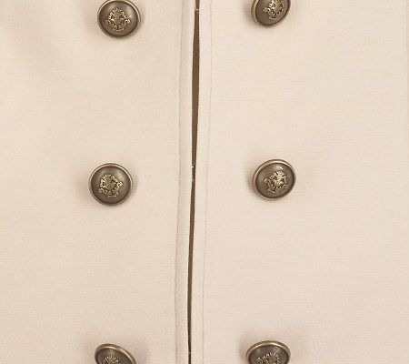 Fashion statement. Antiqued goldtone military-style buttons serve as the fabulous focal point of this Soho ponte jacket. A notched collar as well as front and rear princess seam detail offer stunning shape and style to the piece. From Susan Graver.