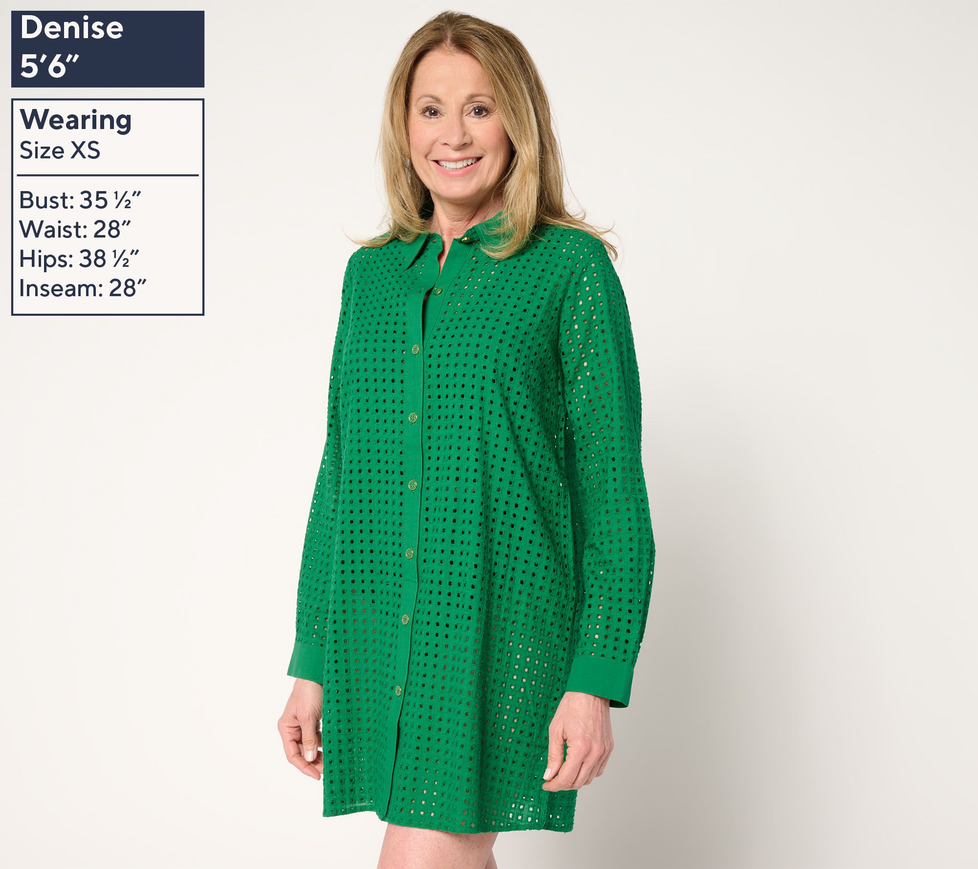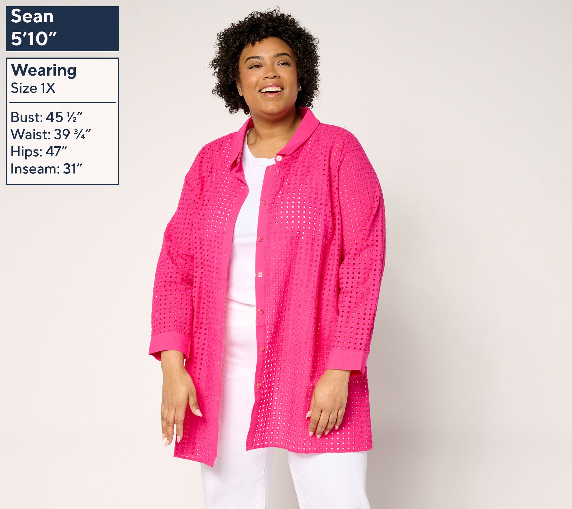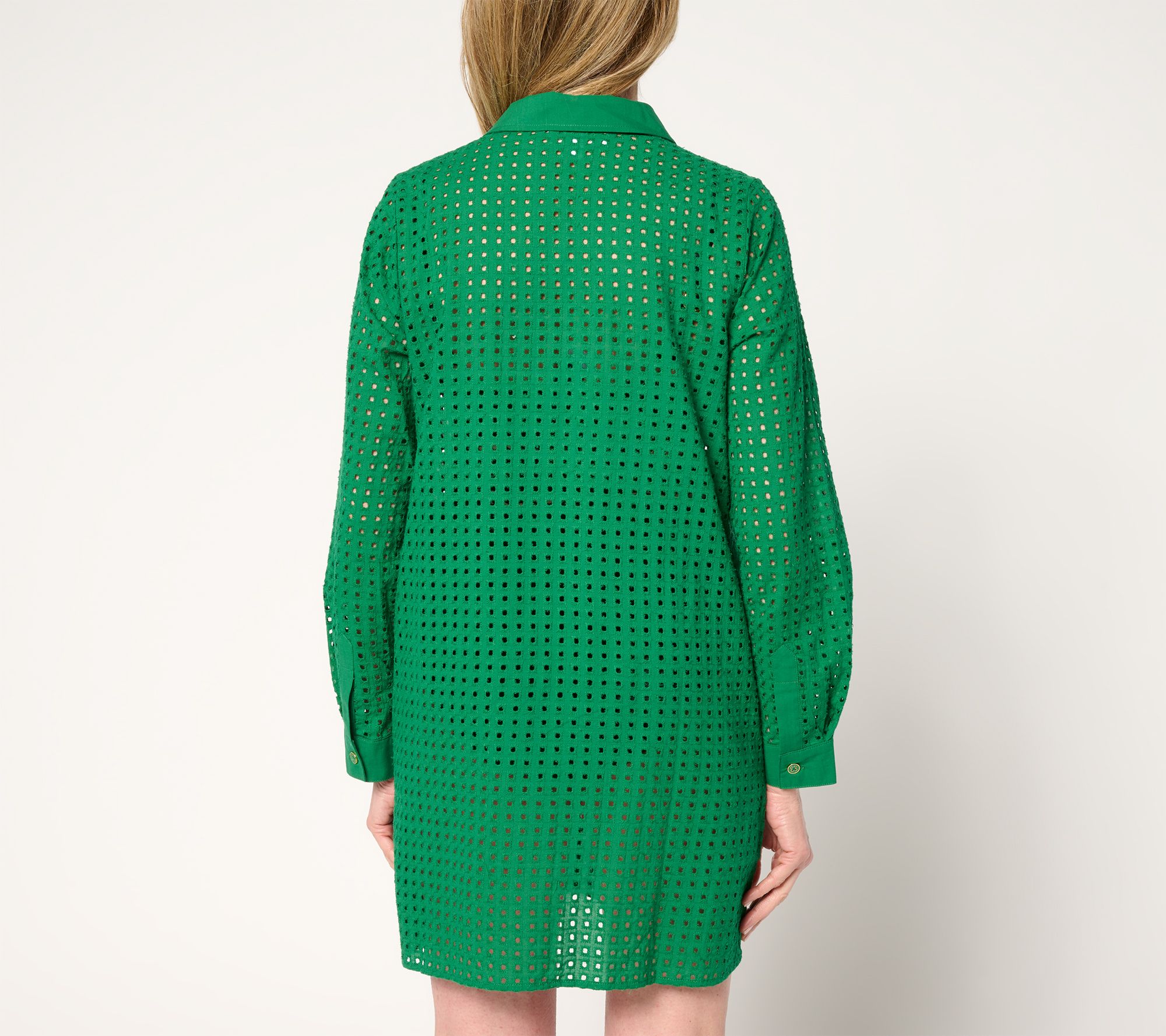 Ready for a resort vacay? Slip into this Soleil collection eyelet cover-up. Its semi-fitted silhouette features a classic collar, button-front closure, and subtle side slits for added ease. Perfect for lounging poolside, casual beach strolls, and grabbing a bite after! From Susan Graver.