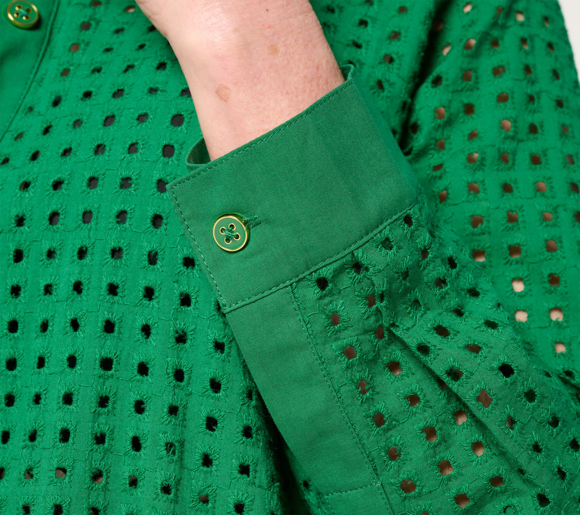 Features: eyelet design, two-ply classic collar, button-front closures, side slits, straight hem, 2-ply solid cuff with button closure
