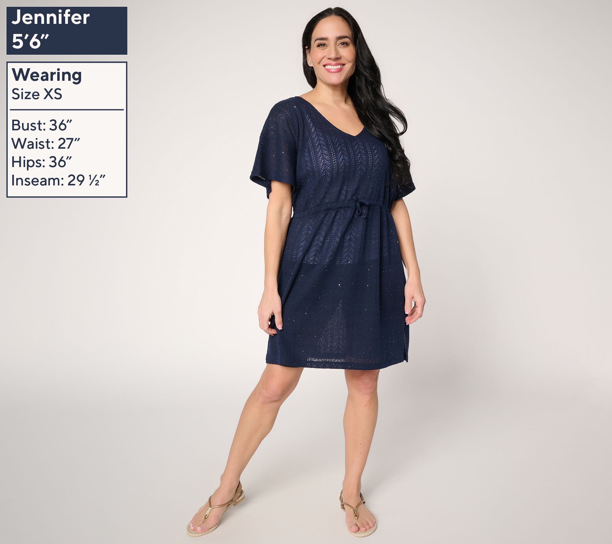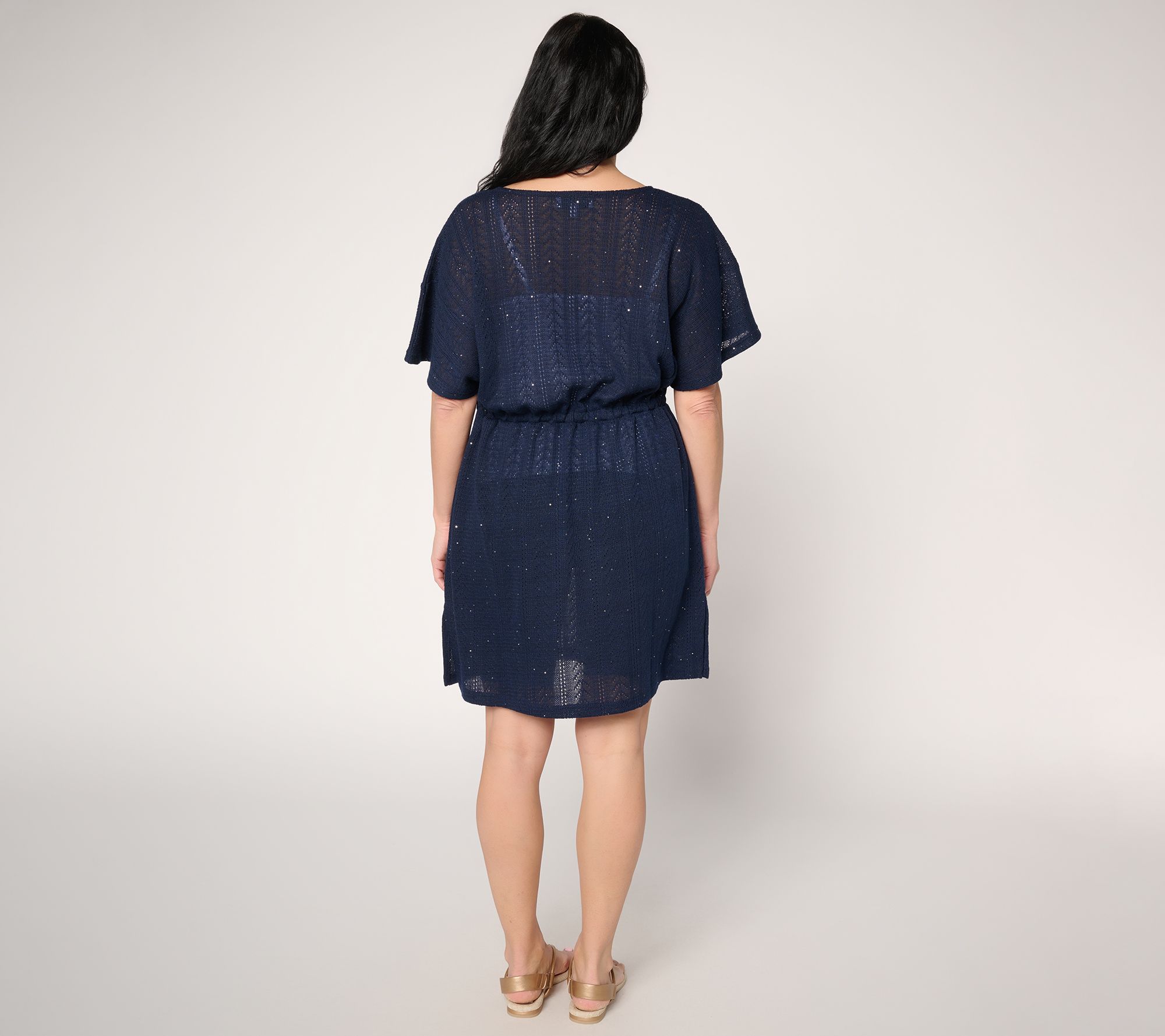 Take your poolside look to the next level of glam with this open-knit cover-up, thoughtfully designed with a drawcord at the front for effortless adjustment. Its generously cut silhouette invites plenty of comfort and ease, whether you're catching ocean breezes or hitting the snack bar between dips. From Susan Graver.