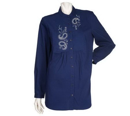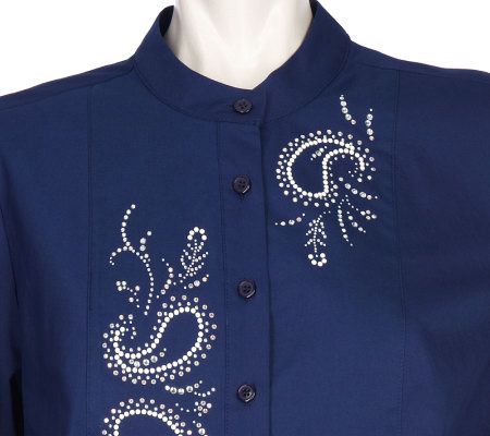 Positively paisley. Add a little sparkle to any ensemble with this alluring long-sleeved stretch cotton shirt. Crafted with a mandarin collar and pleated detail, it's decorated with rhinestones that form a charming paisley accent on the front. From Susan Graver.
