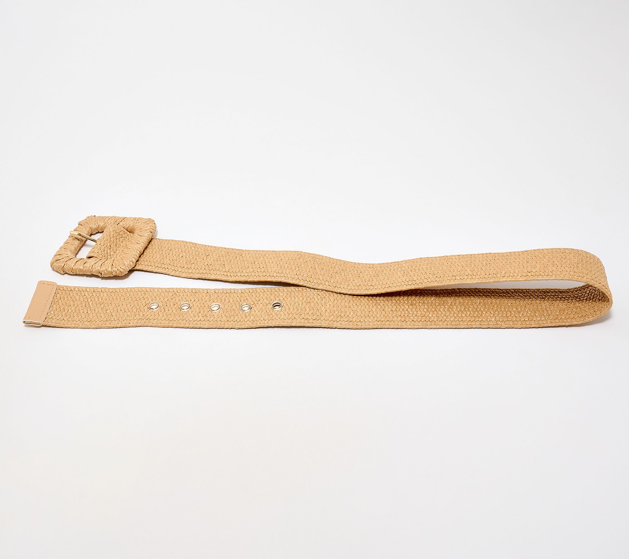 A solid stretch raffia belt with a standout novelty buckle adds effortless polish to everything from flowy dresses to high-waisted pants. Its comfortable textured design with adjustable grommets gives you a tailored look while the faux leather tab at the end adds a modern finish. From Susan Graver.