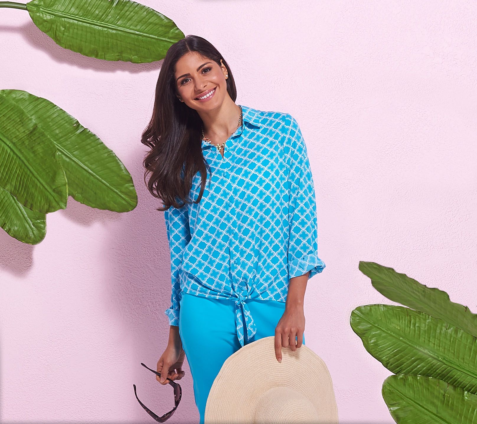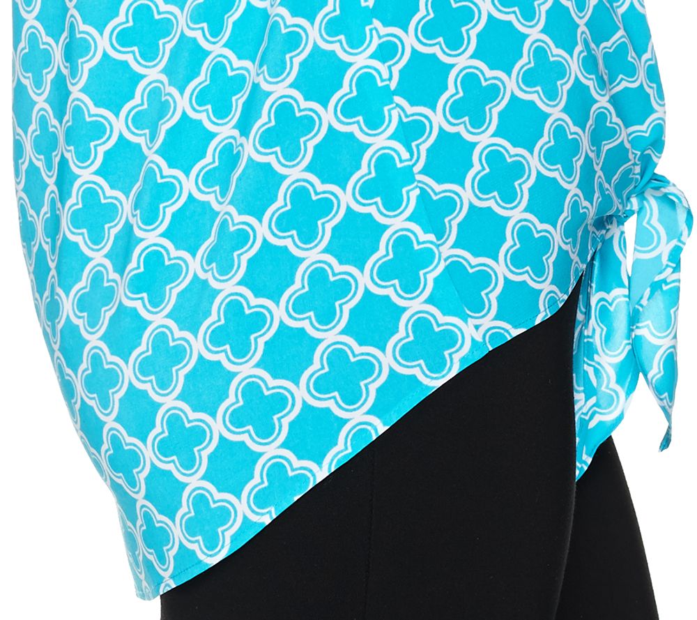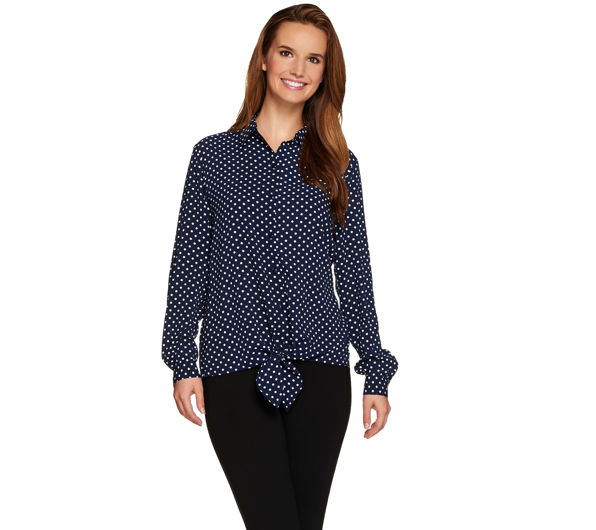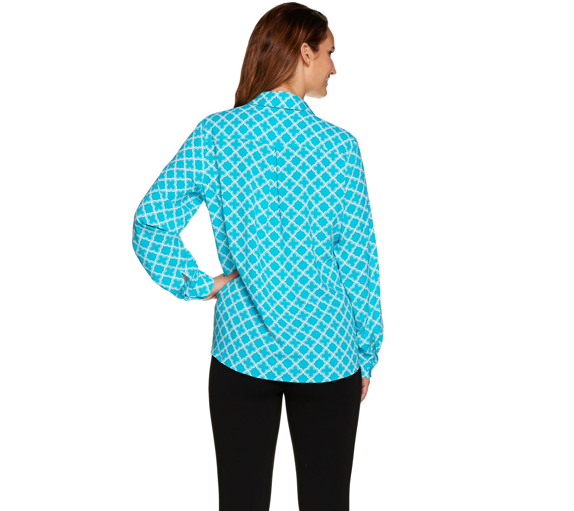 Other fashionable features include a pointed collar, a back yoke with an inverted pleat, buttoned cuffs on the long sleeves, plus just the right amount of stretch for a flattering fit. Choose either a print or a solid to suit your style and let it take you from season to season when worn alone or layered with a classic cardigan. And you can button it up for a professional look without dashing off to the dry cleaners; this soft shirt is machine washable for your carefree convenience. From Susan Graver.