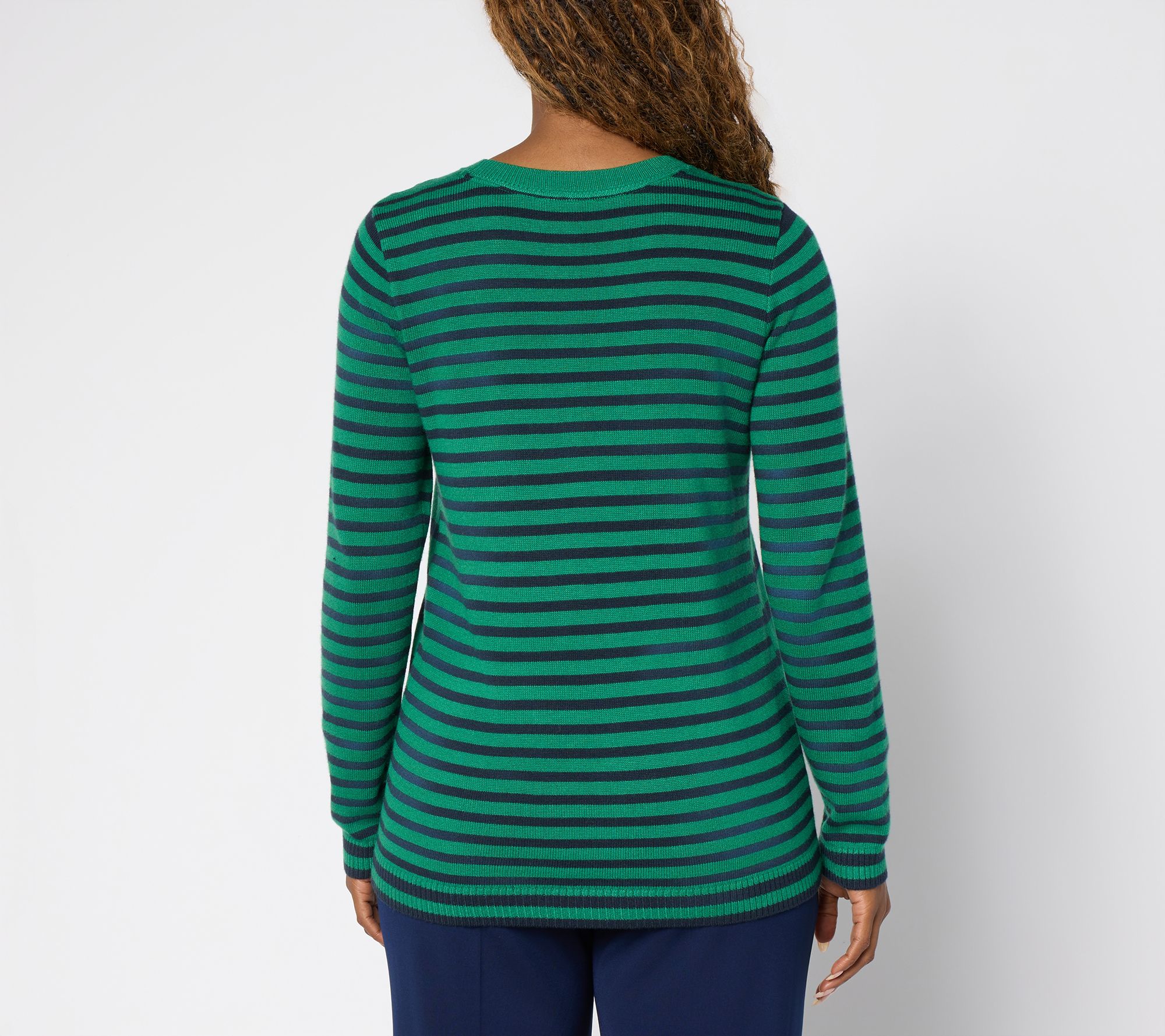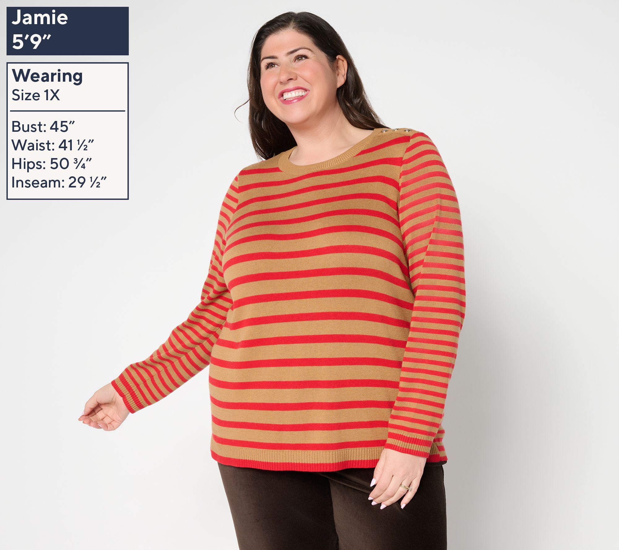 Whether you're meeting friends for lunch or decorating your digs, this striped crew neck sweater brings comfort and elevated-casual style to your wardrobe. The soft knit features ribbed edges for a finished look, while a non-functional shoulder placket with snap accents adds subtle detail. From Susan Graver.