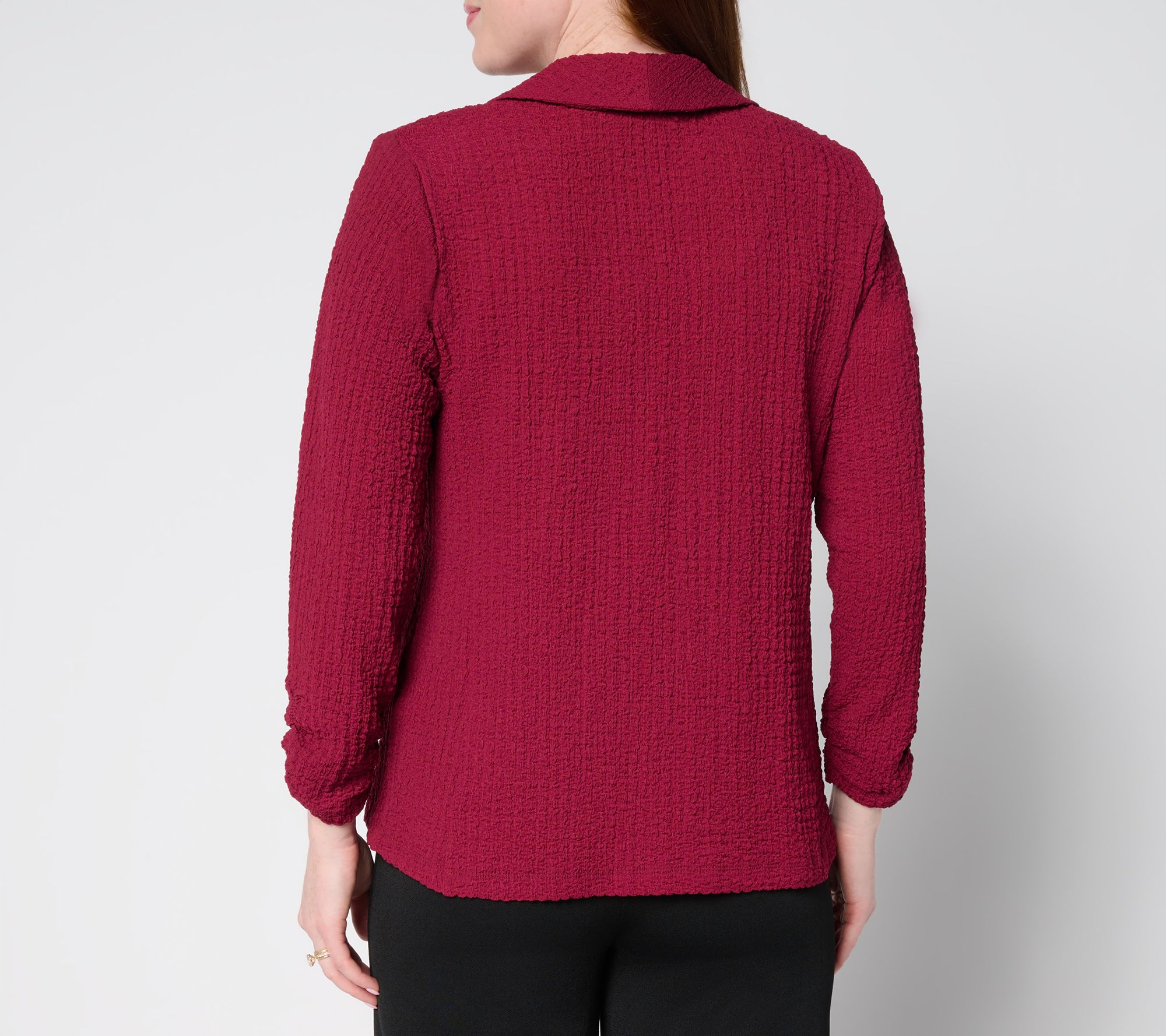 Add instant polish to your Monday-to-Sunday wardrobe with this textured knit cardigan. The shawl collar and single button closure offer a refined finish, while covered shoulder pads and ruched three-quarter sleeves bring subtle structure and style. Layer it over a tee or blouse for workdays, or toss it on with jeans for weekend plans. From Susan Graver.