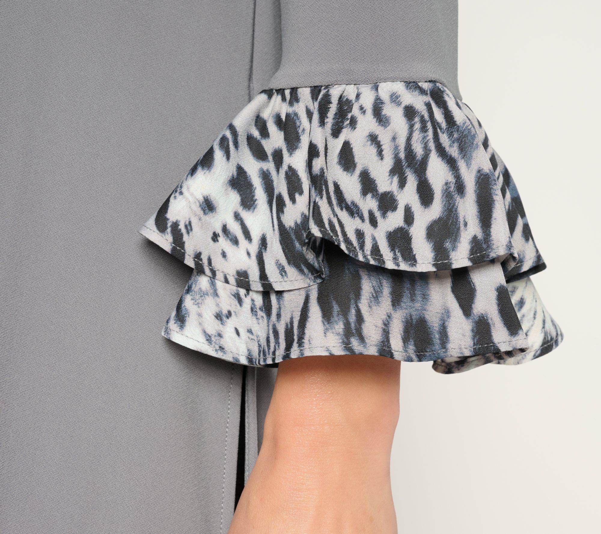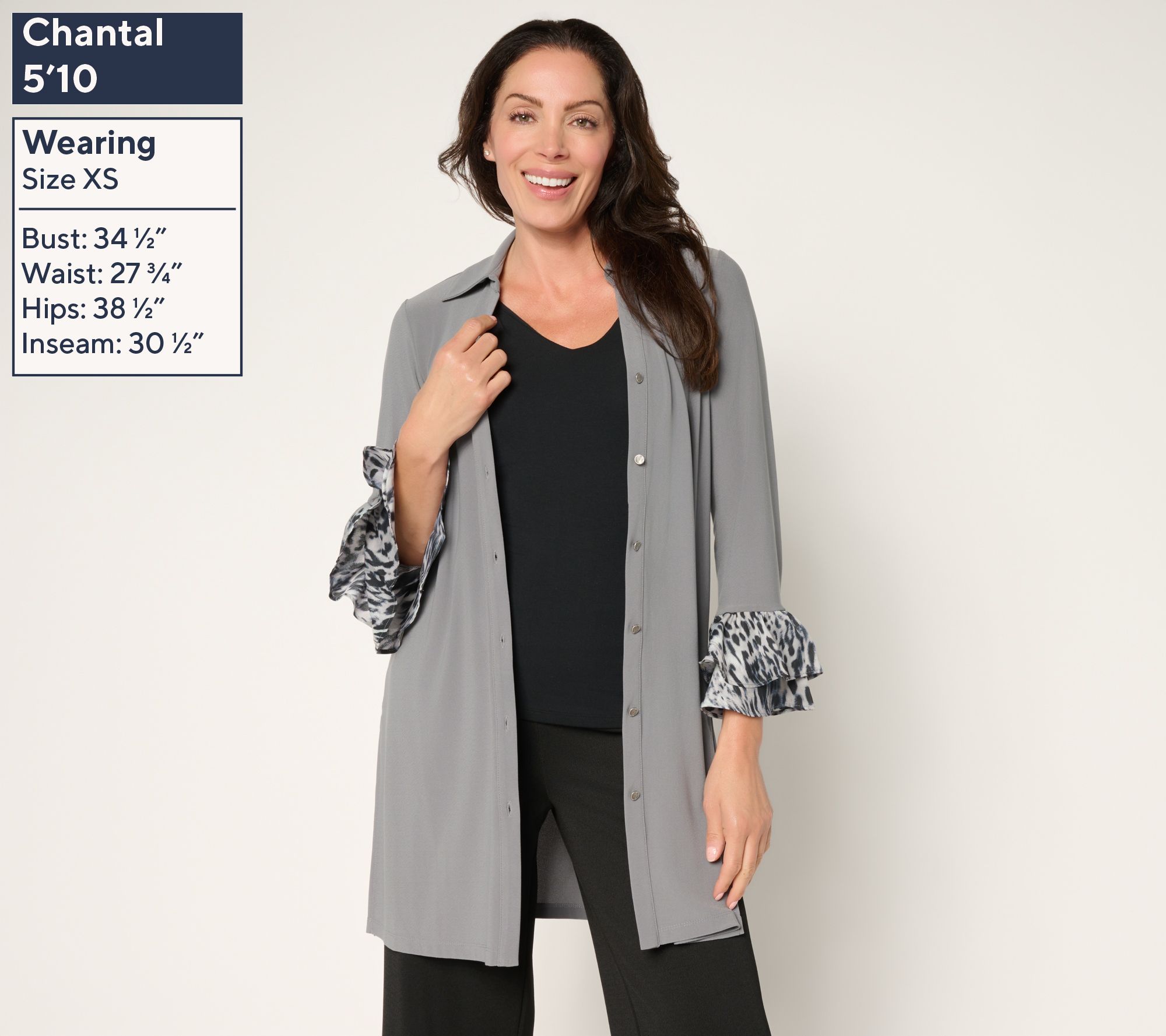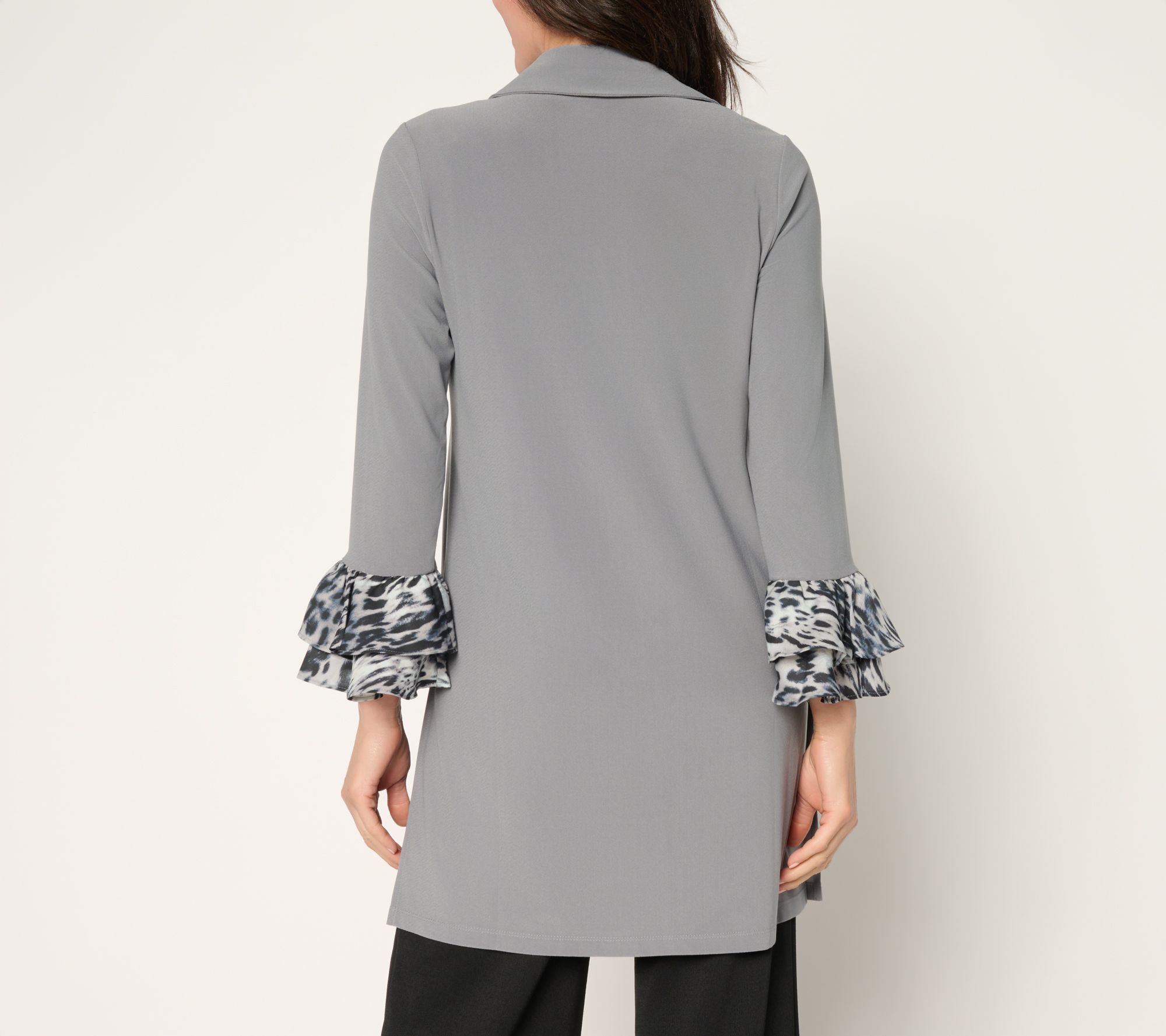• Features: long cardigan, combo printed ruffle cuff detail with two rows of tiered ruffles, center front button opening with self collar and collar band, long sleeves, straight hem, side slits