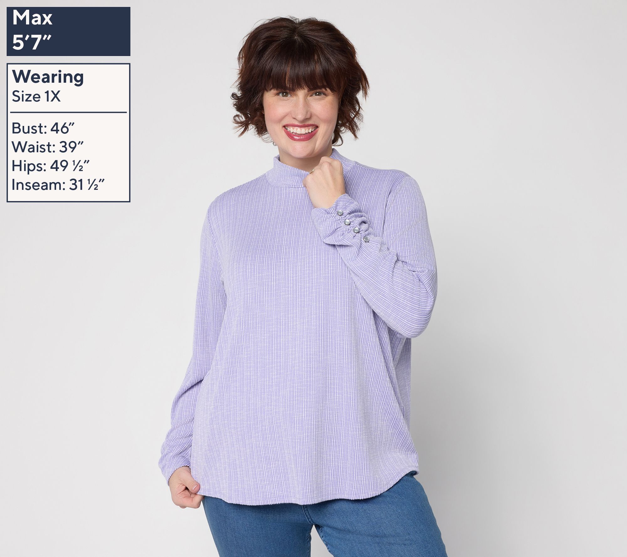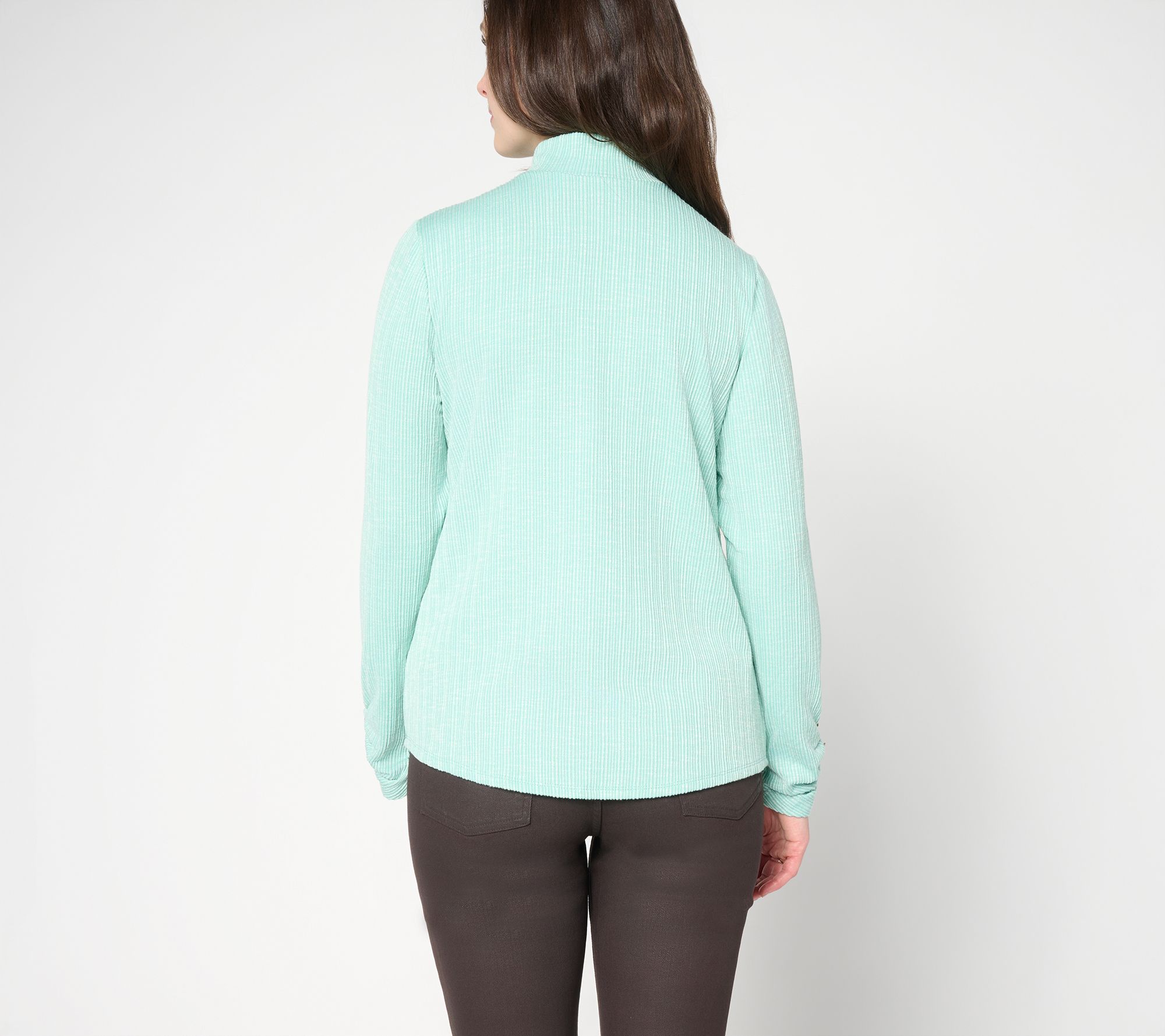 Whether you're heading to work or enjoying a cozy weekend in, this mock-neck top keeps your look polished and comfortable. The subtle textured rib and side ruching on the sleeves offer a modern twist, while the curved shirttail hem softens the silhouette for effortless pairing with jeans or tailored pants. From Susan Graver.