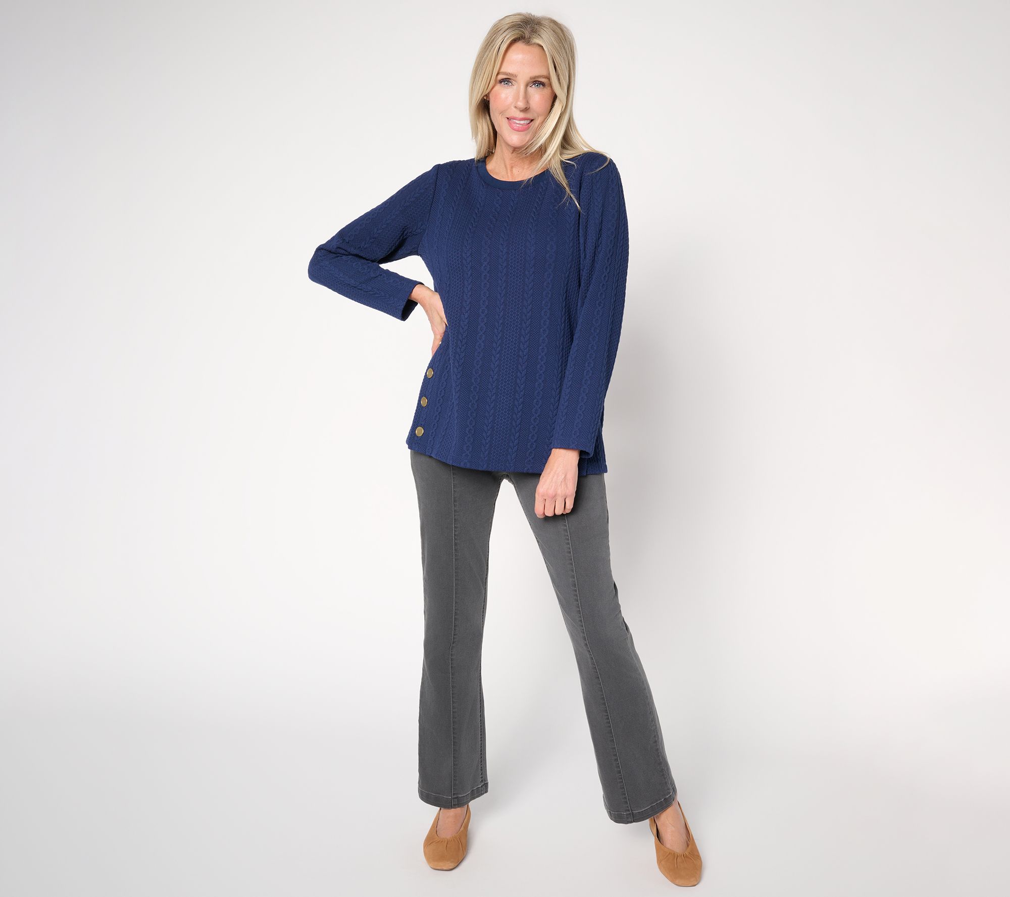 Looking to make a style statement at your next coffeehouse meet-up? The intricate knit detail and front panel accented with functional buttons is the subtle wow that makes this jacquard sweater worth heading out in any weather. (The relaxed fit means there's room for a mini croissant -- or two!) From Susan Graver.