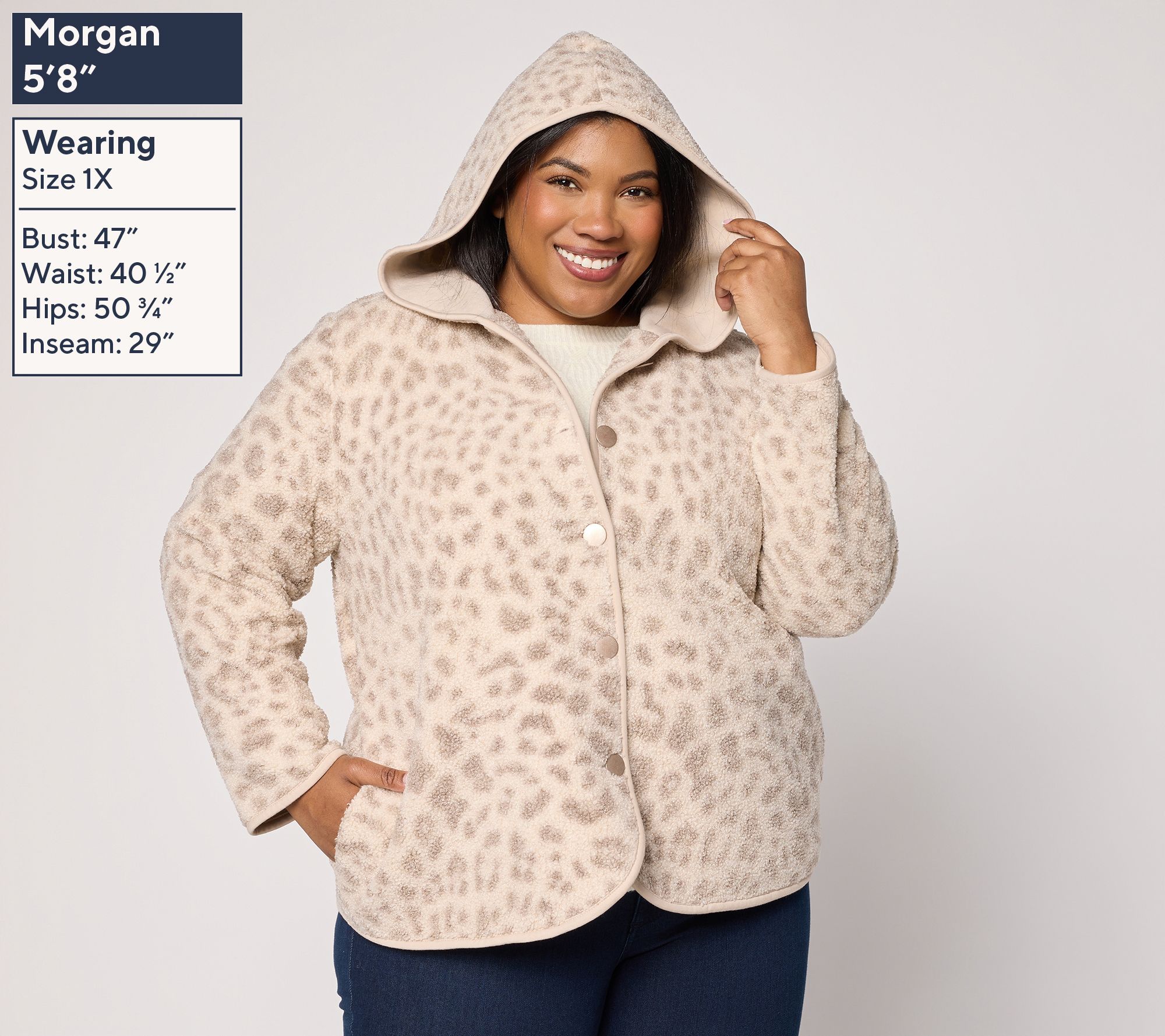 Features: button-front closure, attached hood, long sleeves, side-seam pockets