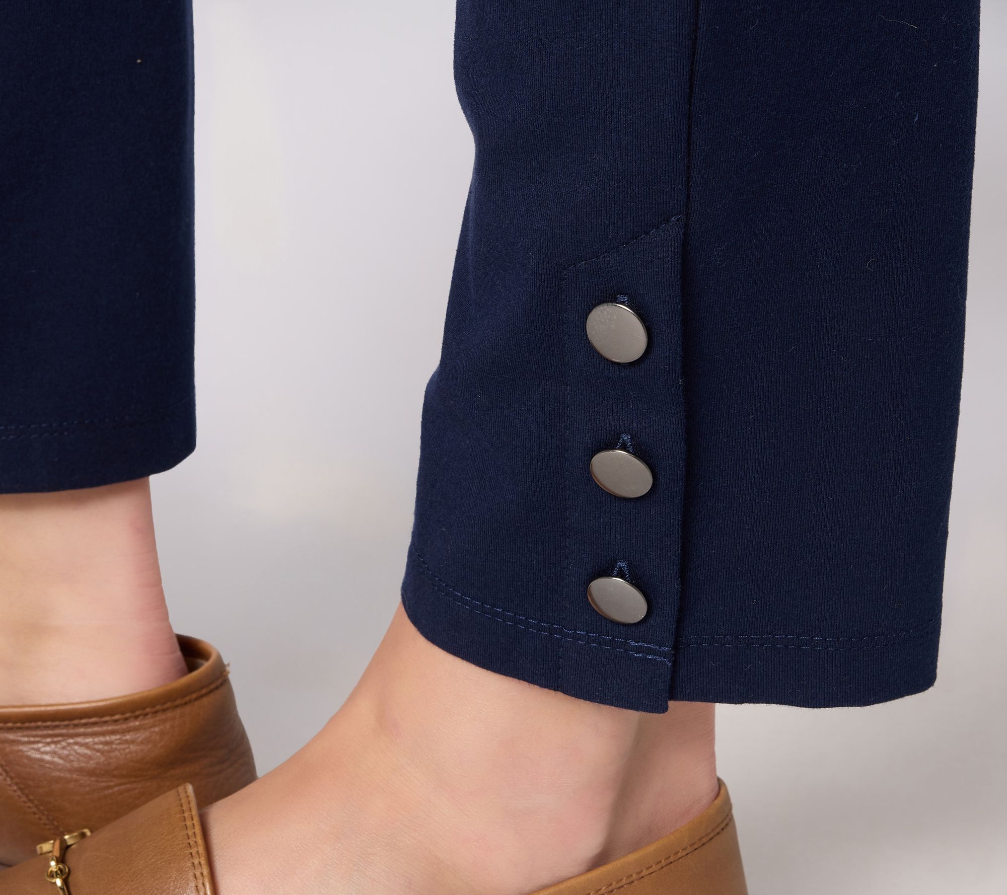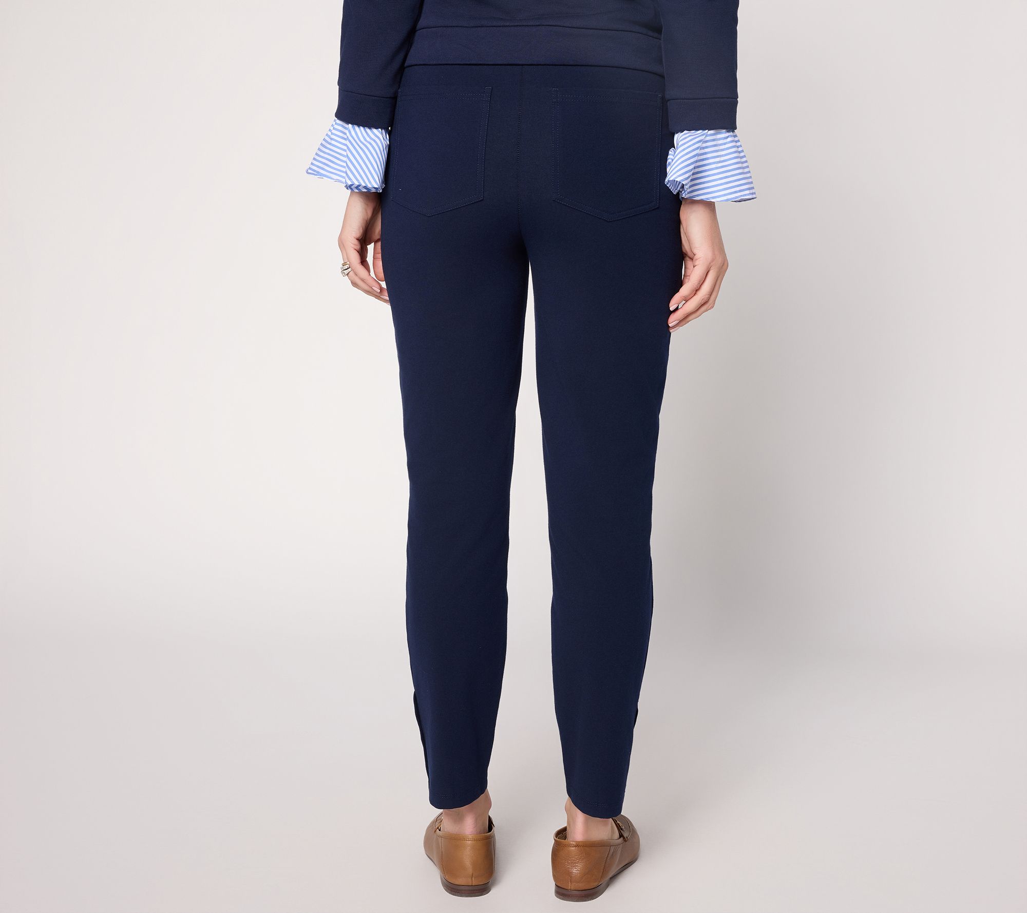 Ready for afternoon strolls or casual meetings, these ankle pants add effortless polish with a slim-leg fit and smooth pull-on waistband. Soft cotton blend stretch moves comfortably from day to night, while rear patch pockets and a trio of buttons on the side vents elevate the look. Style these pants with loafers or heels for an easy wardrobe update. From Susan Graver.
